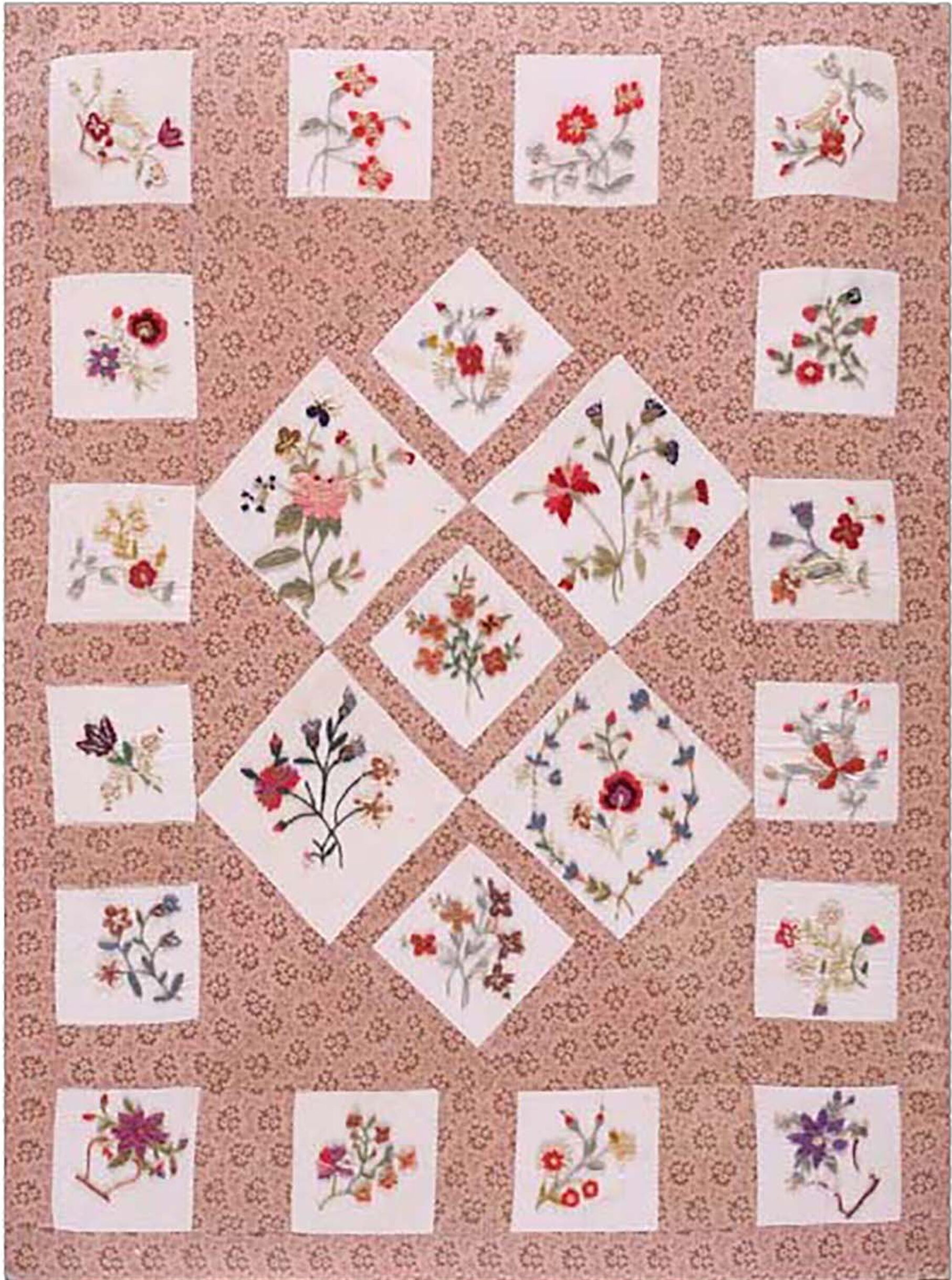 The field is composed of a repeating grid of small, embroidered-style floral vignettes set against a subtly patterned dusty rose ground. These individual panels—some square, some diamond-shaped—create a dense, captivating surface, resulting in an effective allover rugs design that minimizes negative space and maximizes visual interest.