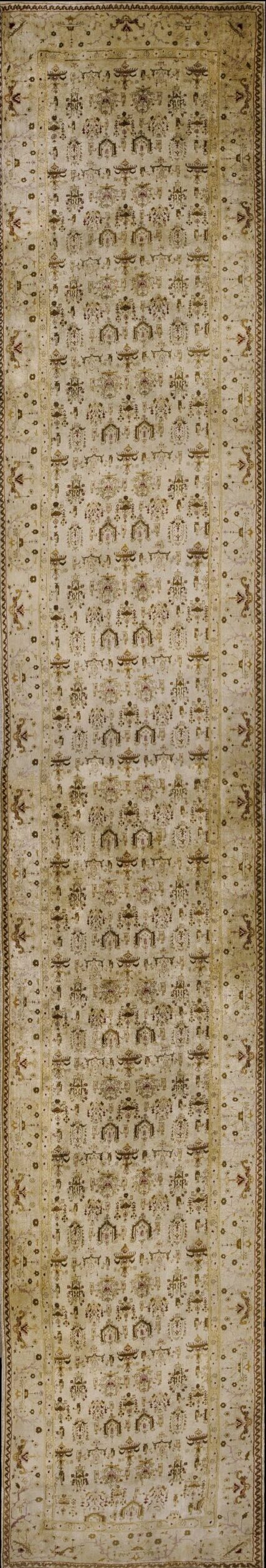 Antique Oversized Agra Indian Geometric Knotted Rug, Country of Origin: India, Circa Date: 1870s. This exceptional piece from the late 19th century showcases the refined weaving traditions of Indian rugs. Its elongated, narrow format suggests it was originally commissioned for a grand estate or palace corridor, demanding a level of monumental scale rarely seen.