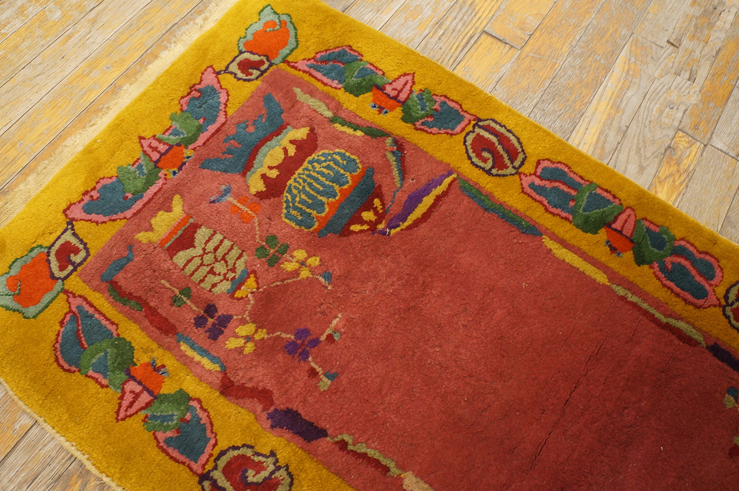 Antique Rectangle Chinese – Art Deco Small Scatter Size 1920s Wool Knotted Rug, Country of Origin: China, Circa Date: 1920s. This vibrant piece exemplifies the bold aesthetic shift seen in antique rugs during the early 20th century, merging traditional Eastern iconography with the geometric sensibilities of the West.
