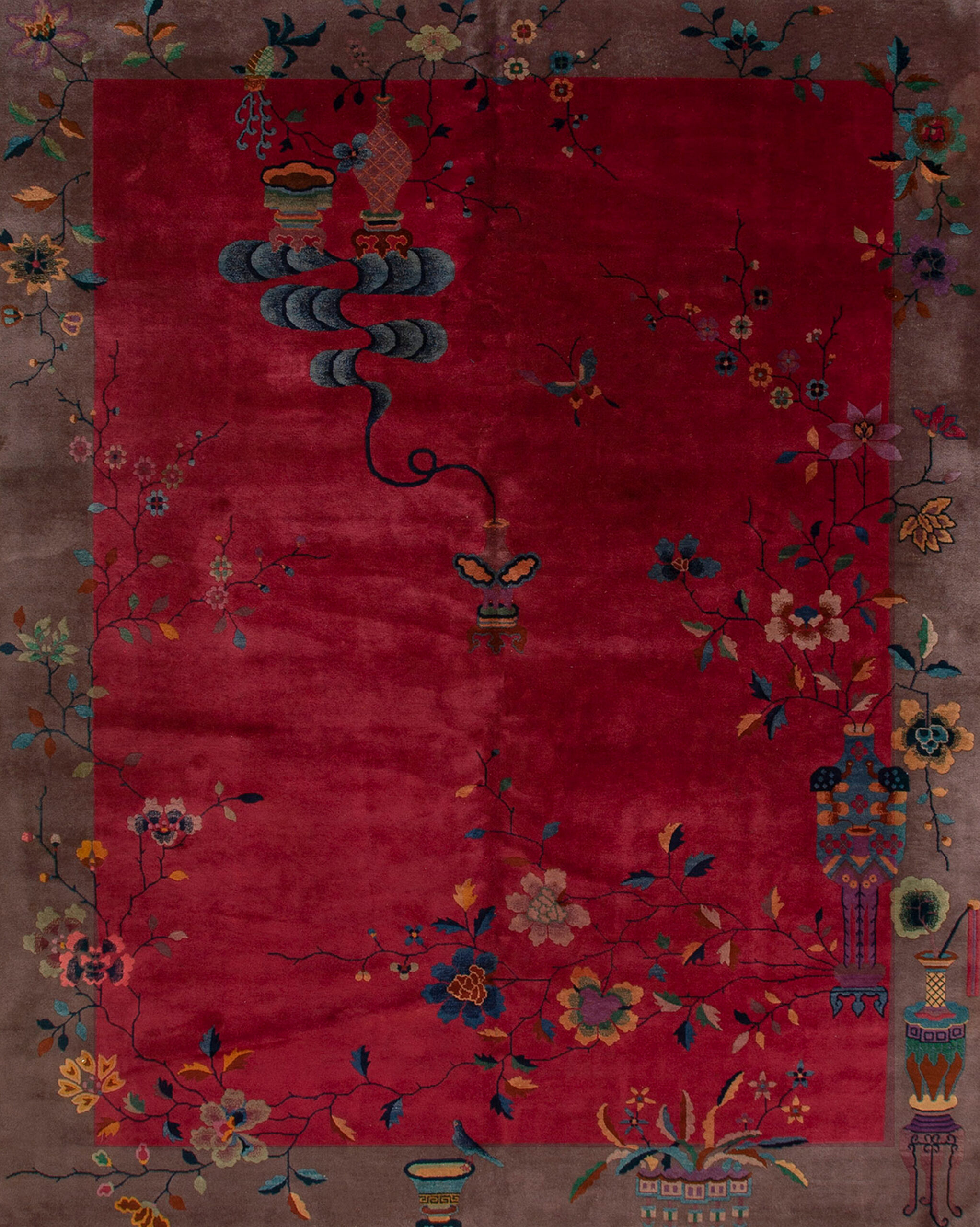 Intricate floral sprays, stylized butterflies, and symbolic vases are scattered across the field and along the contrasting taupe border. The composition is deliberately asymmetrical, utilizing negative space and high-contrast color blocking to achieve a dynamic, modern sensibility while retaining the traditional symbolism of prosperity and longevity.