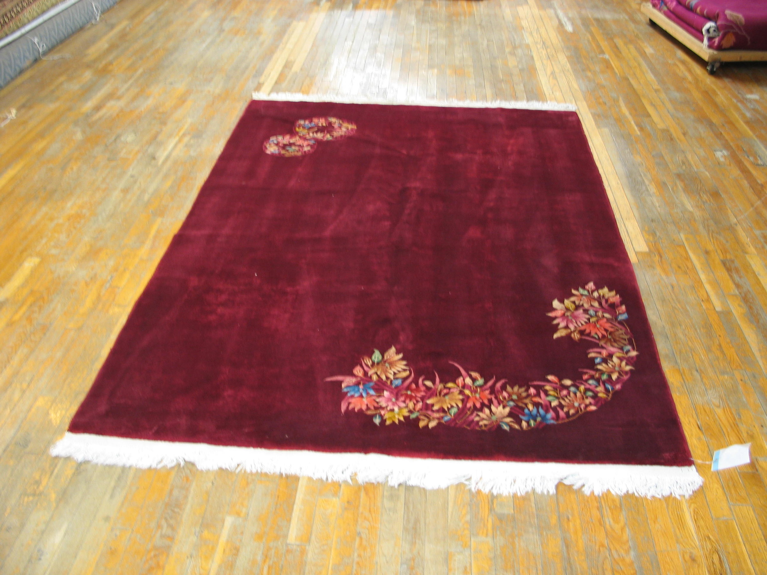 The primary field is dominated by a rich, velvety claret hue, providing a dramatic backdrop for the subtle, multi-hued accents. While the title notes a coral element, the overall saturation leans toward a deep burgundy, a sophisticated palette choice common among high-quality coral color rugs from this period. The plush wool pile enhances the depth and luxurious texture of this striking color.