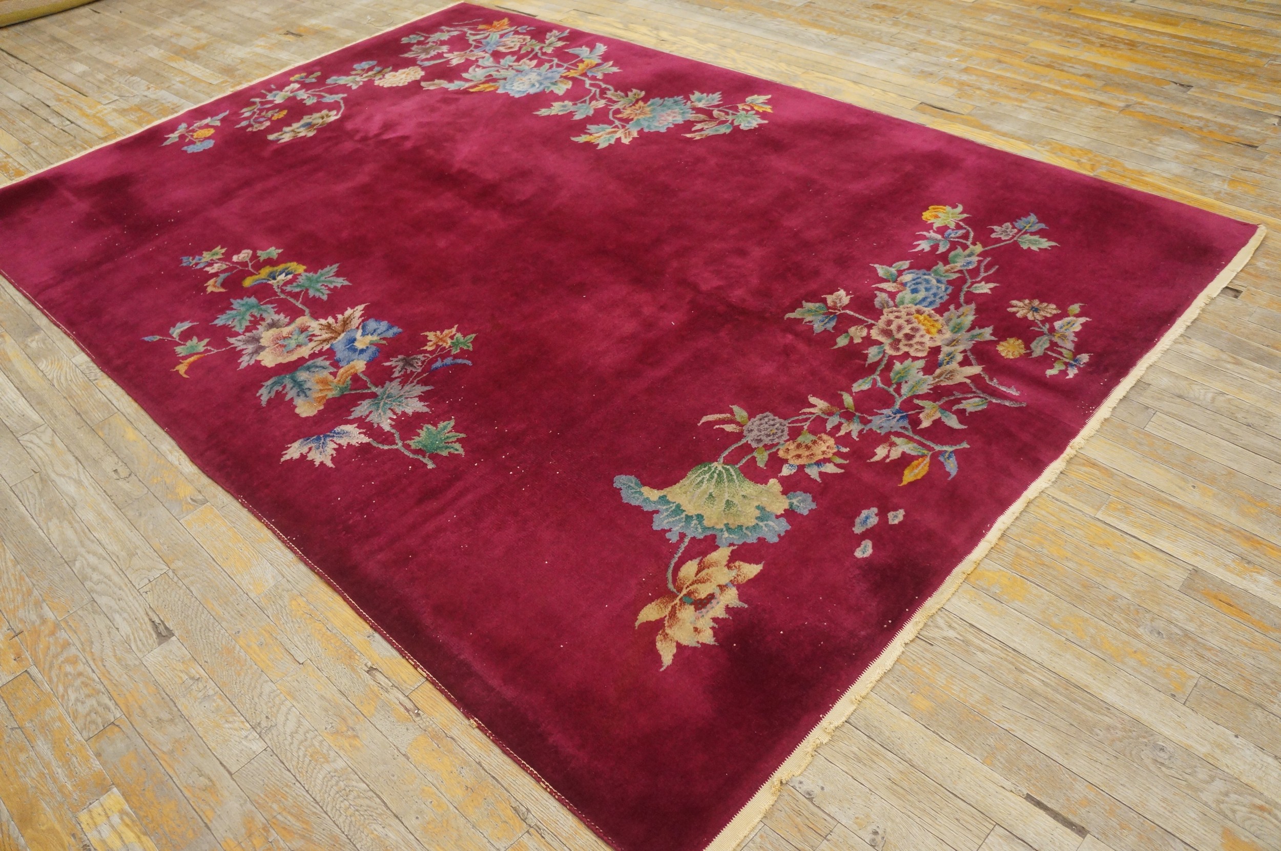Characteristic of the finest 1930s Chinese weaving, the design employs an open, asymmetrical composition. Delicate, meandering branches bearing peonies, chrysanthemums, and maple leaves emerge from the corners, floating gracefully against the solid ground. This restrained use of pattern elevates the piece beyond standard antique rugs, showcasing the transitional aesthetic between traditional Chinese symbolism and Western Art Deco minimalism.