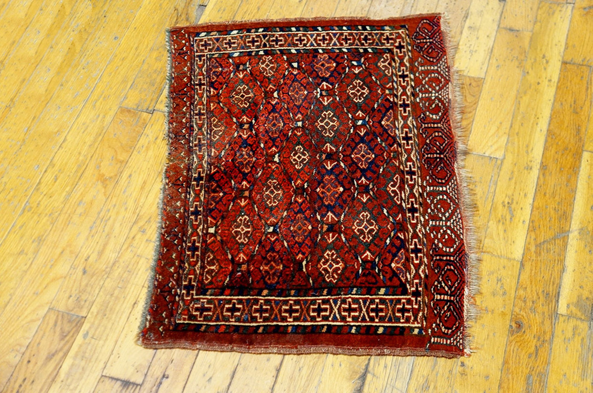 While many Turkmaan pieces were large tent components, this particular piece is presented in a highly desirable small scatter size. Its robust construction and tightly woven pile suggest it may have served as a prayer rug or a specialized storage bag face, offering a tangible connection to the daily life of the nomadic people who created it.