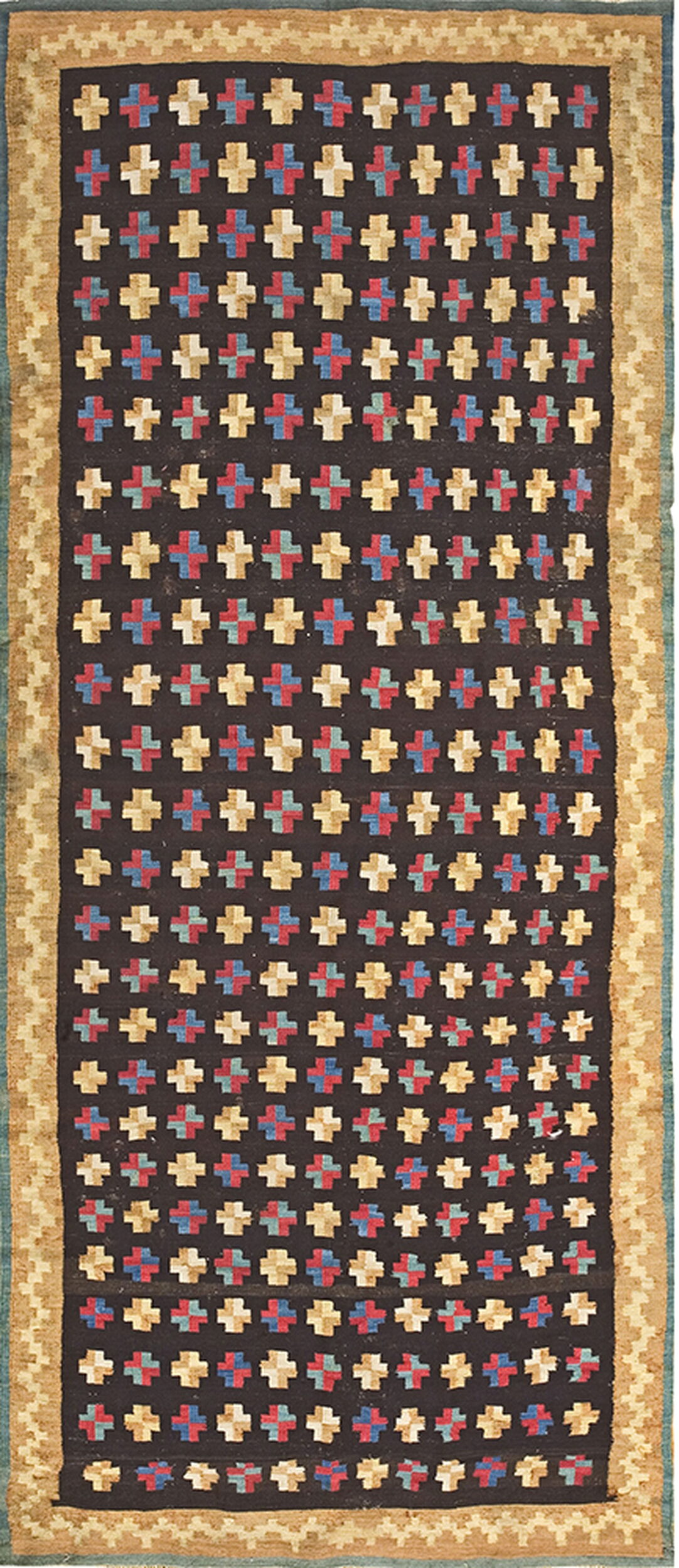 The dramatic contrast is achieved through the use of a rich, near-black or deep brown field, which serves as a striking backdrop for the vibrant, stylized cross-motifs. These geometric elements are rendered in primary hues of crimson, azure, and pale gold, lending the piece a sophisticated, yet lively, character.