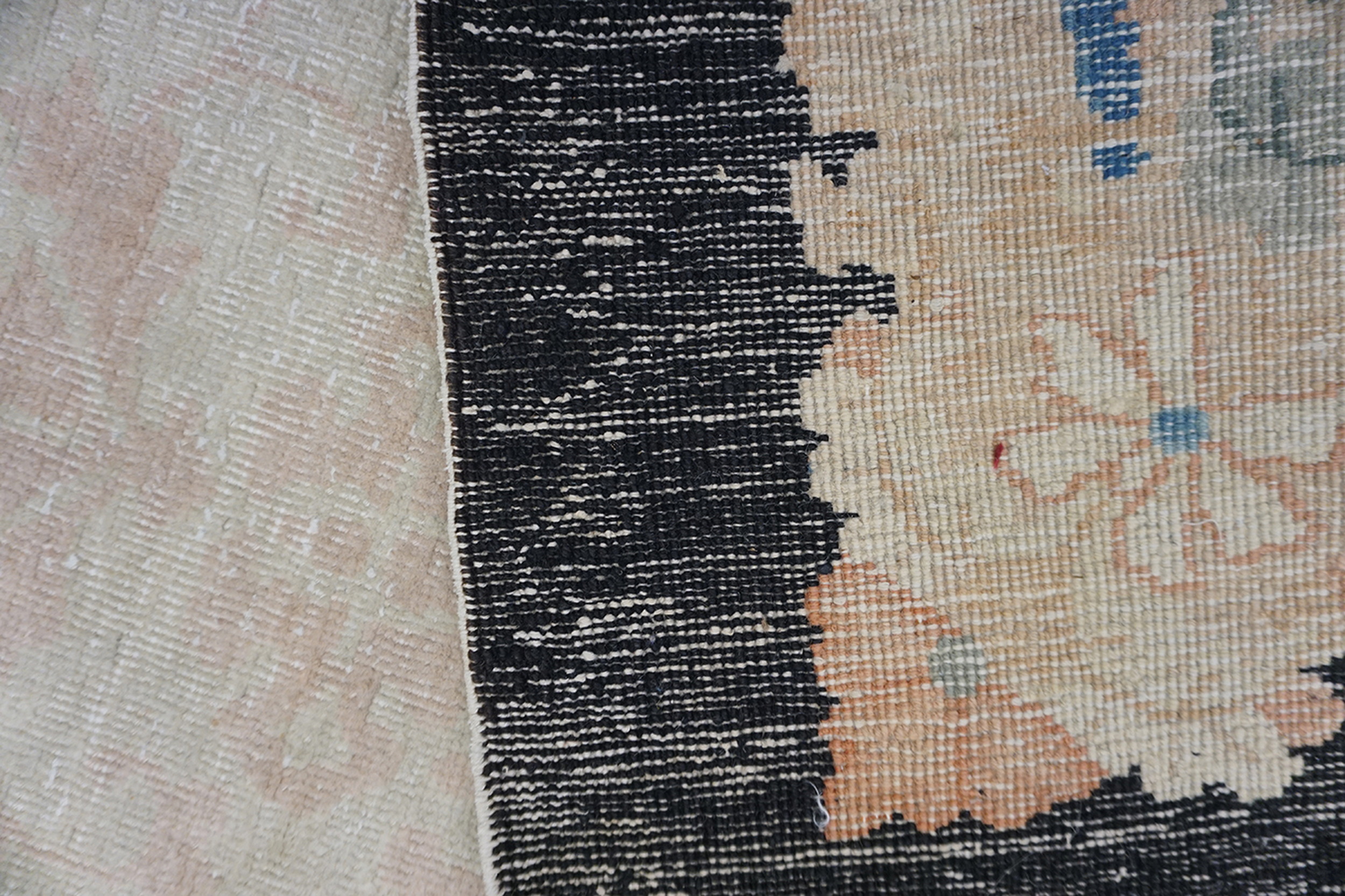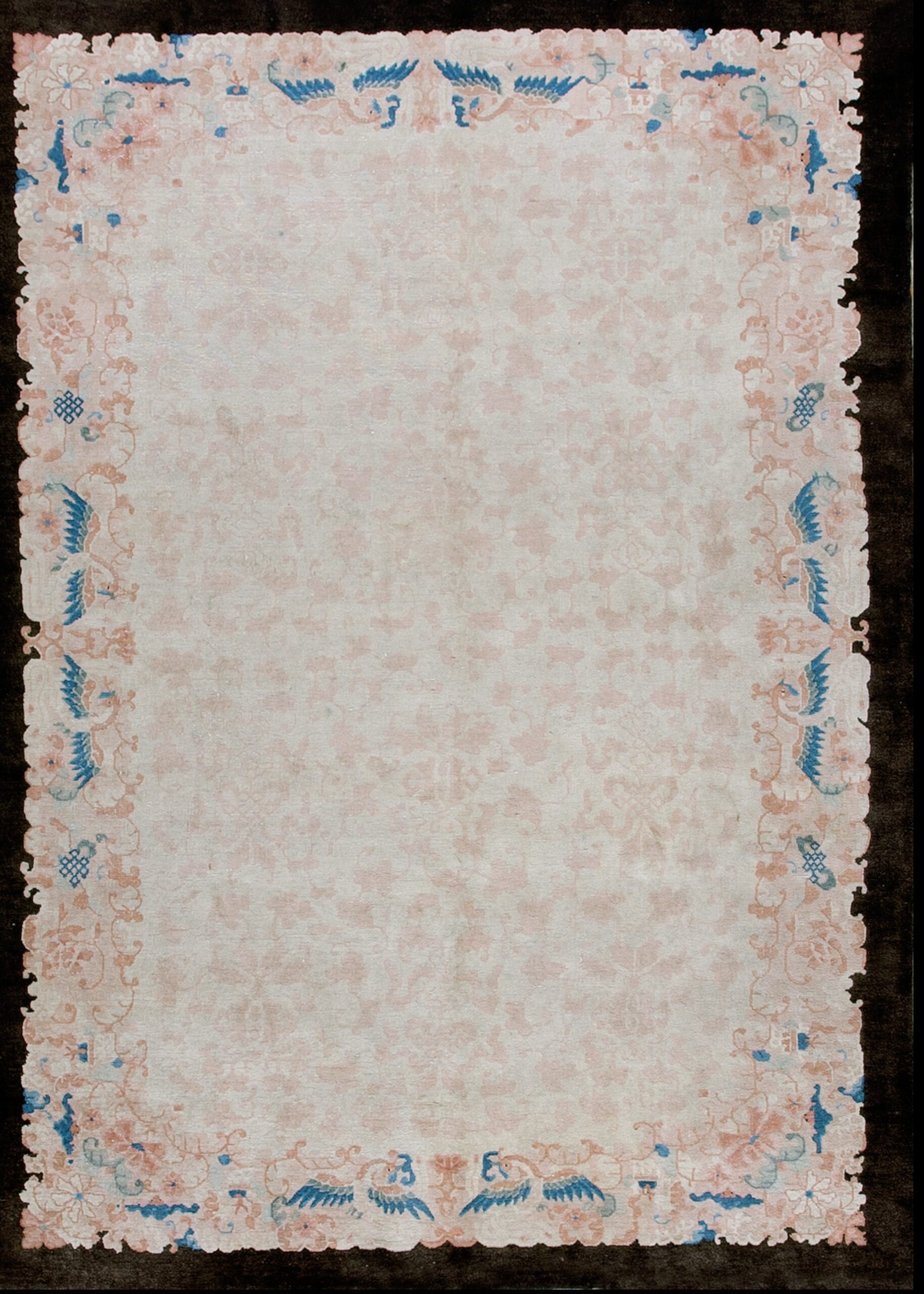 The delicate palette is defined by a central field of ivory beige cream white, providing a luminous backdrop for the subtly rendered design. The soft, faded hues of rose and pale blue in the secondary motifs speak to the passage of time and the gentle patina acquired over a century of careful preservation.