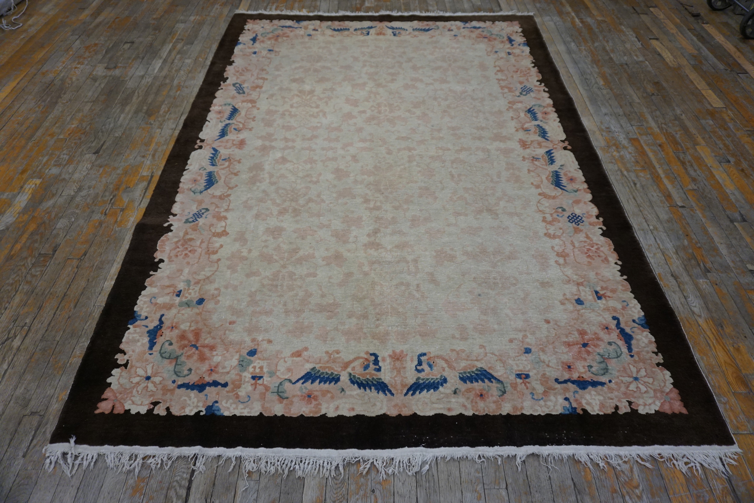 Framed by a dramatic, dark brown border featuring stylized bird and floral cartouches, the rug achieves a striking contrast against the pale field. Its substantial dimensions qualify it as a true room size piece, ideal for anchoring a formal living space or grand dining hall with period elegance.