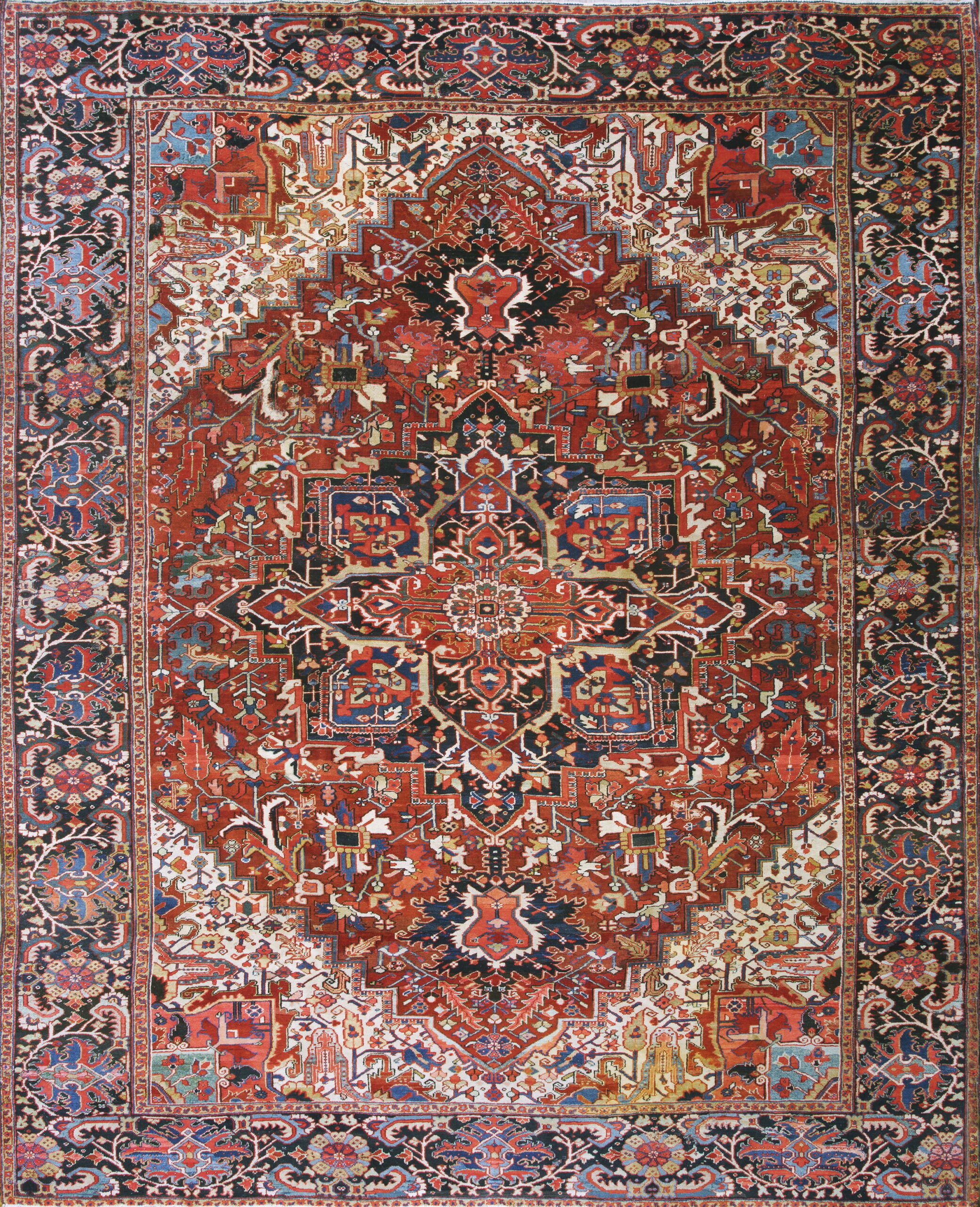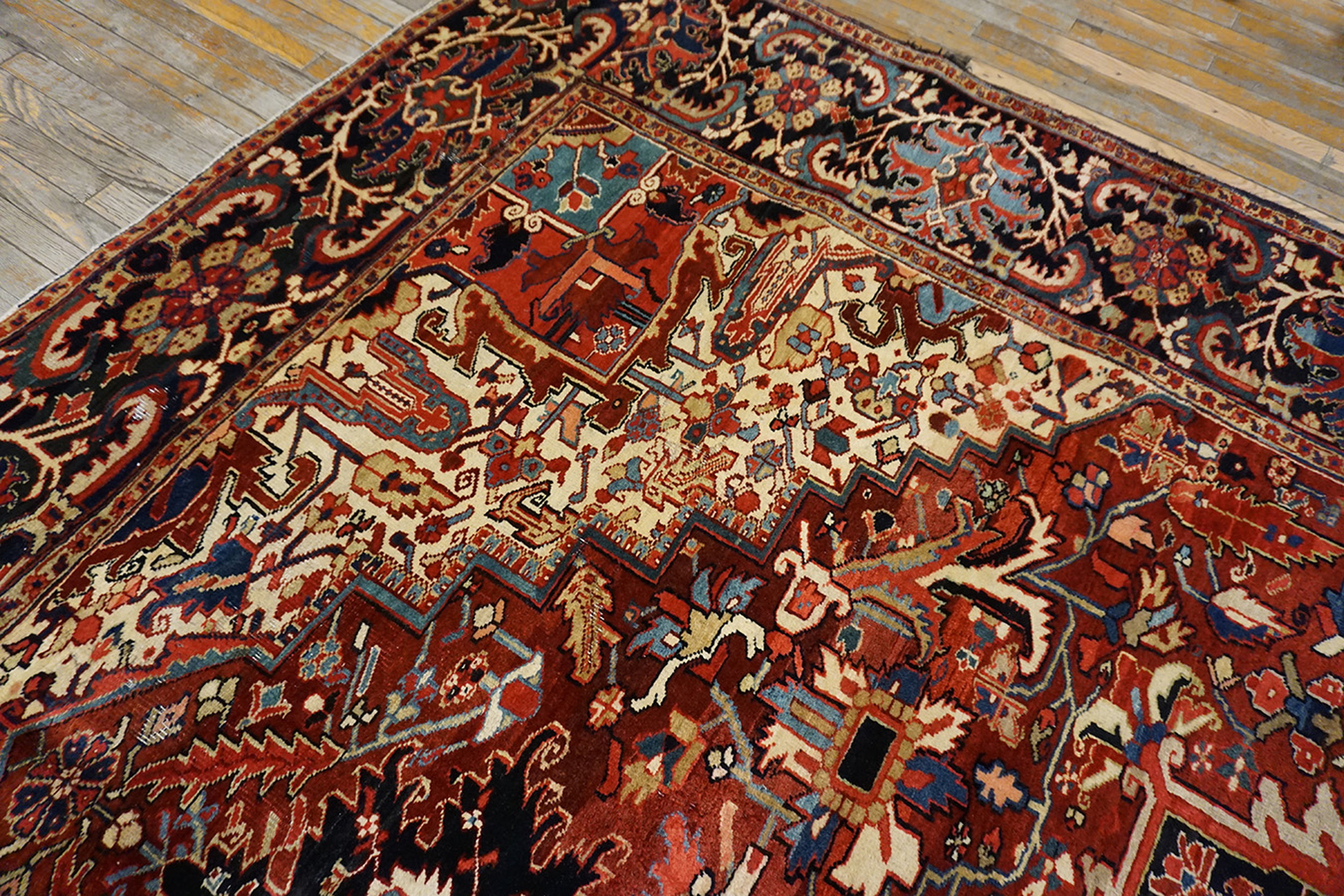 Heriz carpets are celebrated for their distinctive, highly stylized patterns, which translate traditional curvilinear motifs into a bold, angular vernacular. The powerful, architectural structure of this piece emphasizes the strong geometric rugs tradition, utilizing stepped outlines and defined compartments that give the design immense clarity and impact.