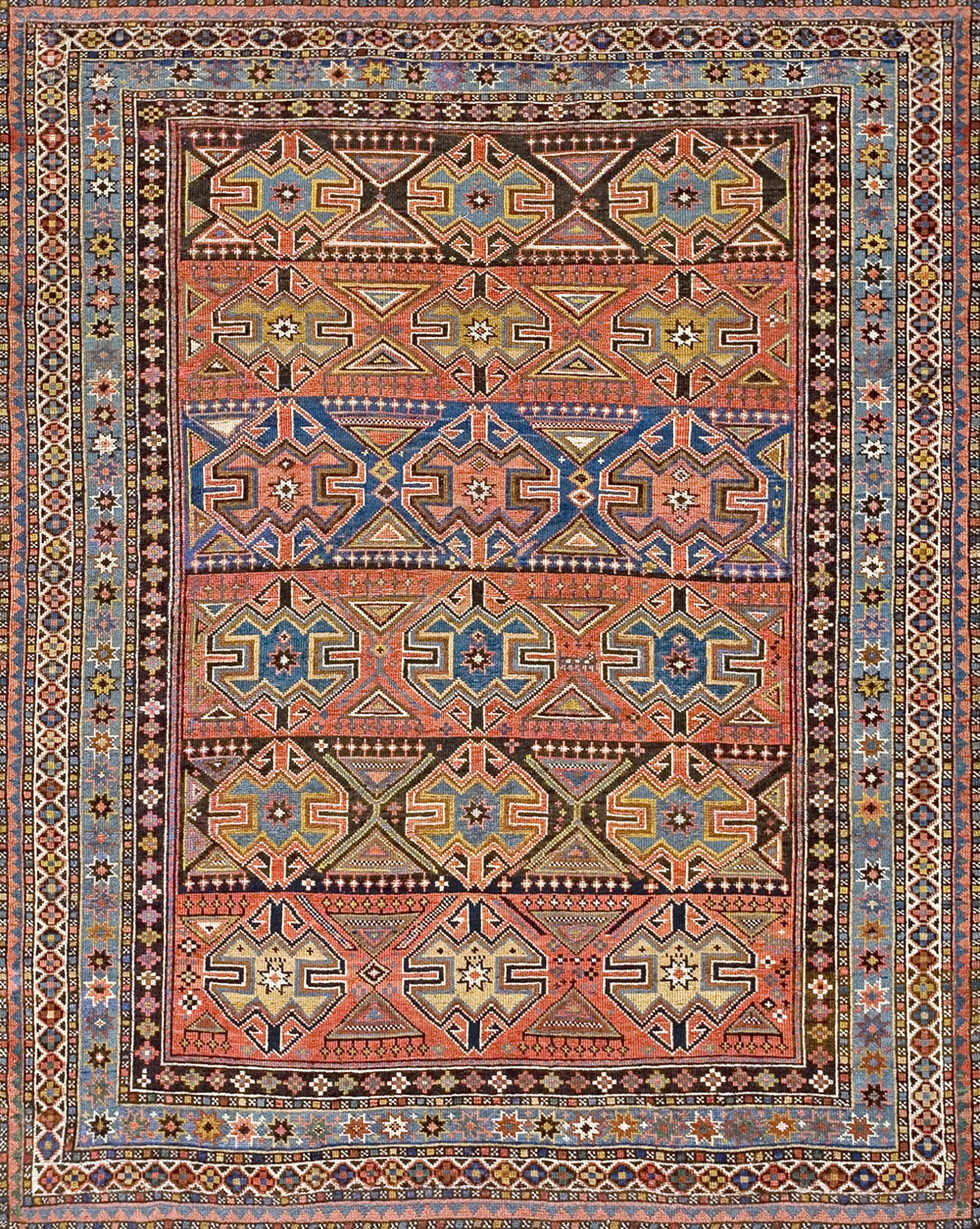 A striking palette of warm terracotta and deep madder red serves as the primary ground color, sharply contrasted by brilliant accents of sky blue, indigo, and oxidized black-brown. The use of highly durable, naturally dyed wool and the dense knotting structure confirm the high standards of traditional Caucasian rugs, prized for their robust construction and graphic intensity.