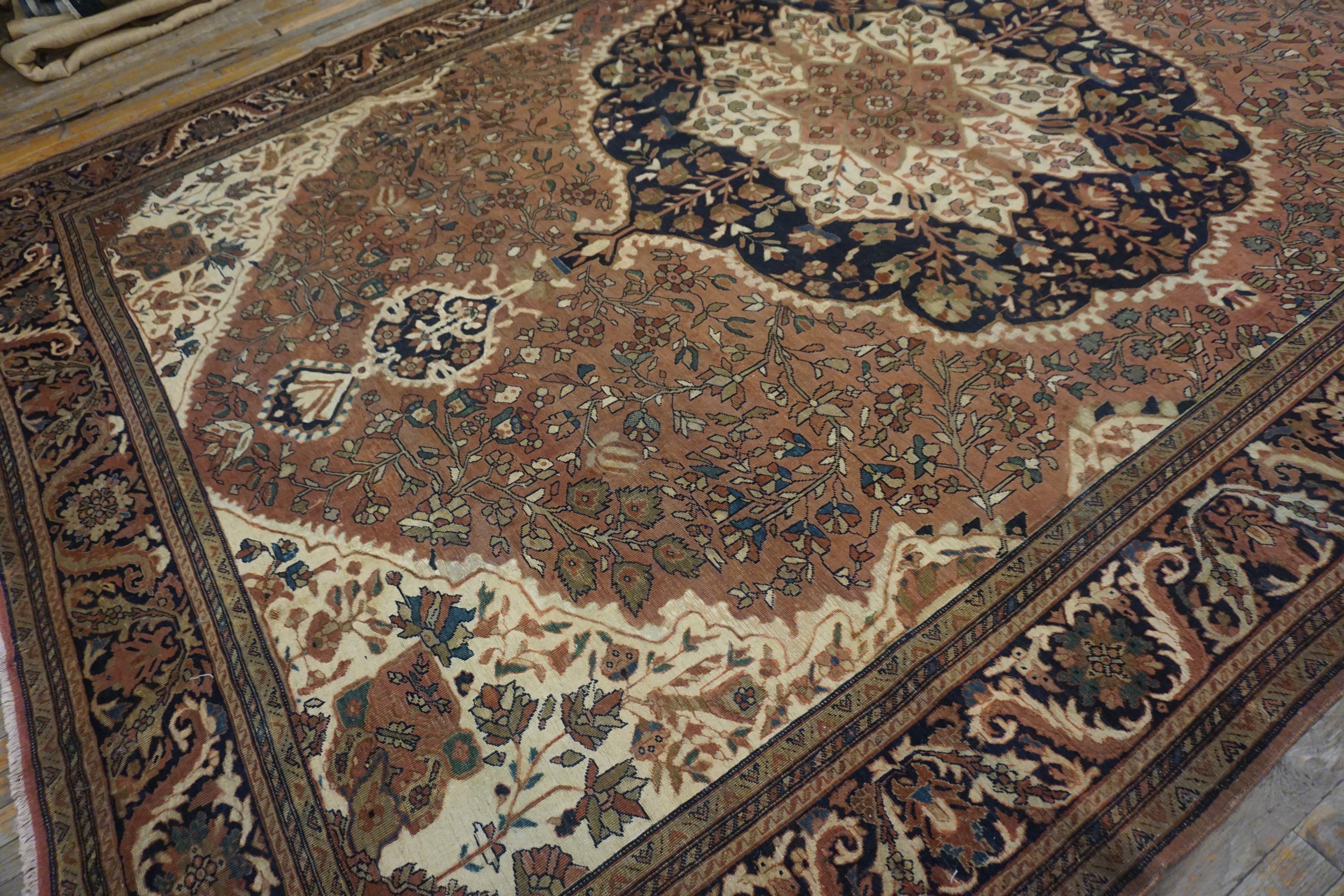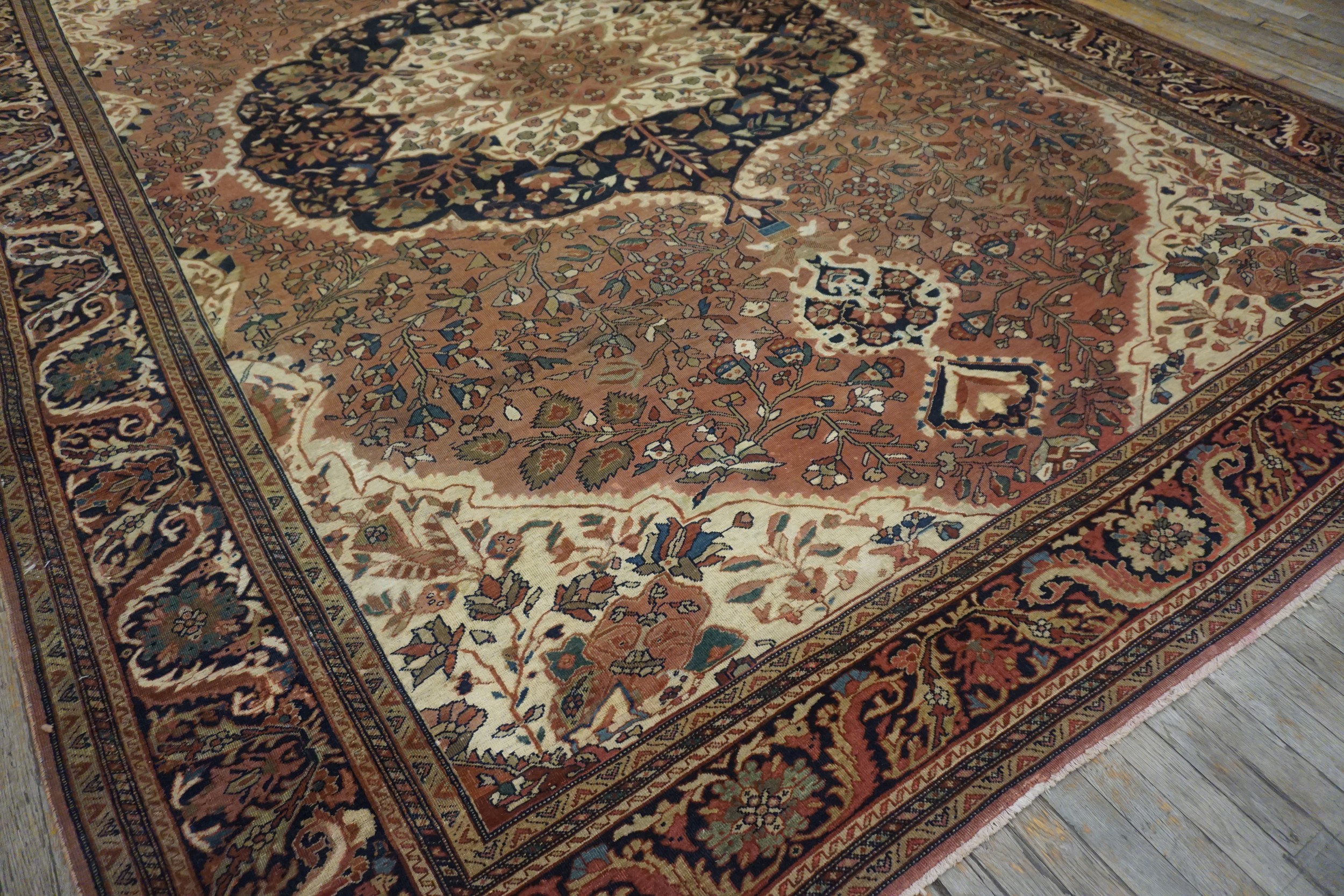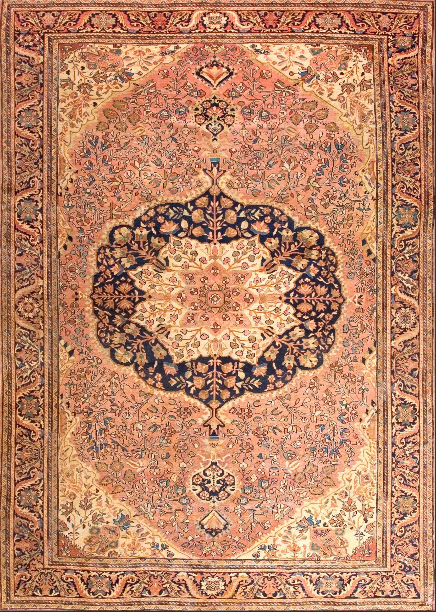 While the structure is technically centered by a prominent lobed medallion, the density of the surrounding floral tracery ensures the pattern reads as a cohesive, unified field. This grand scale piece is perfectly suited for defining a major living area or dining space, classifying it among the finest room size rugs available from this highly sought-after period.
