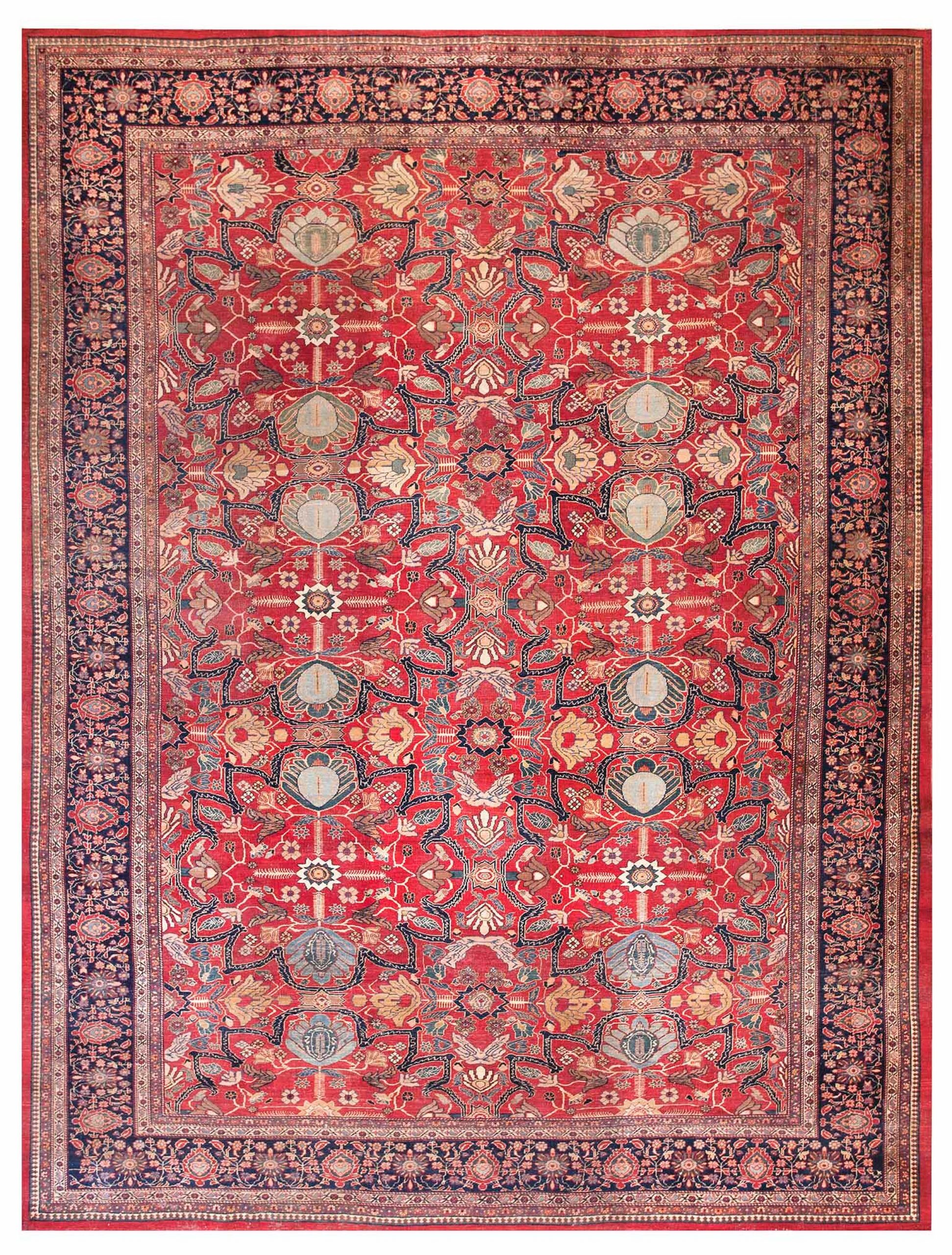 A dramatic contrast is achieved by the wide main border, rendered in deep indigo blue, which frames the fiery field. This border features reciprocating cartouches and rosettes, meticulously drawn to complement the central design. The overall aesthetic is one of grandeur and formality, perfectly embodying the enduring appeal of classic traditional rugs crafted for aristocratic homes.