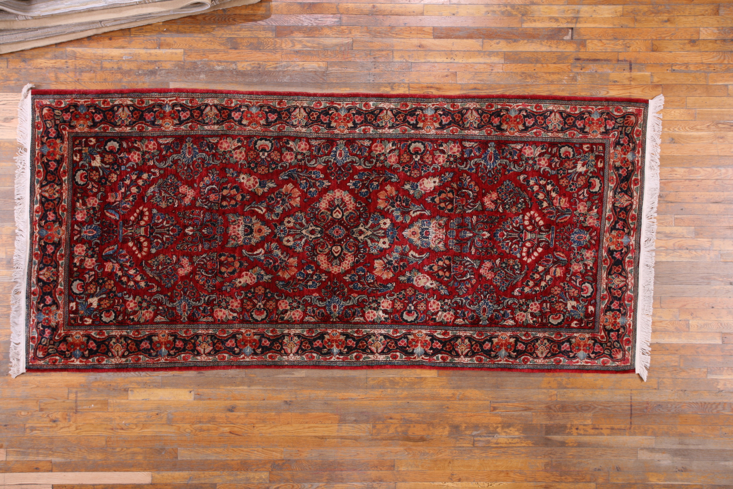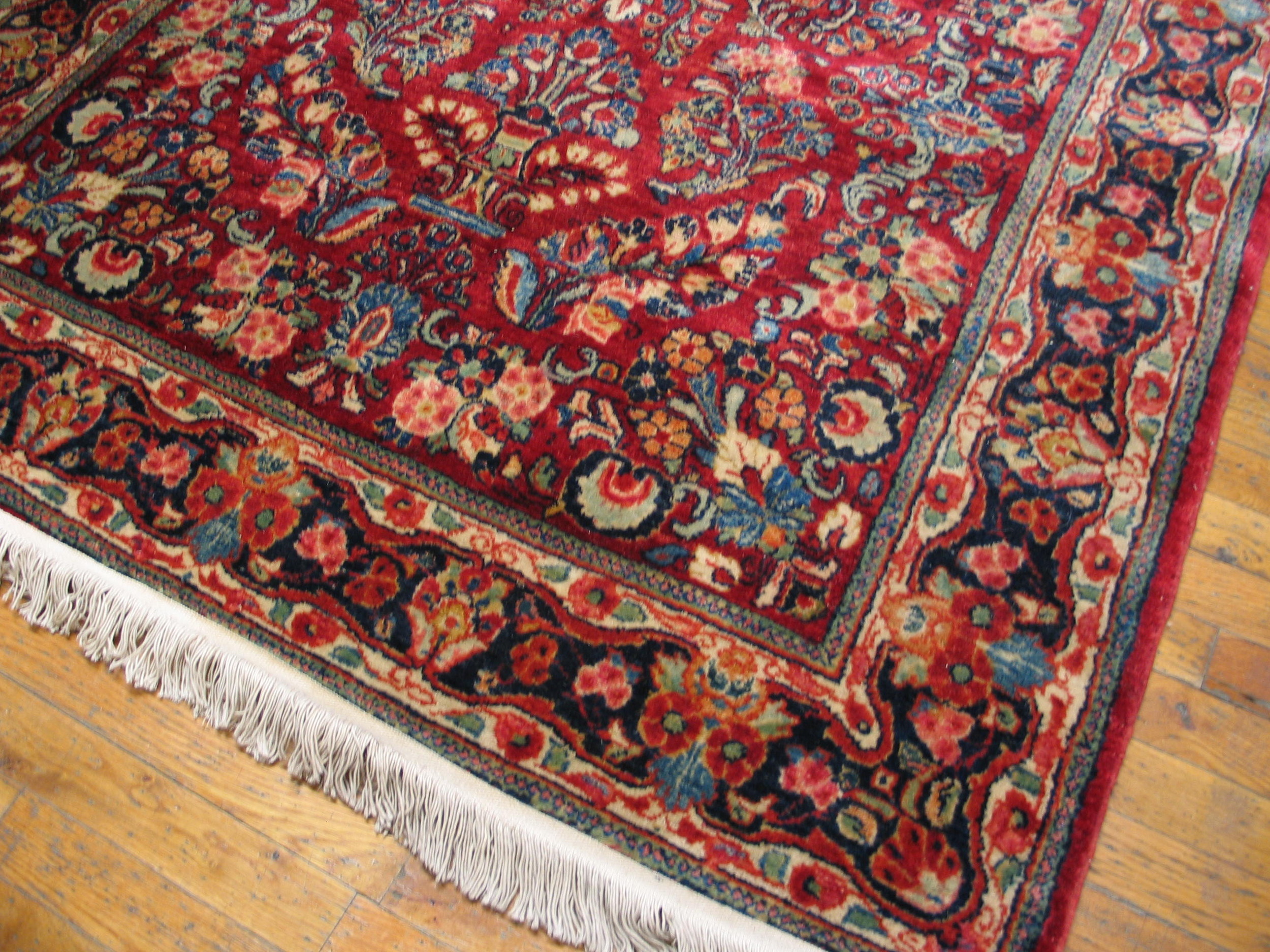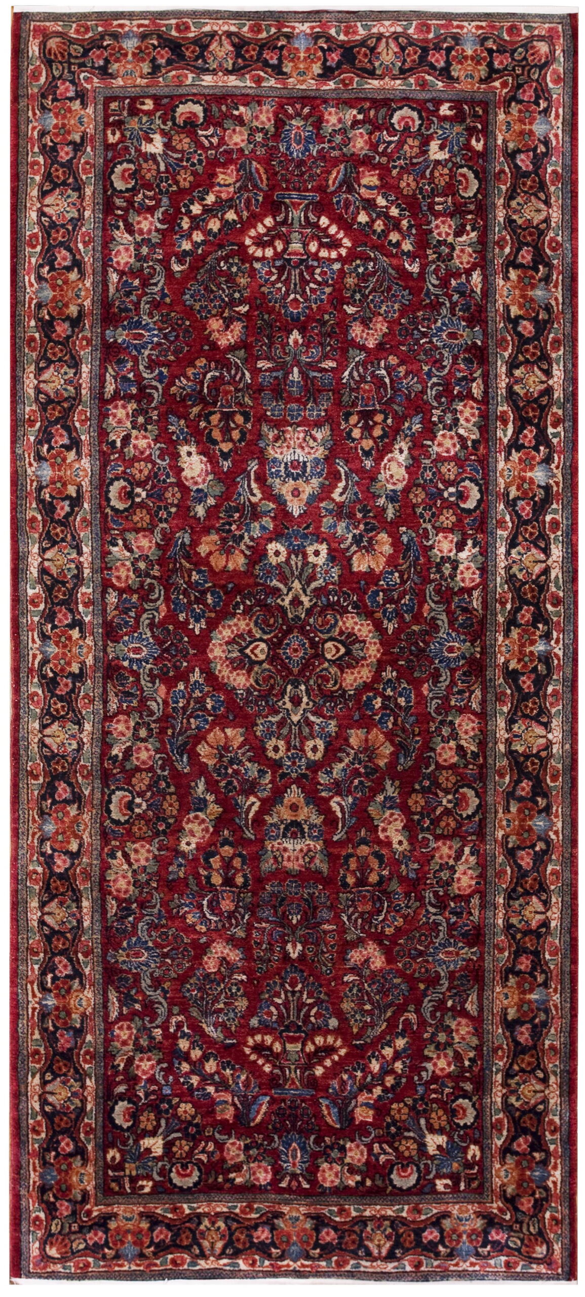 Unlike medallion compositions, this Sarouk utilizes an elaborate allover design where stylized blossoms and vinery repeat seamlessly across the entire length of the field. This continuous, flowing structure ensures visual interest from every angle, framed by a classic multi-tiered border featuring repeating cartouches and delicate guard stripes.