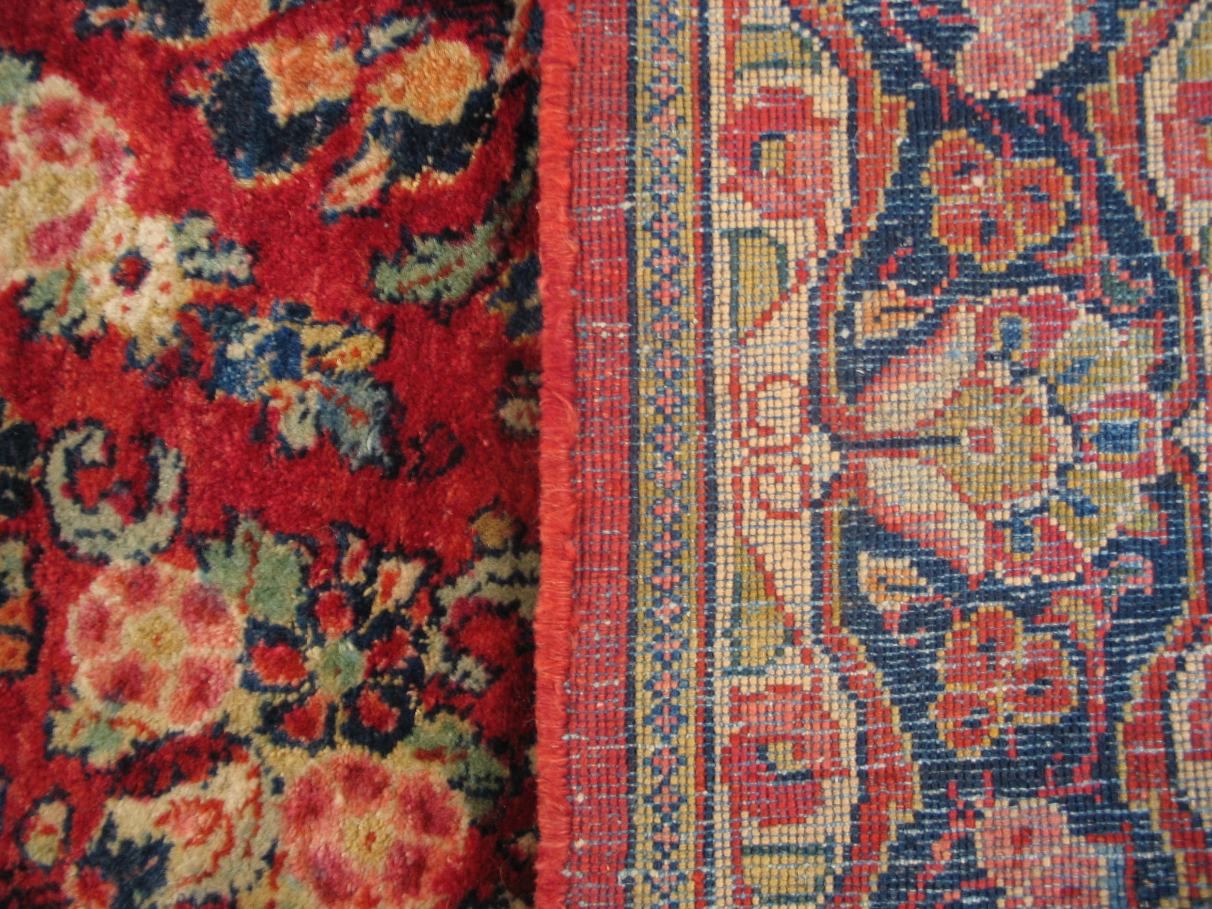 The field is dominated by a stunning, deep coral hue, a color achieved through natural dyes that has mellowed beautifully over a century. This rich background serves as the perfect canvas for the intricate floral sprays and palmettes, rendered in contrasting tones of deep indigo, soft cream, and muted gold.