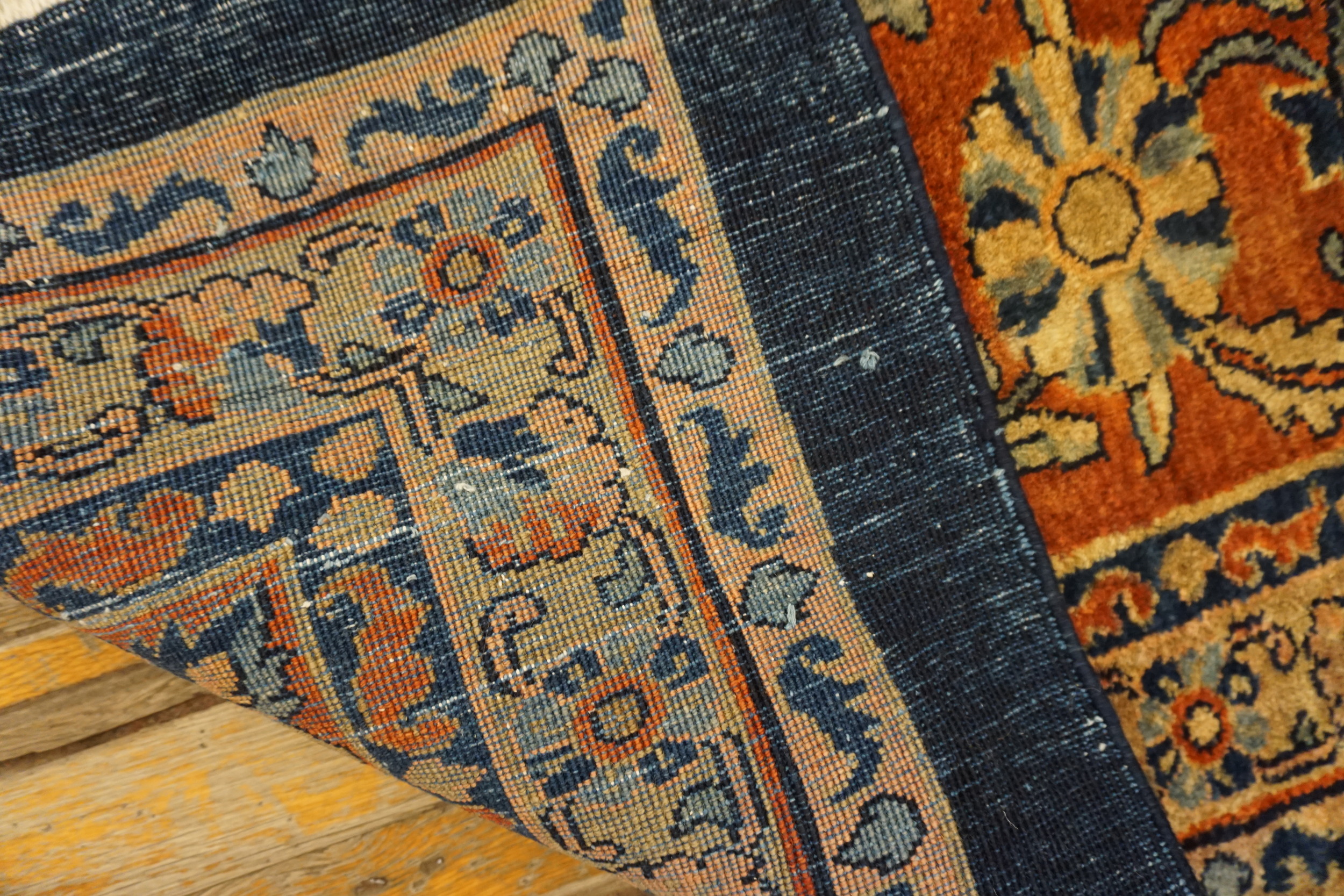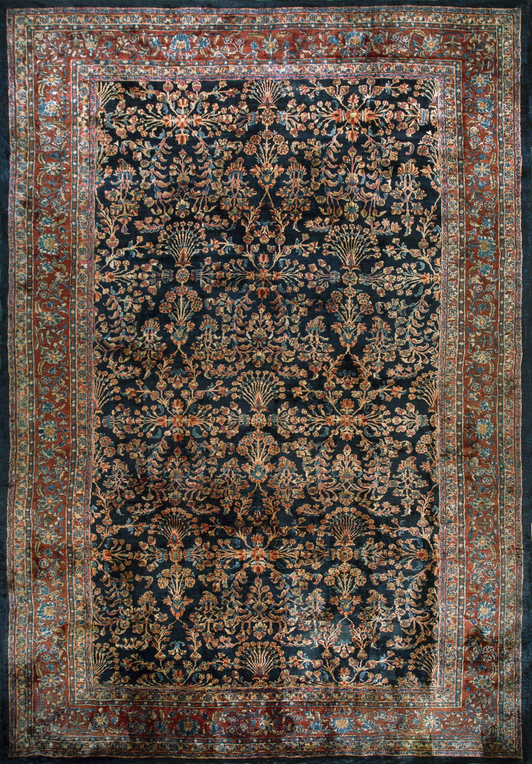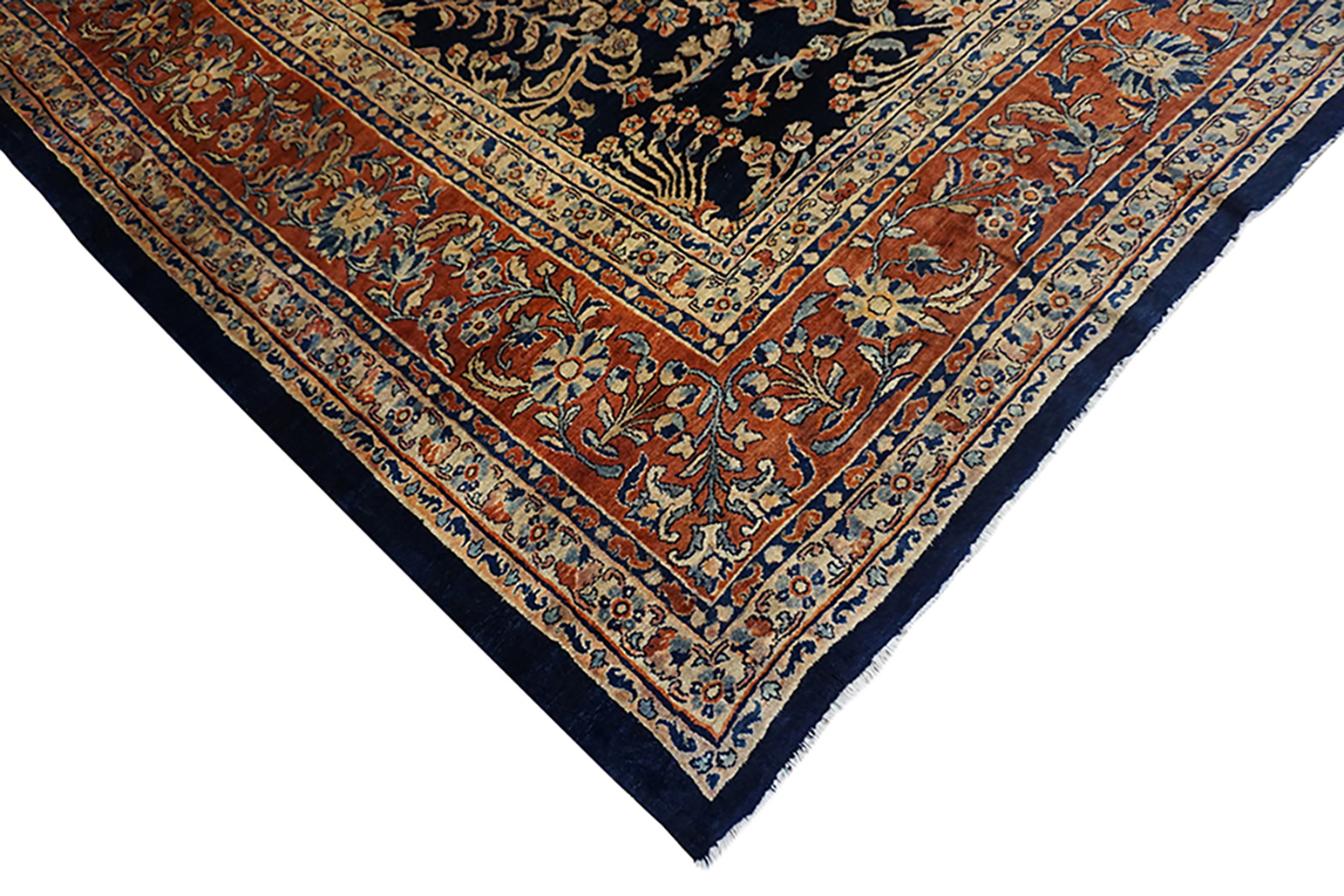 Allover Floral Hand Knotted Pile 1920s Rectangle Antique Wool Blue Large Rug, Circa Date: 1920s. This exceptional piece, likely a Sarouk or similar Persian urban weave from the 1920s, showcases the sophisticated weaving traditions of the early 20th century. Its dense wool pile and rich saturation establish it as a prime example of the era’s finest textile art, utilizing a mesmerizing allover design that covers the entire field.