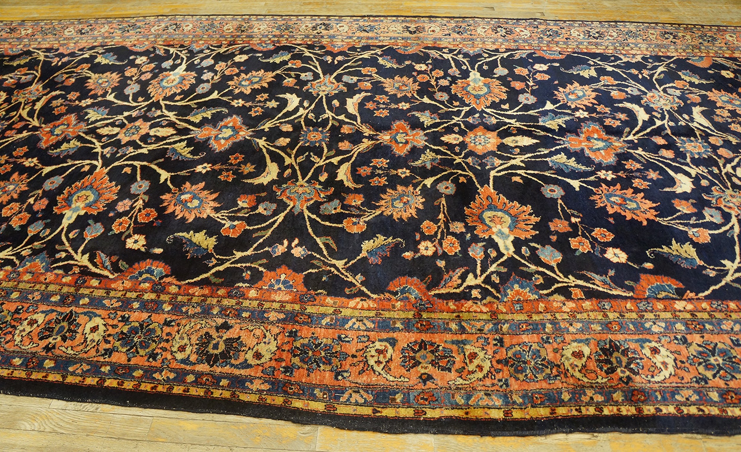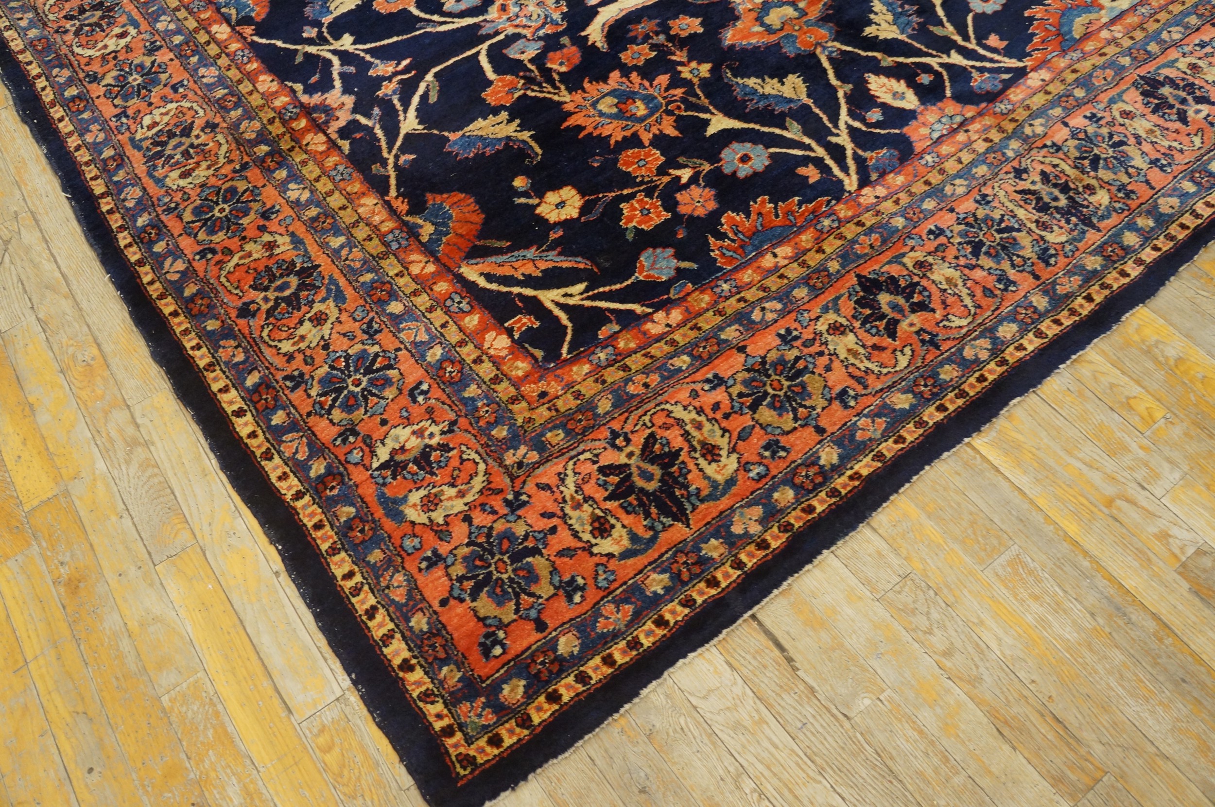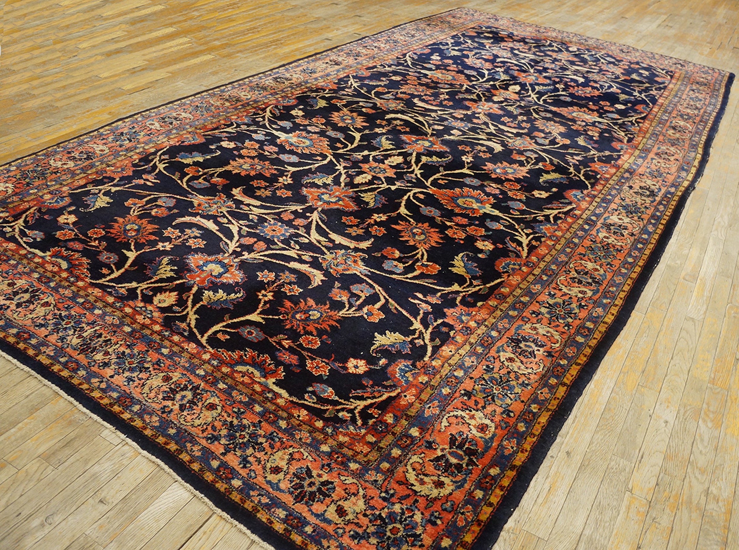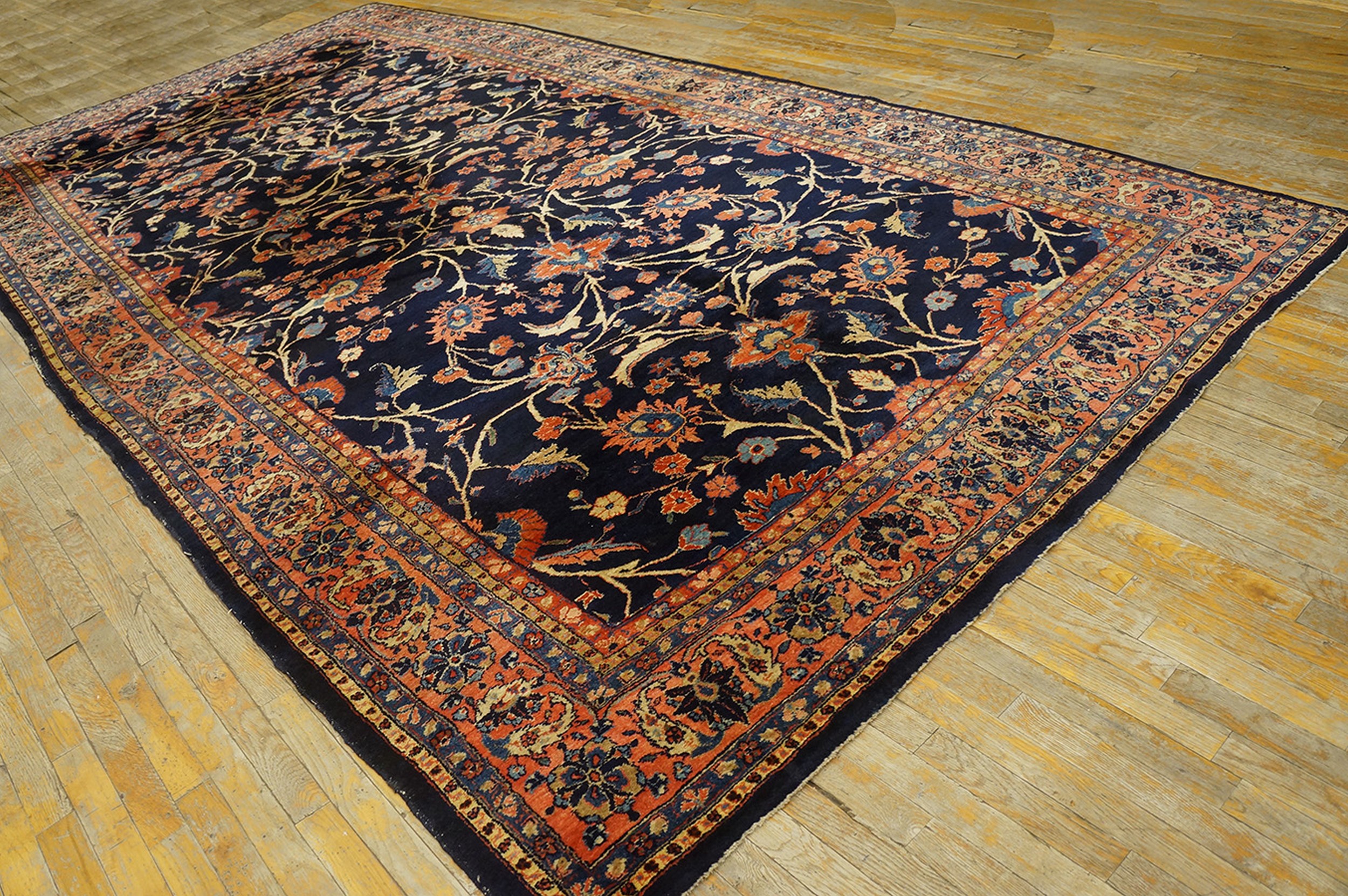 Antique Sarouk Large Room Size Wool Blue Navy Rug, Country of Origin: Iran / Persia, Circa Date: 1920s. This magnificent example of early 20th-century weaving tradition showcases the technical mastery characteristic of Iranian / Persian rugs. The deep, saturated field, typical of the Sarouk style, provides a dramatic backdrop for the intricate design elements.