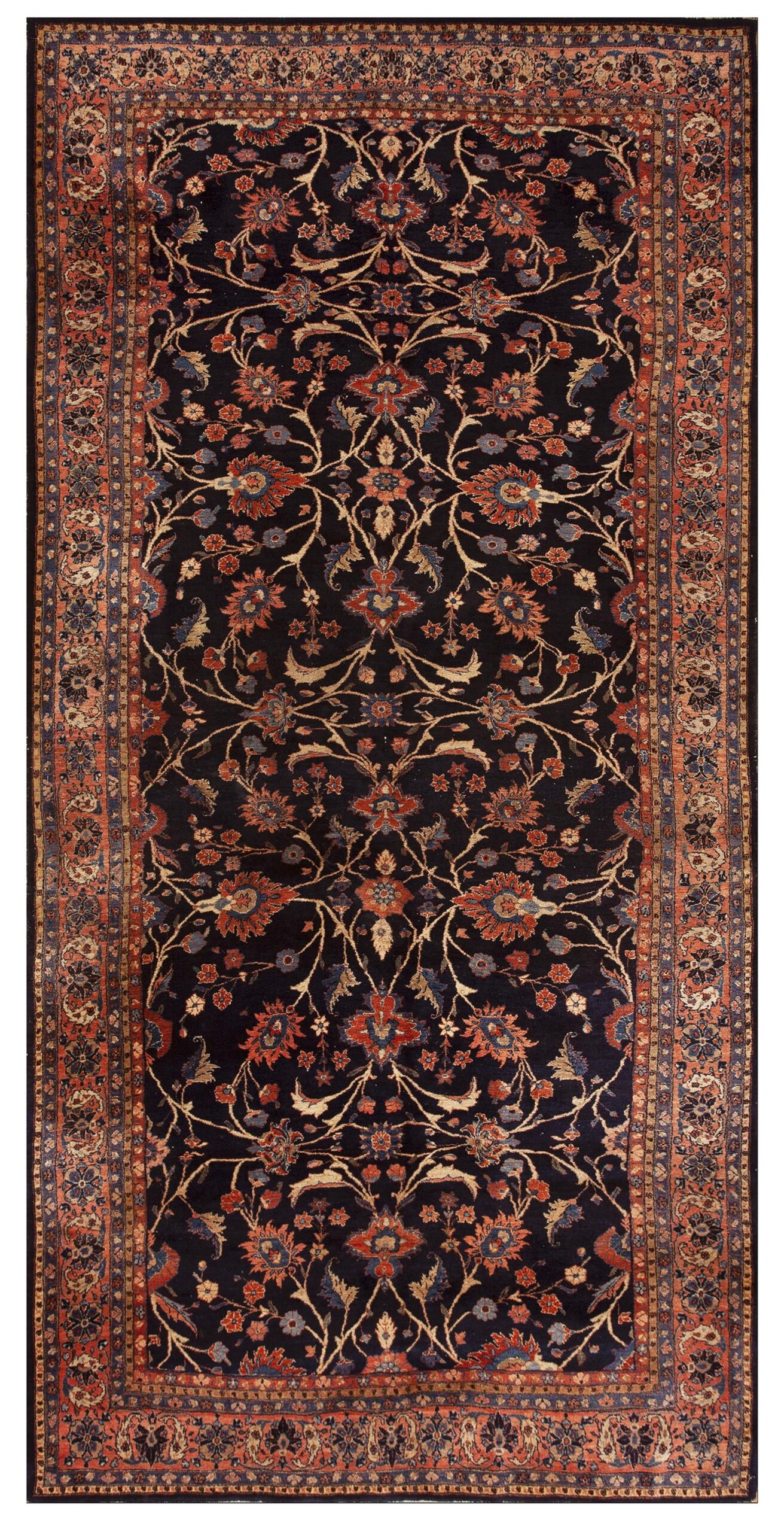The central ground is rendered in a profound navy blue, bordering on black, which enhances the vibrancy of the secondary colors. This rich field color is highly sought after in blue color rugs, offering depth and formality to any interior space. Accents of terracotta, soft salmon, and pale ivory create a striking contrast, illuminating the dense pattern work.