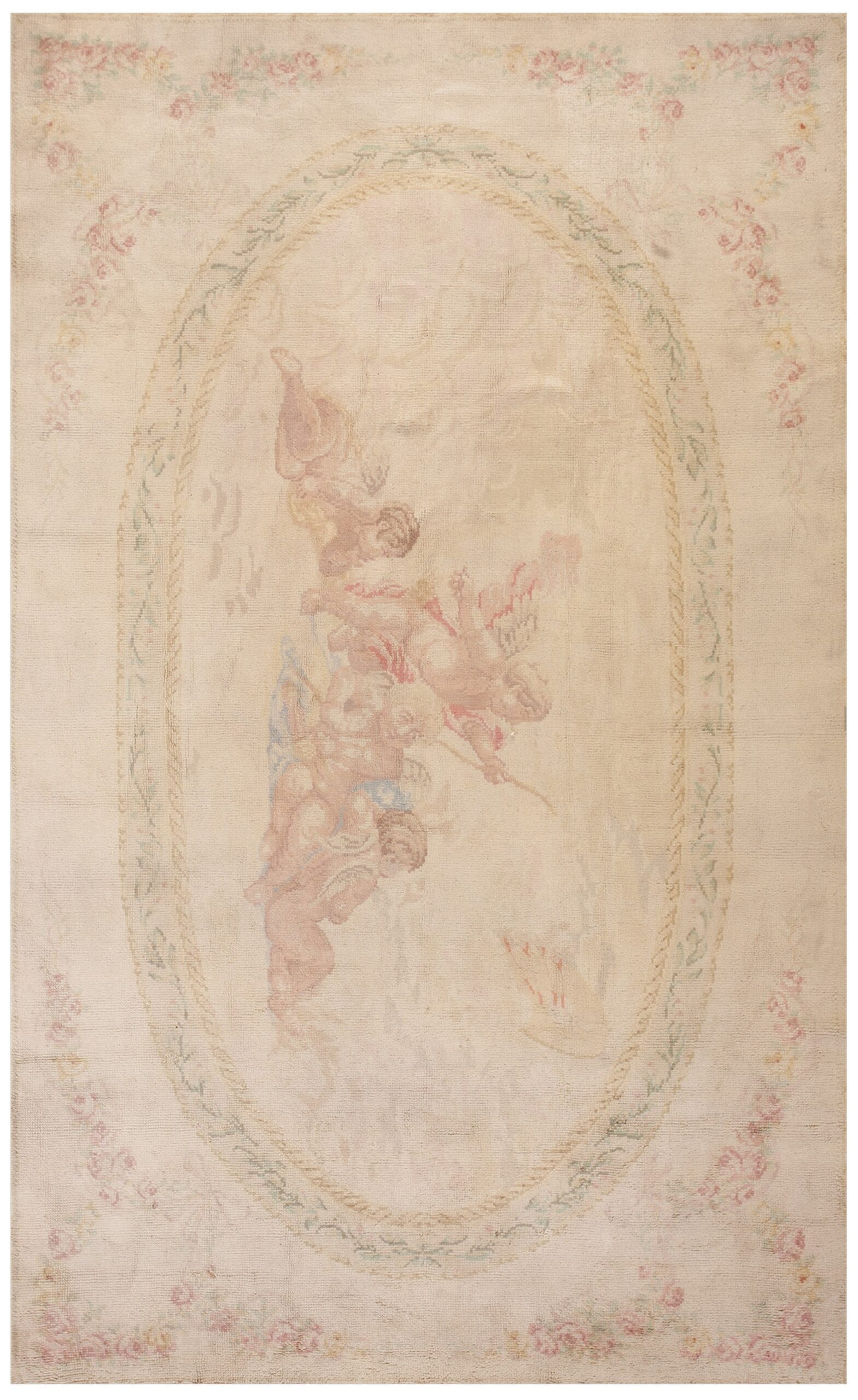 The rug features a striking central medallion framed by a delicate garland border. Within this oval field, a classical scene of cherubs or putti is rendered in soft, painterly tones, contrasting gently with the field. The corners are adorned with trailing rose garlands, reinforcing the romantic aesthetic typical of floral rugs from this period.