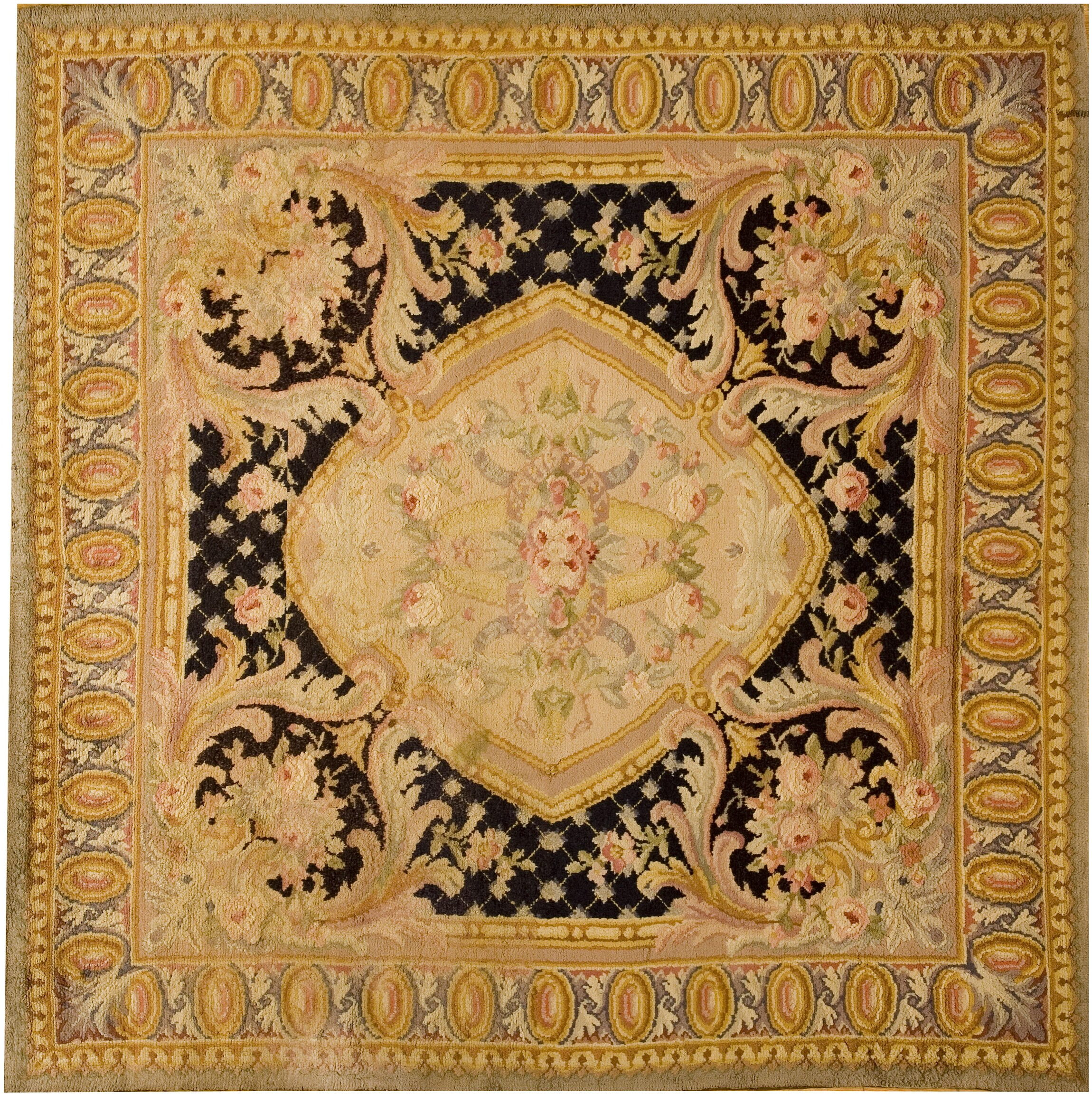 The composition utilizes a striking contrast between the rich, dark ground and the luminous ivory color palette used in the primary field and border elements. Soft tones of rose, gold, and sage green accent the elaborate scrolling foliage, ensuring the rug retains a light, airy quality despite the dramatic use of black in the background lattice. This careful color management speaks to the sophisticated tastes of the era.