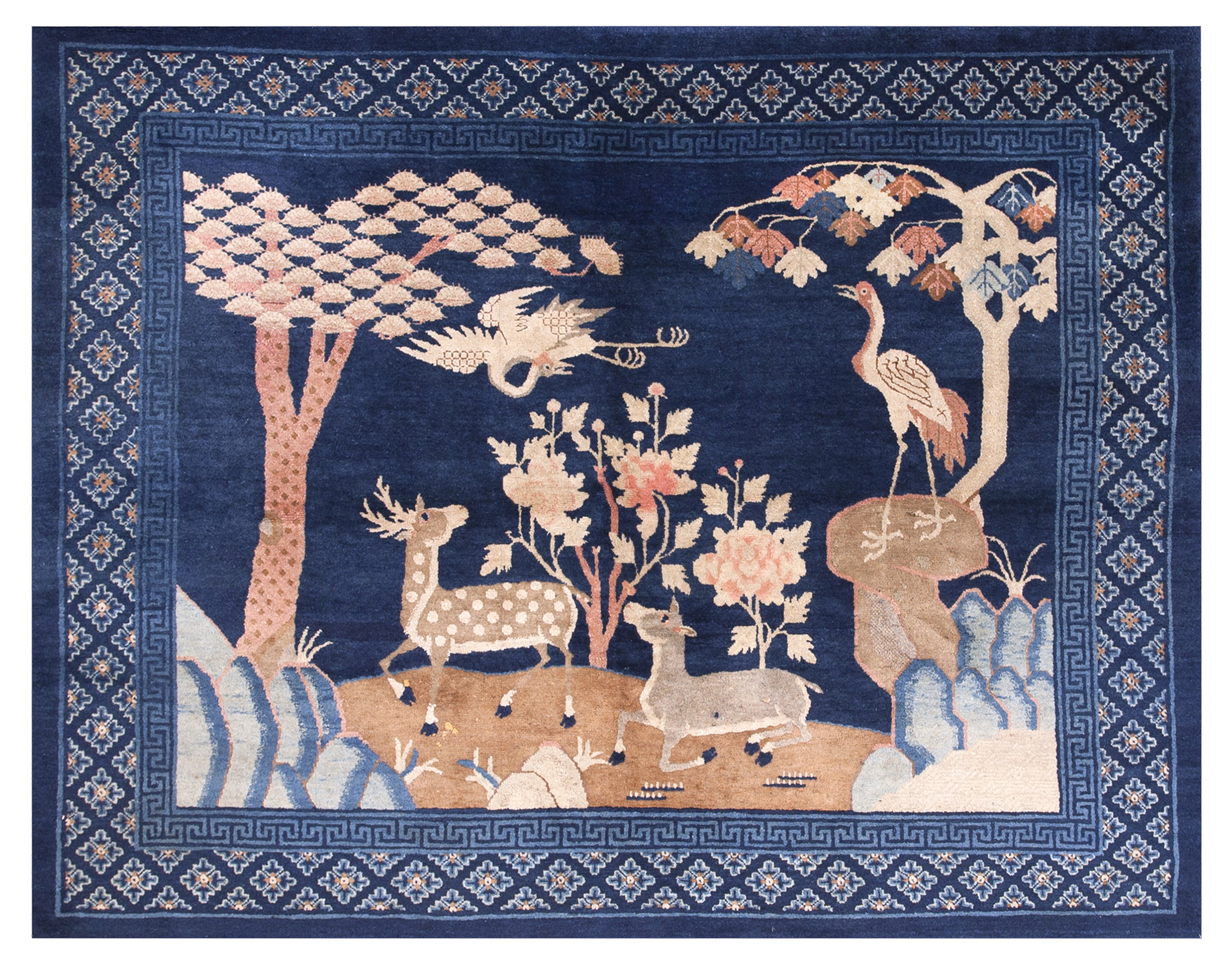 The central medallion is replaced by a complex, idyllic landscape featuring traditional Chinese symbols of fortune and longevity. Two majestic cranes and a pair of spotted deer are set among stylized trees and large blossoms. The masterful use of the deep blue color rugs creates depth and contrast, highlighting the subtle palette of dusty rose, cream, and warm taupe used for the figures.