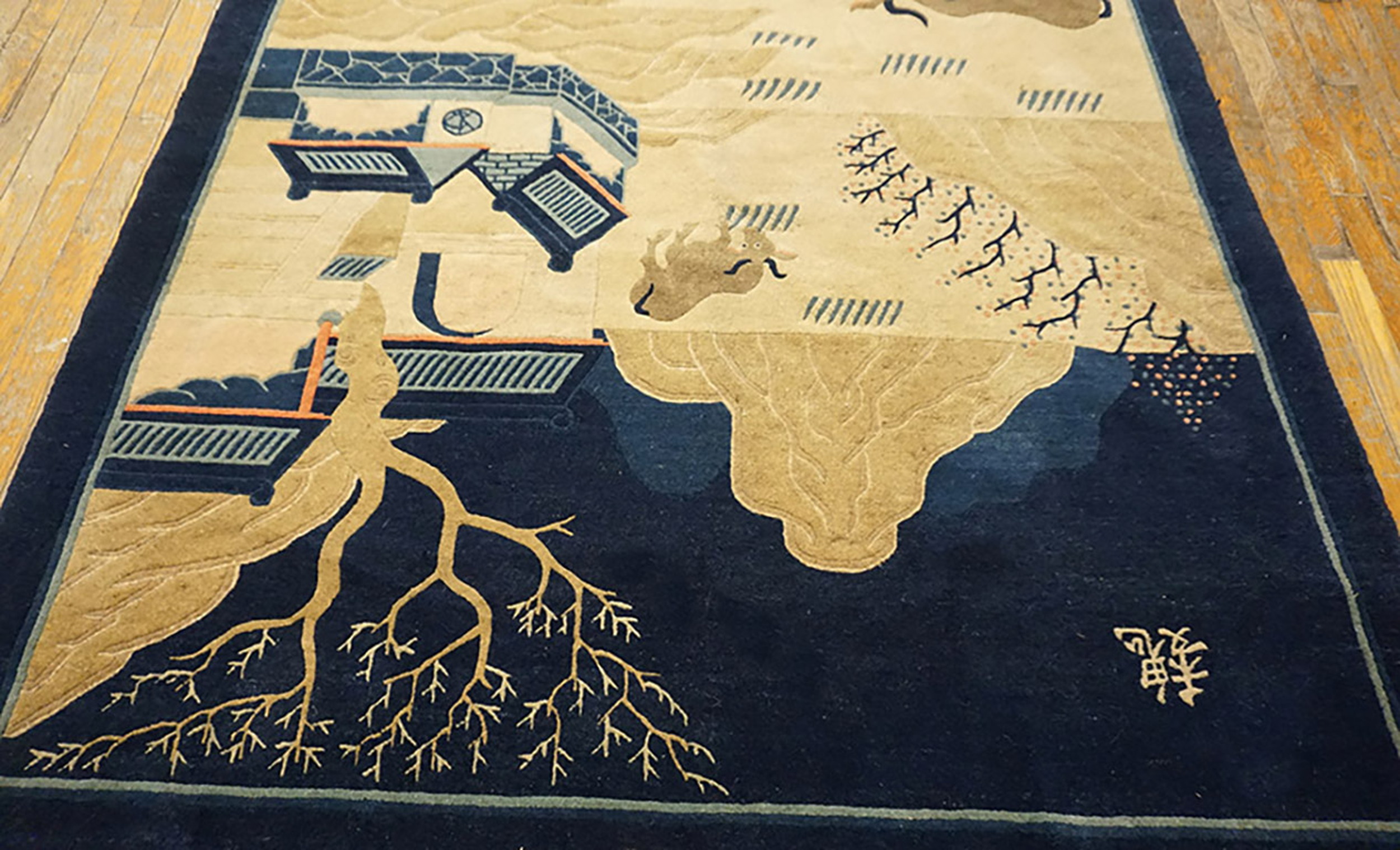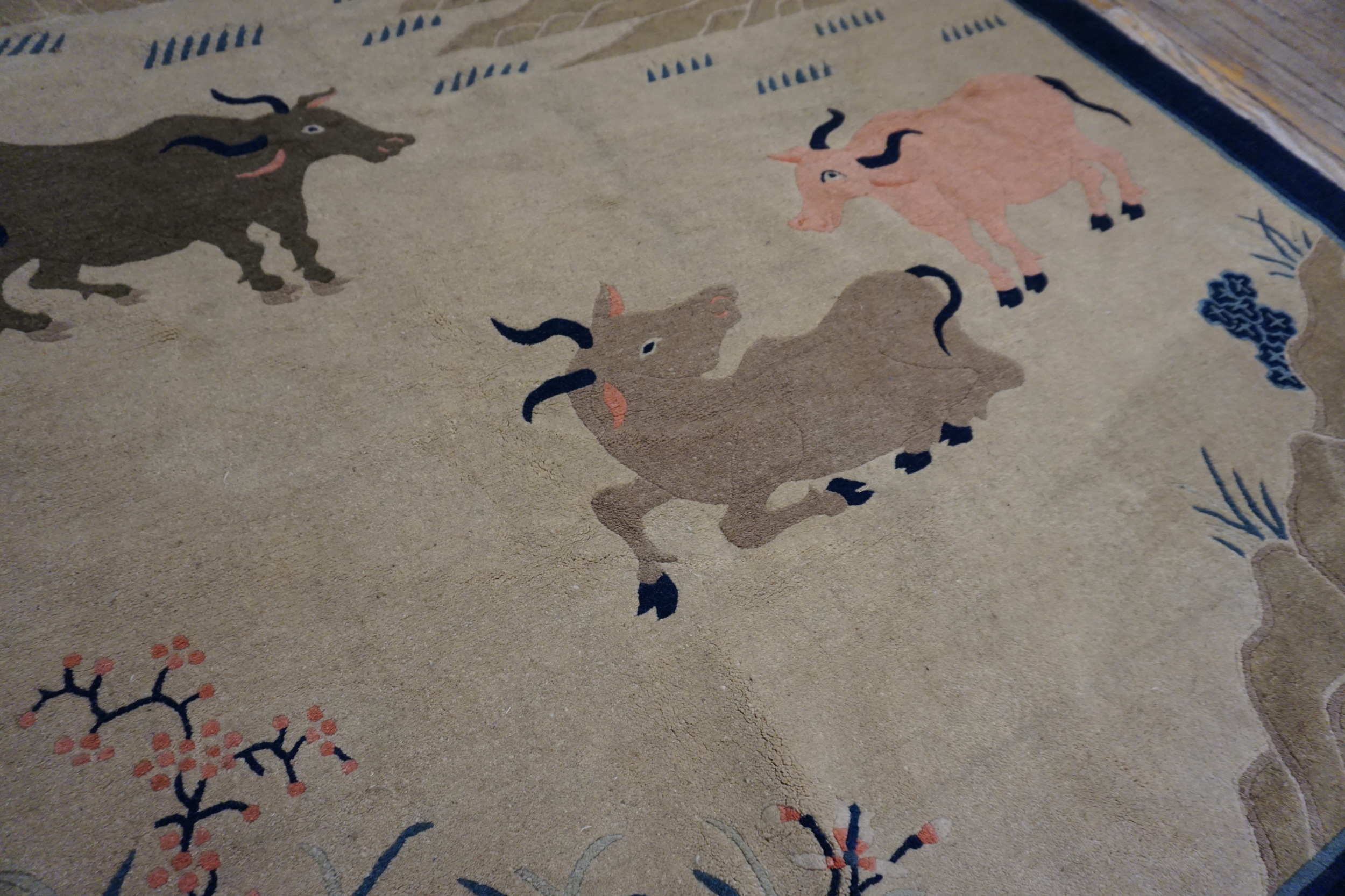 Dating to the 1900s, this rug exemplifies the high knot density and craftsmanship characteristic of the period, offering both durability and aesthetic refinement. It remains a superb example among antique rugs, embodying the elegant, narrative style prized by collectors of early 20th-century Chinese textiles.