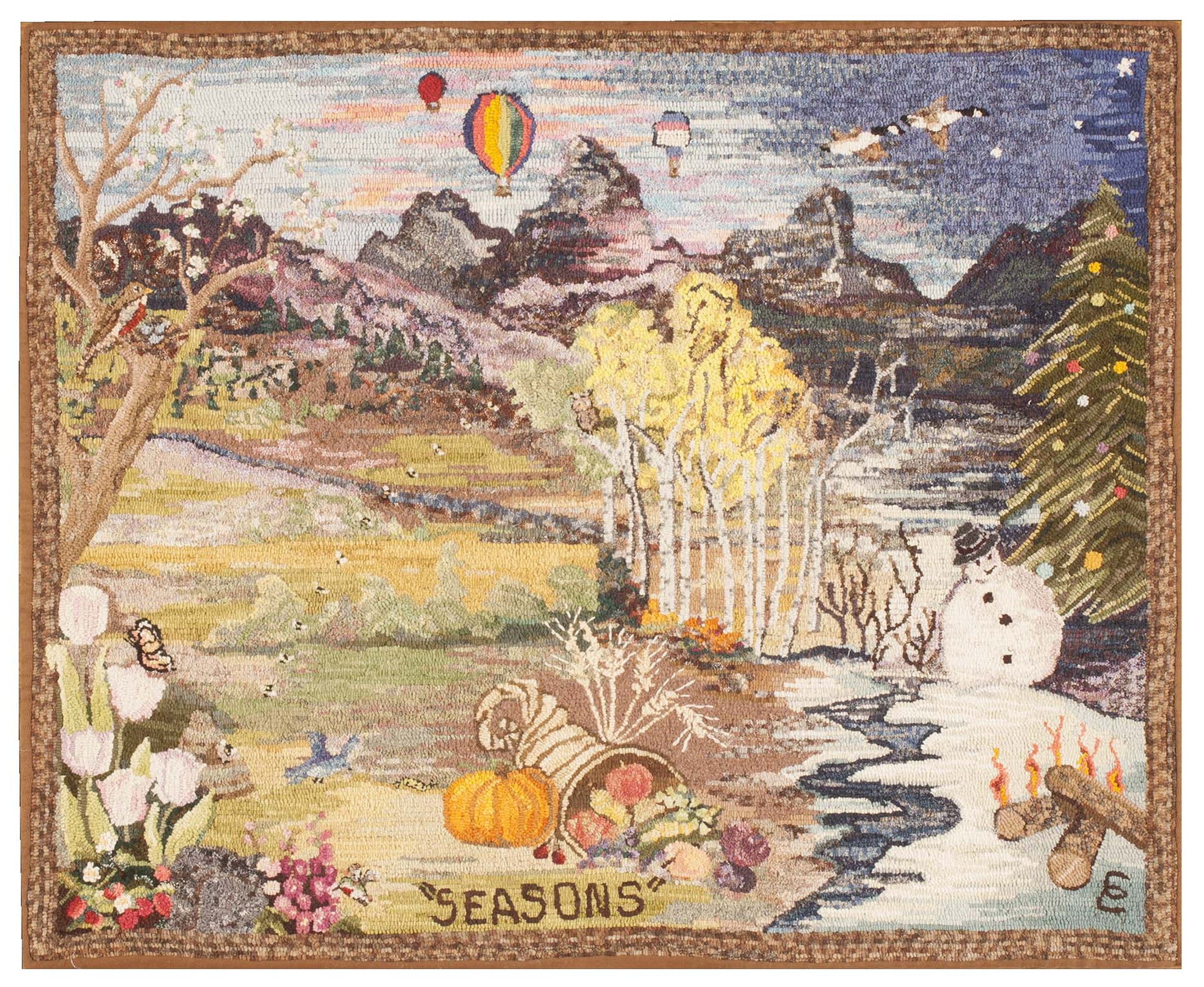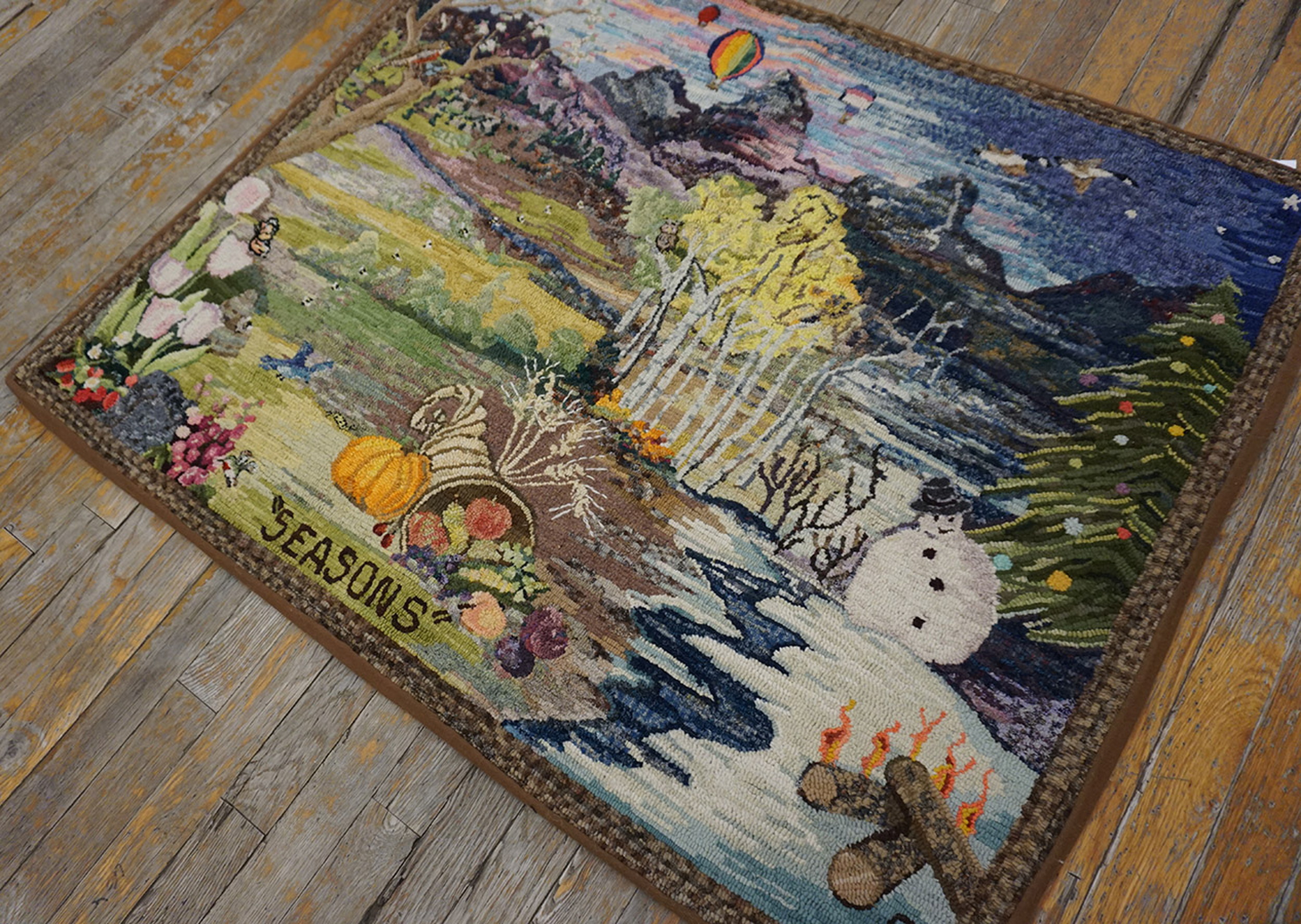 Antique American American Hooked Rug Multicolor 1940s, Country of Origin: American USA Rugs, Circa Date: 1940s. This remarkable textile is a quintessential example of the pictorial folk art tradition specific to the American hooked rug style. Executed during the 1940s, it captures a detailed, almost naive landscape that celebrates the natural beauty inherent in American USA Rugs.