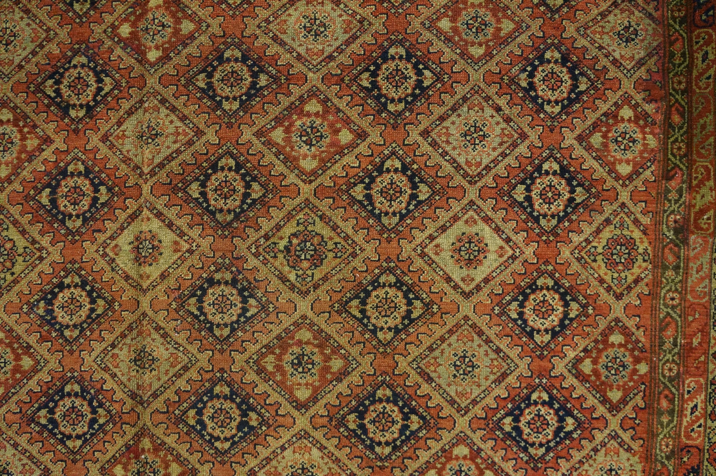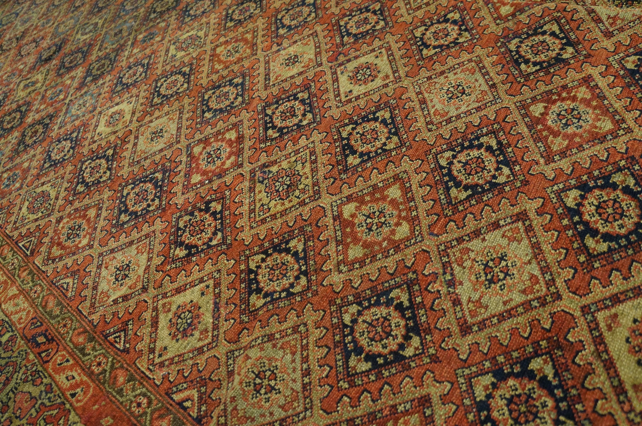 Antique Senneh Persian Geometric Knotted Rug, Circa Date: 1890s. This exceptional piece exemplifies the meticulous craftsmanship characteristic of Kurdish weaving centers in Western Persia. The field is dominated by a precise, repeating diamond lattice, a sophisticated geometric structure typical of high-quality oriental rugs. The density of the knotting suggests it was intended for a discerning clientele, showcasing the technical mastery of the weavers.