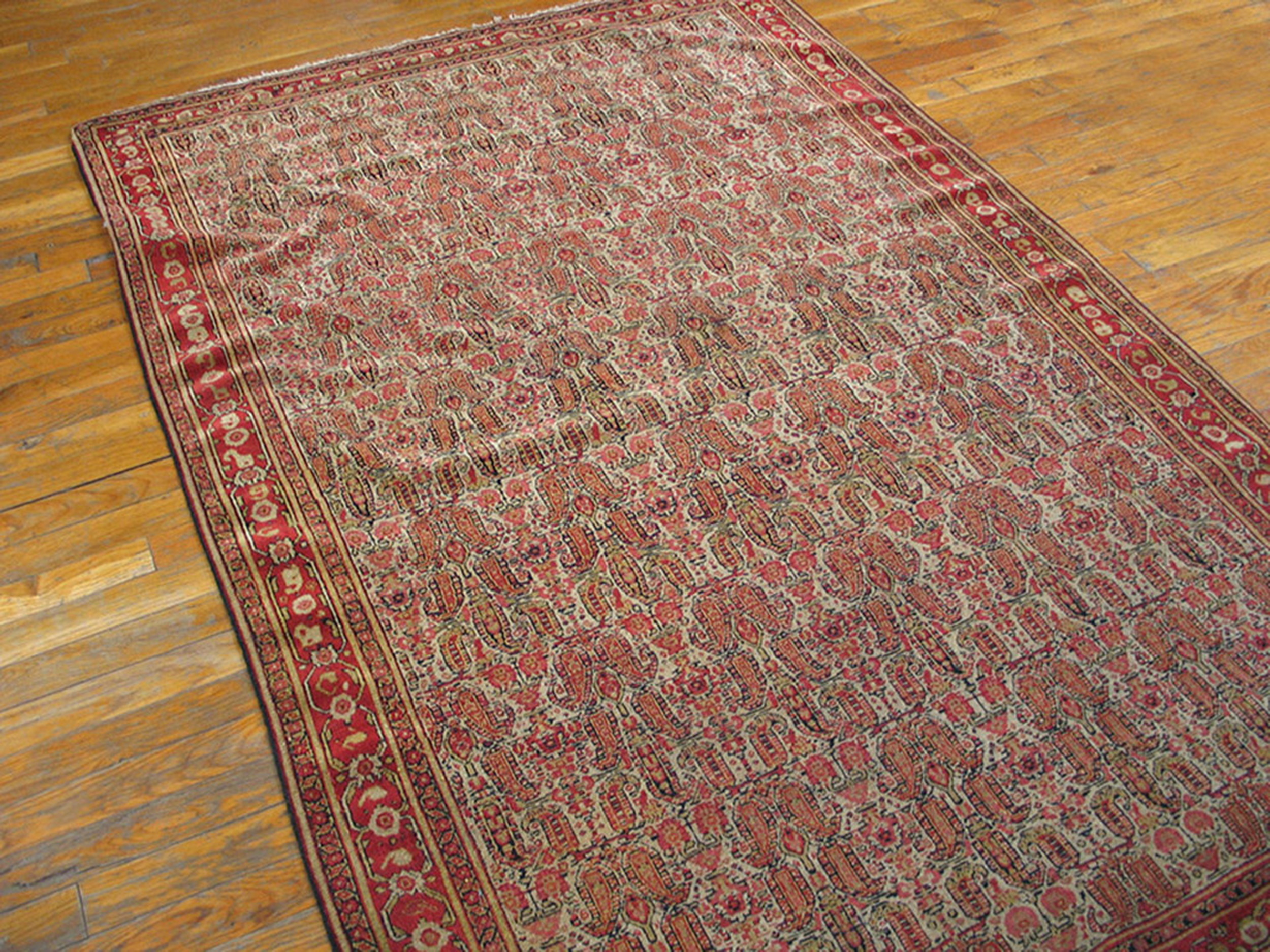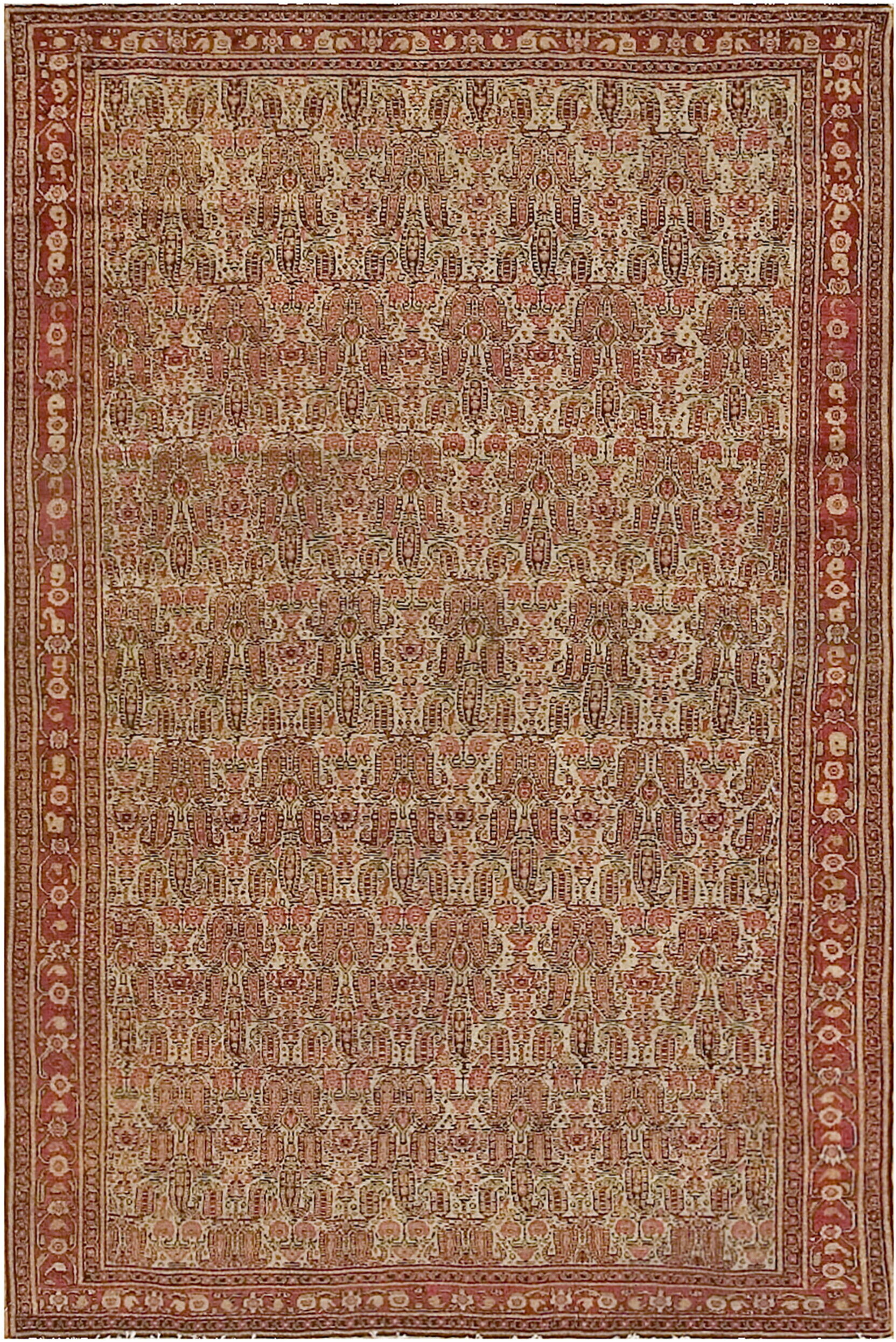 The luminous ivory field provides a striking, yet balanced, canvas for the intricate design work. This central ground is completely covered by a dense allover pattern of repeating, highly stylized boteh motifs rendered in subtle shades of madder red, terracotta, and soft olive. The effect is one of continuous movement and visual texture.
