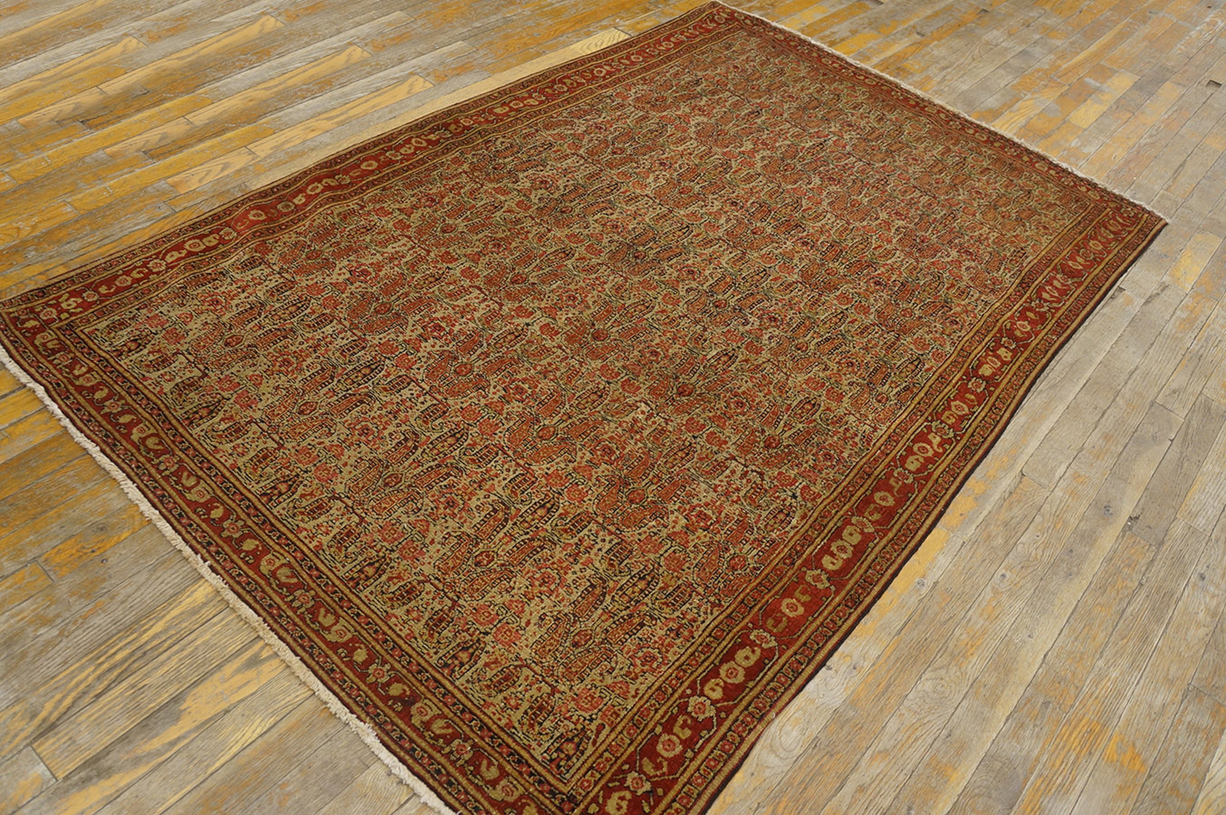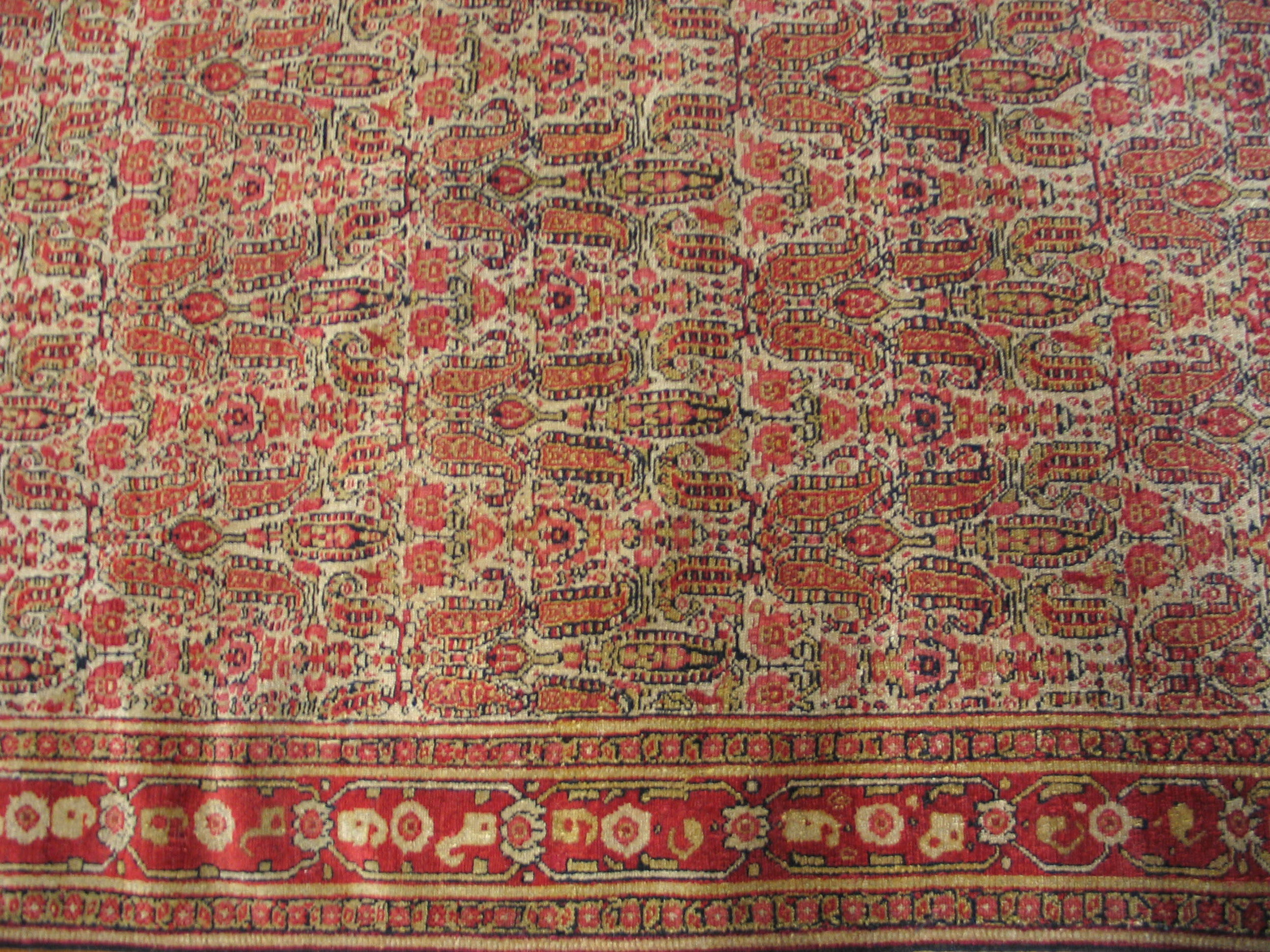 A bold, rust-red border frames the composition, providing necessary contrast and definition. This secondary frame features a series of geometric floral cartouches interspersed with delicate guard borders. Pieces of this age and quality are increasingly rare, representing a significant acquisition among fine antique rugs.