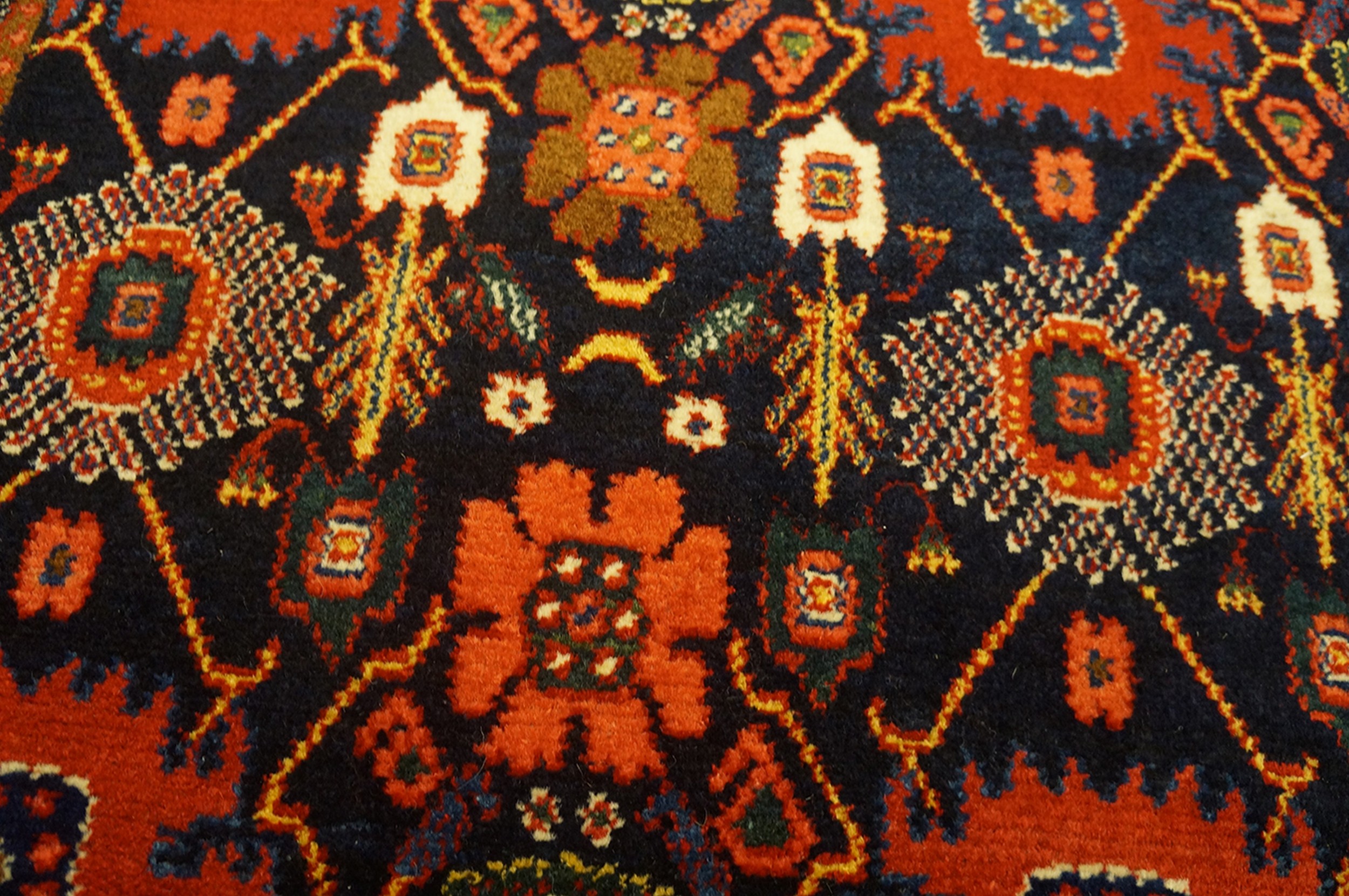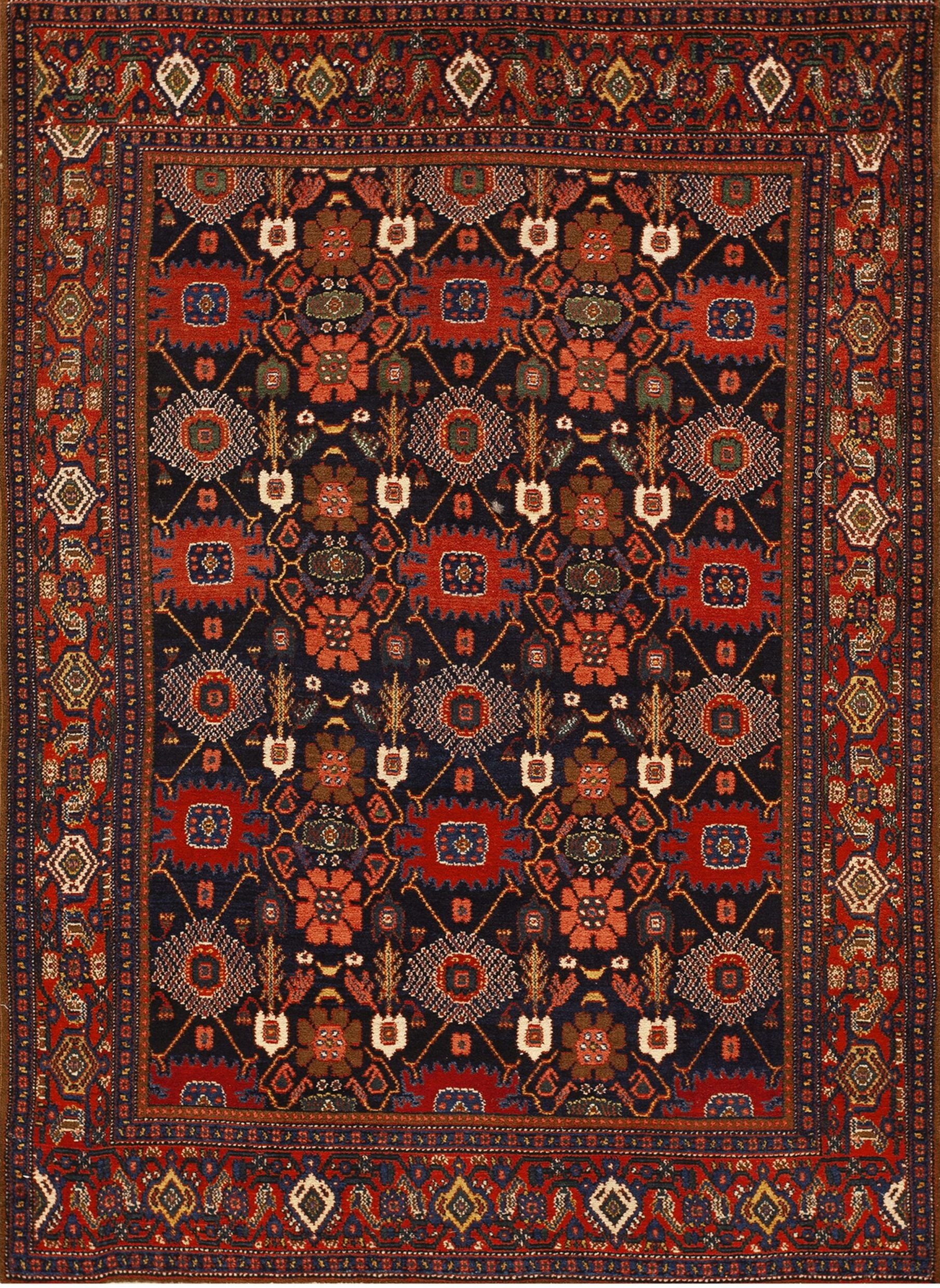 The field presents a striking contrast, utilizing a deep, near-black indigo ground that allows the intricate motifs to radiate. The primary palette is dominated by a rich, earthy rust red color, balanced by highlights of cream, ochre, and subtle teal, showcasing the mastery of natural dyes characteristic of the late 19th century.