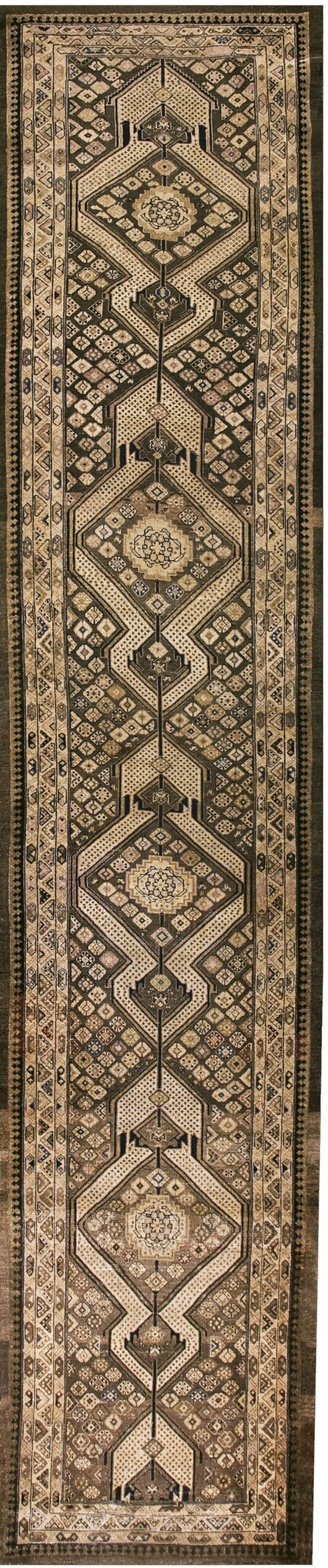 Characteristic of tribal weaving, the field is densely populated with intricate secondary motifs, including stylized diamonds and latch-hooks, which fill the negative space surrounding the primary medallions. While centered around major motifs, the overall density and repetition classify this as a magnificent allover rug, ensuring visual engagement from every angle. This Serab runner remains in remarkable condition, a testament to its quality and age.