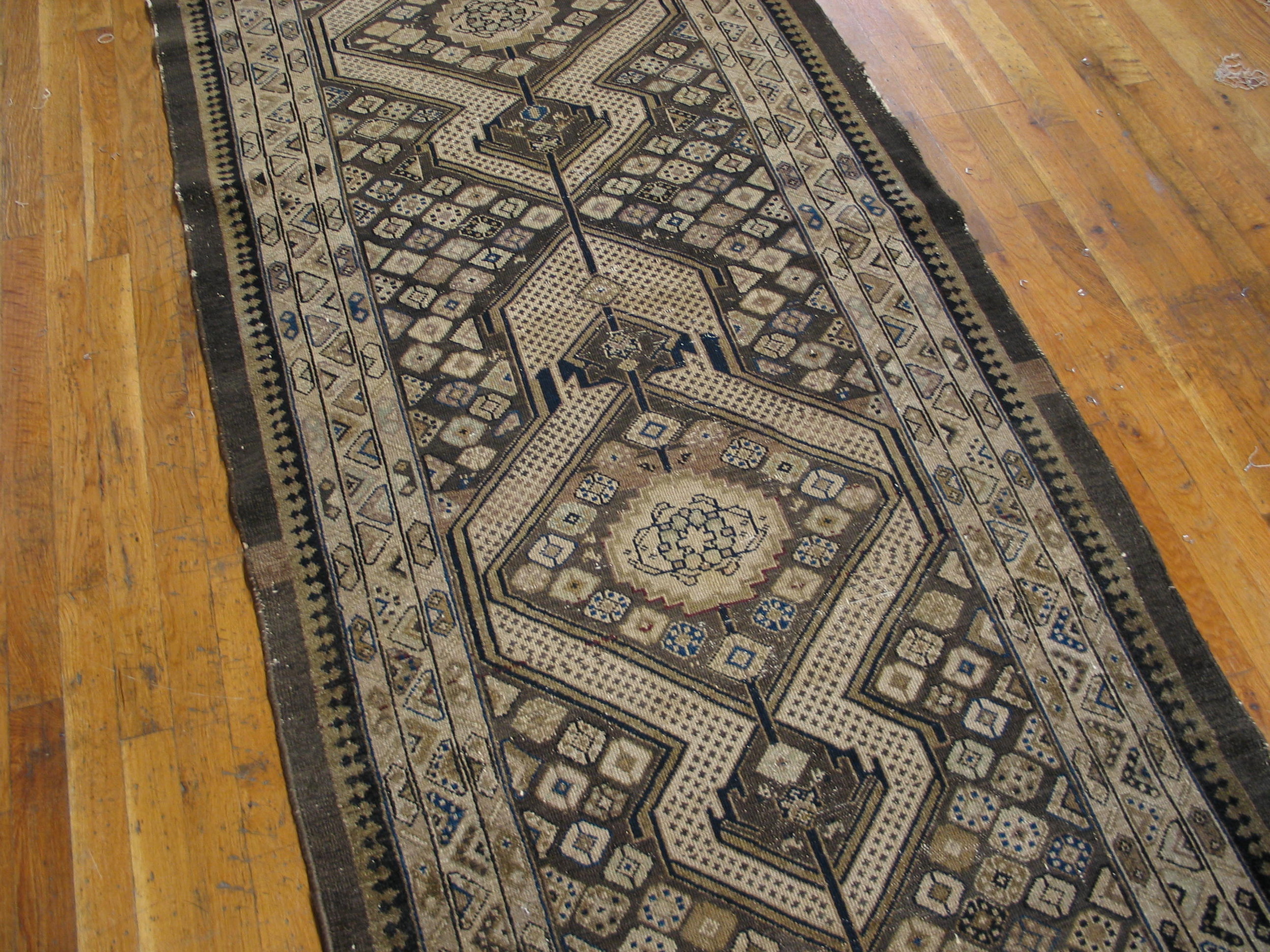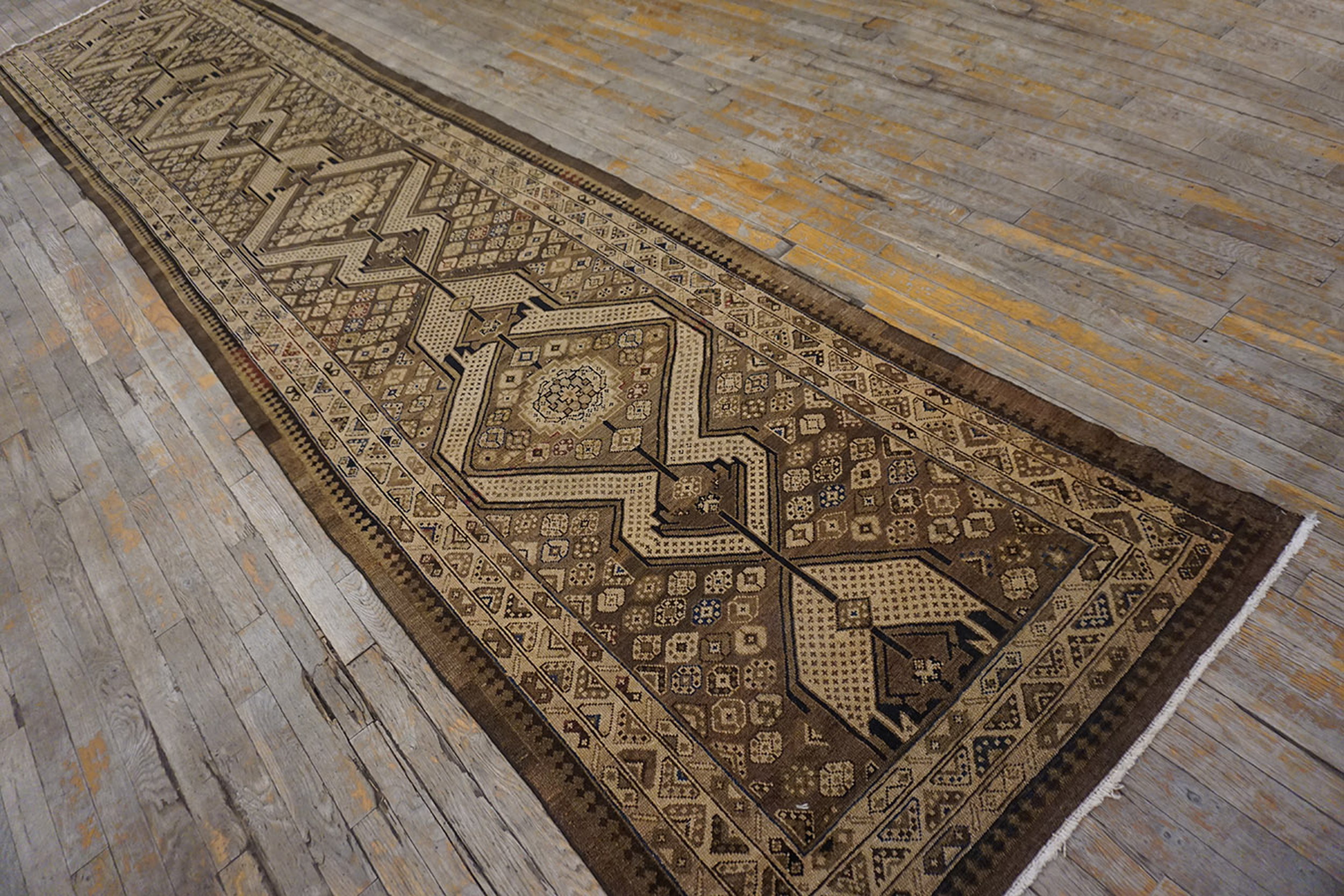 Antique Serab Large Hallway Runner Wool Brown Rug, Circa Date: 1890s. This exceptional piece represents the finest tradition of Serab weaving, renowned for its robust construction and striking tribal geometry. Woven in Northwest Persia, this runner is a superb example of the enduring artistry found in antique rugs from the late 19th century.