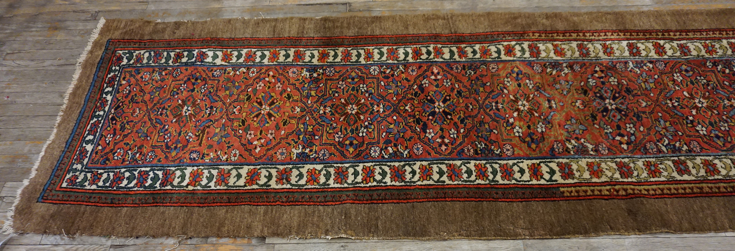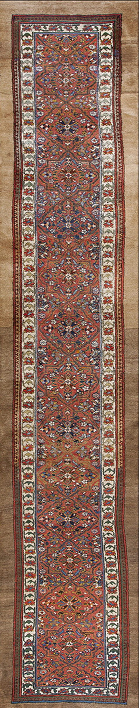 The intricate field pattern features a dense, repeating lattice of stylized boteh and medallions, executed in a classic allover design that avoids a central medallion, ensuring visual consistency regardless of placement. This Serab runner is a testament to enduring nomadic craftsmanship and refined aesthetic taste.