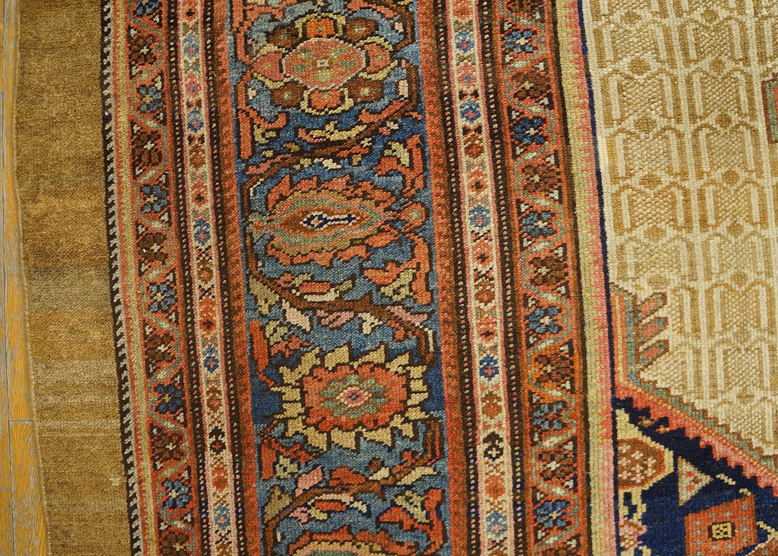 The palette is grounded in sophisticated neutrals, featuring a luminous ivory field overlaid with a subtle, repeating geometric trellis in soft tan. This light ground is beautifully framed by borders rich in terracotta, indigo, and salmon accents, providing a dynamic contrast to the overall brown earth-tone composition characteristic of Serab production.