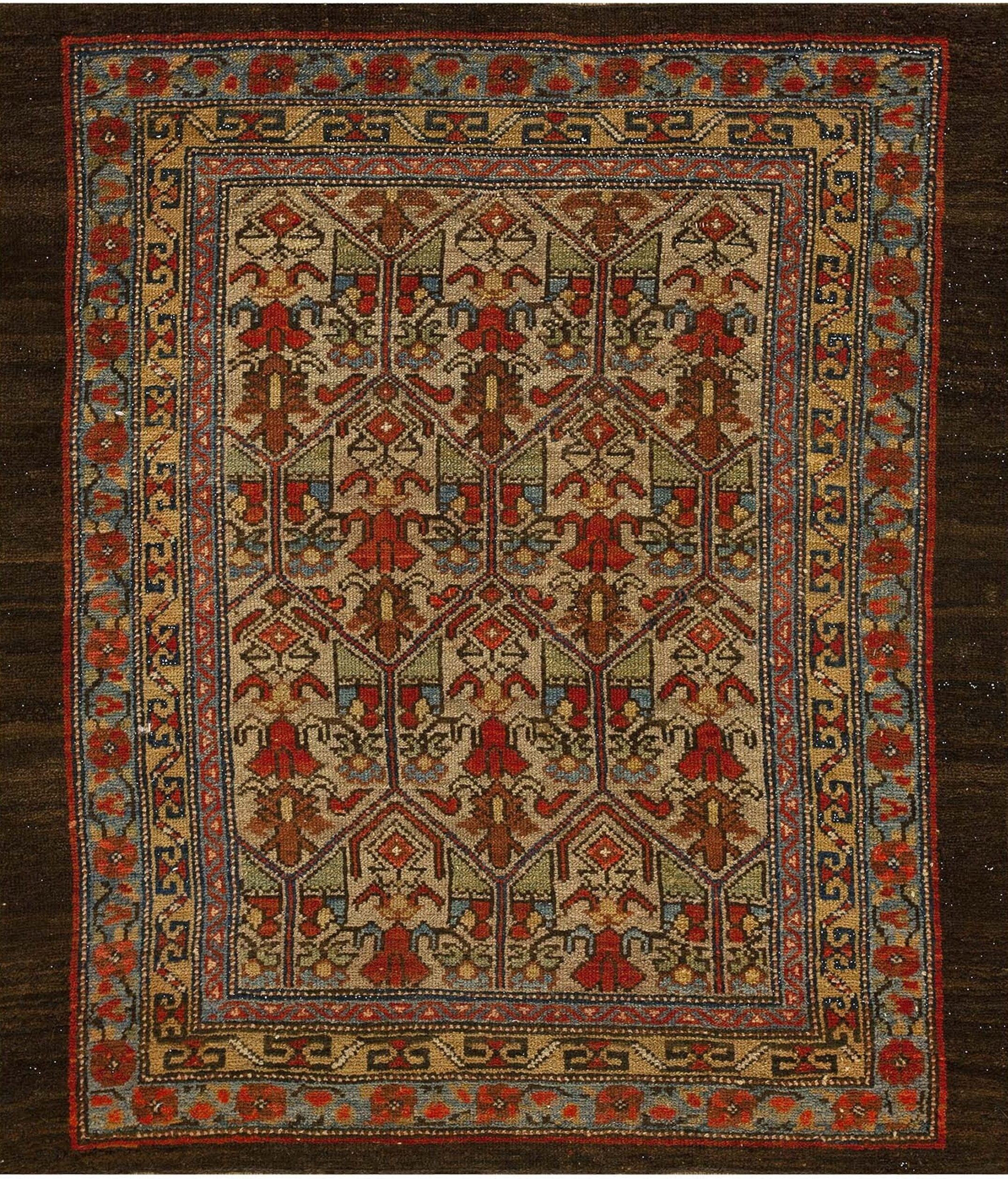 Woven entirely from hand-spun wool and colored with rich vegetable dyes, this piece retains remarkable clarity and saturation for its age. Its relatively small scatter size makes it highly versatile, suitable for an entryway, hearth, or layered within a larger decorative scheme, offering a powerful visual anchor despite its modest dimensions.