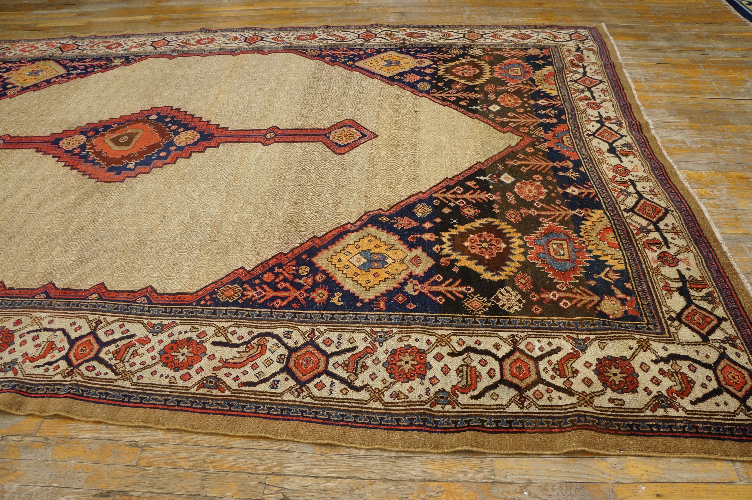 Antique Serab Room Size Wool Camel Rug, Circa Date: 1890s. This exceptional late 19th-century Persian Serab exemplifies the finest weaving traditions of the Caucasus border region. The use of undyed, natural camel hair wool in the expansive field is characteristic of the area’s most sought-after pieces, providing a soft, luminous ground.