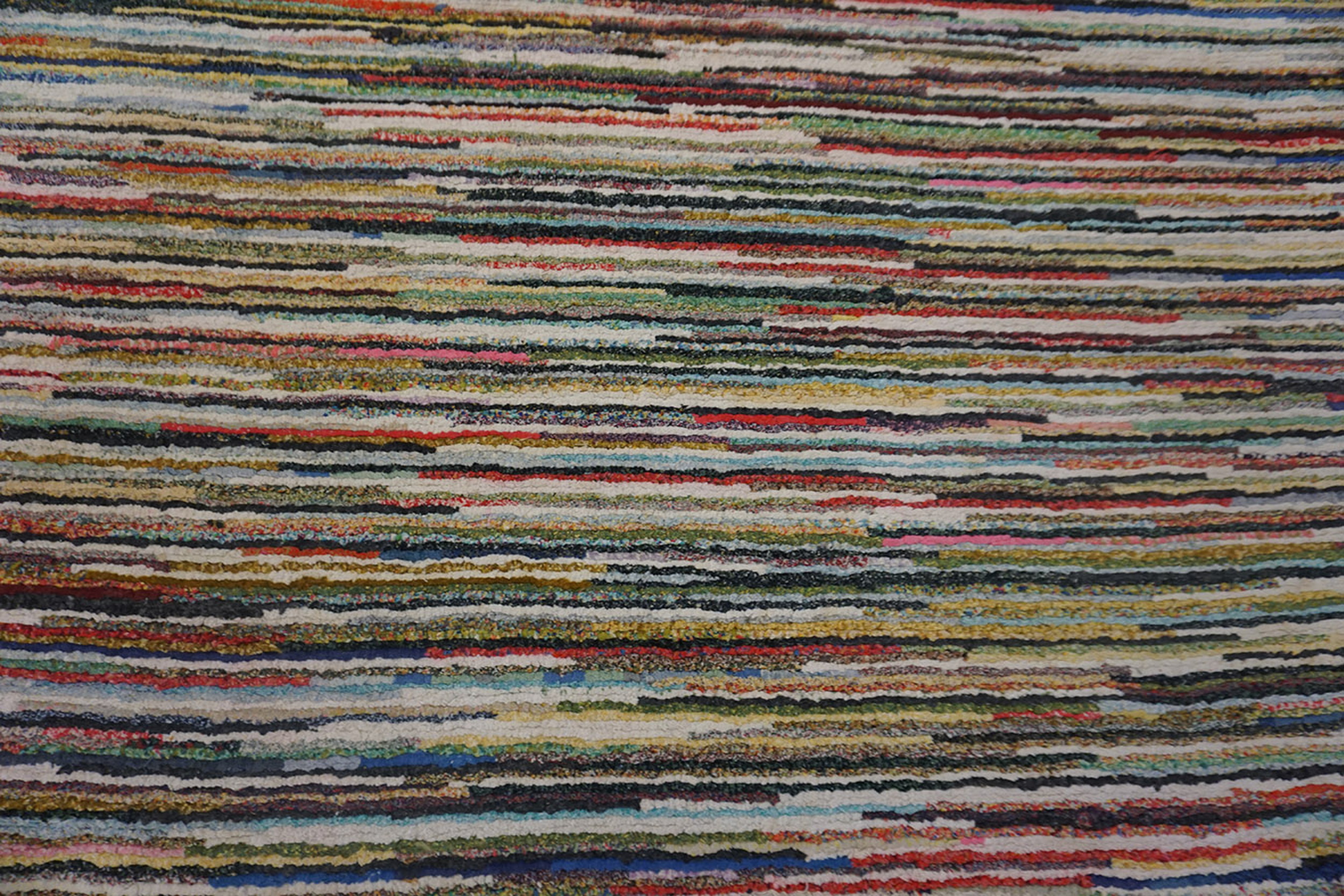 The texture is dense and subtly uneven, characterized by horizontal bands of color created by the unique knotting technique. This unique visual effect results in a vibrant, yet controlled, surface, displaying a complex array of hues that coalesce into a striking multicolor jewel tone palette.