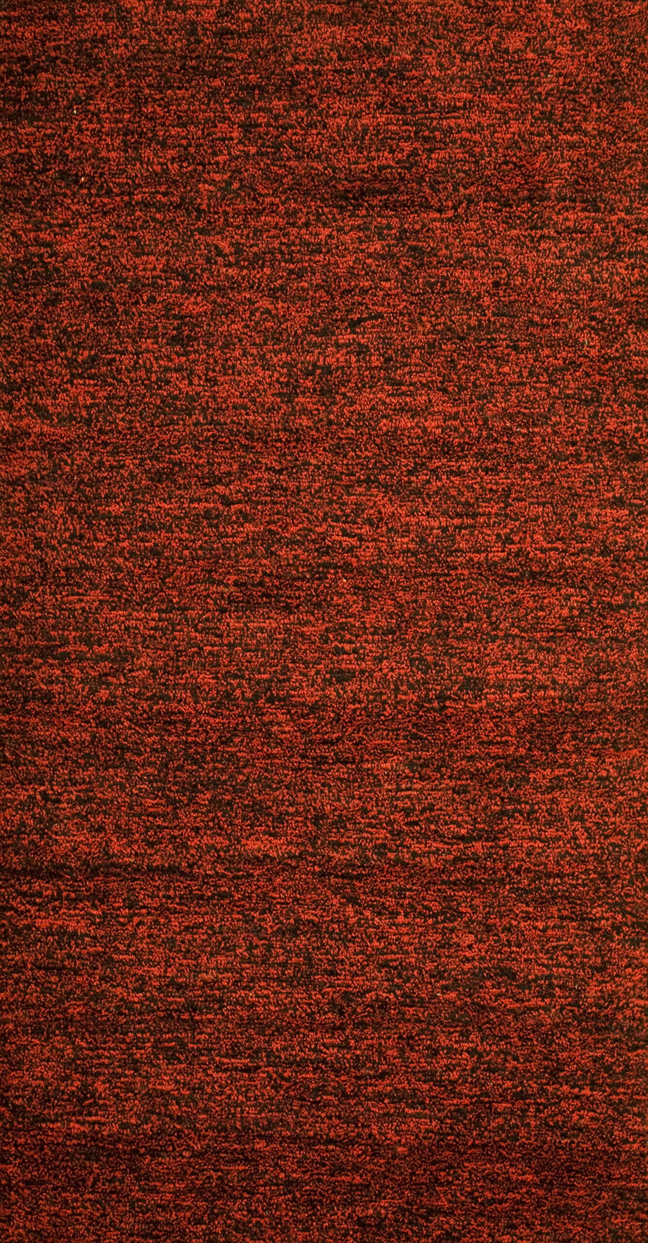 The dense, hand-knotted pile creates a dynamic, heathered surface. Deep black threads are tightly interwoven with vibrant tones, resulting in a rich, almost volcanic appearance that transcends simple red. This effect provides an allover texture that subtly shifts between burnt orange hues and softer tones of salmon and coral, offering visual complexity without relying on a defined pattern.
