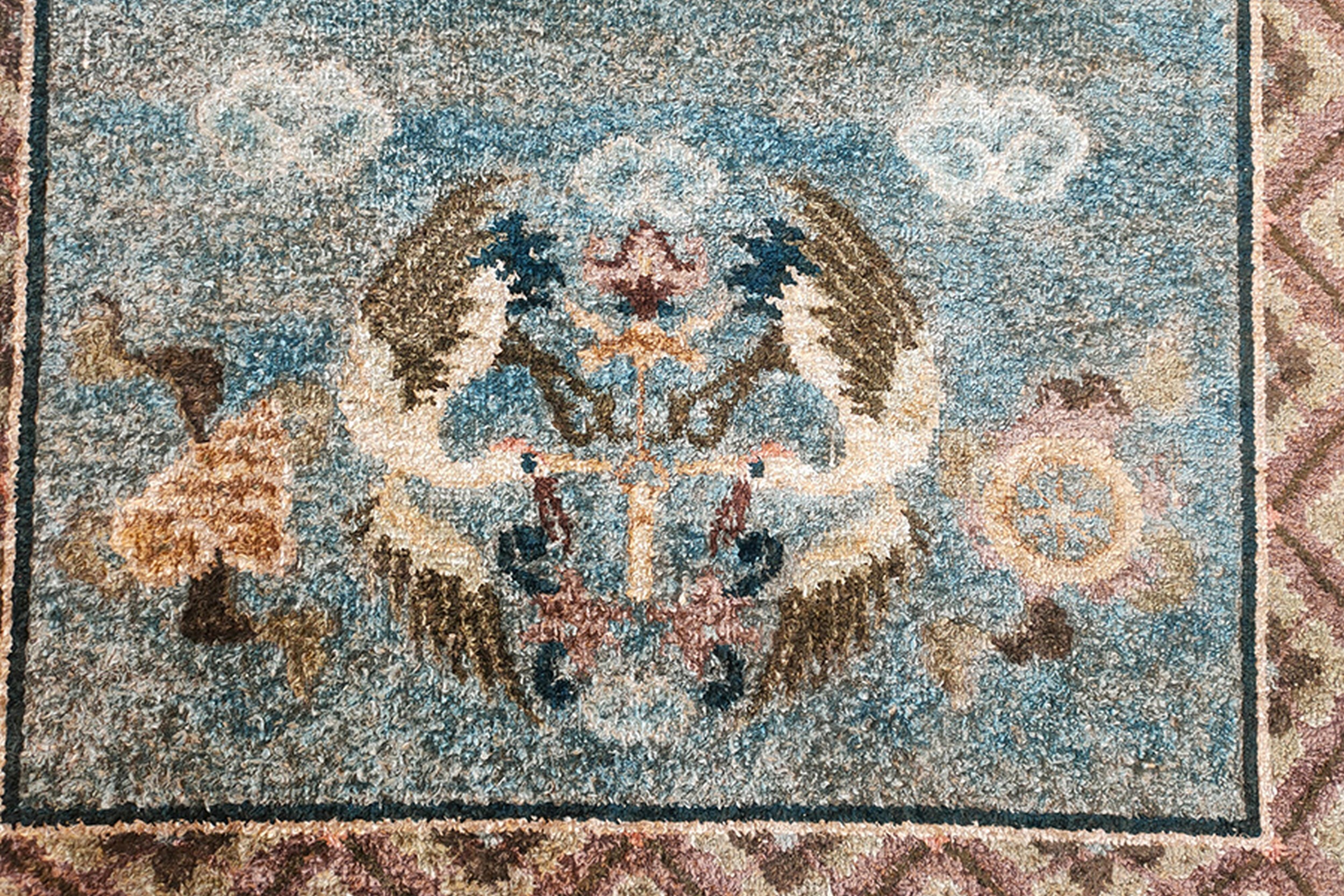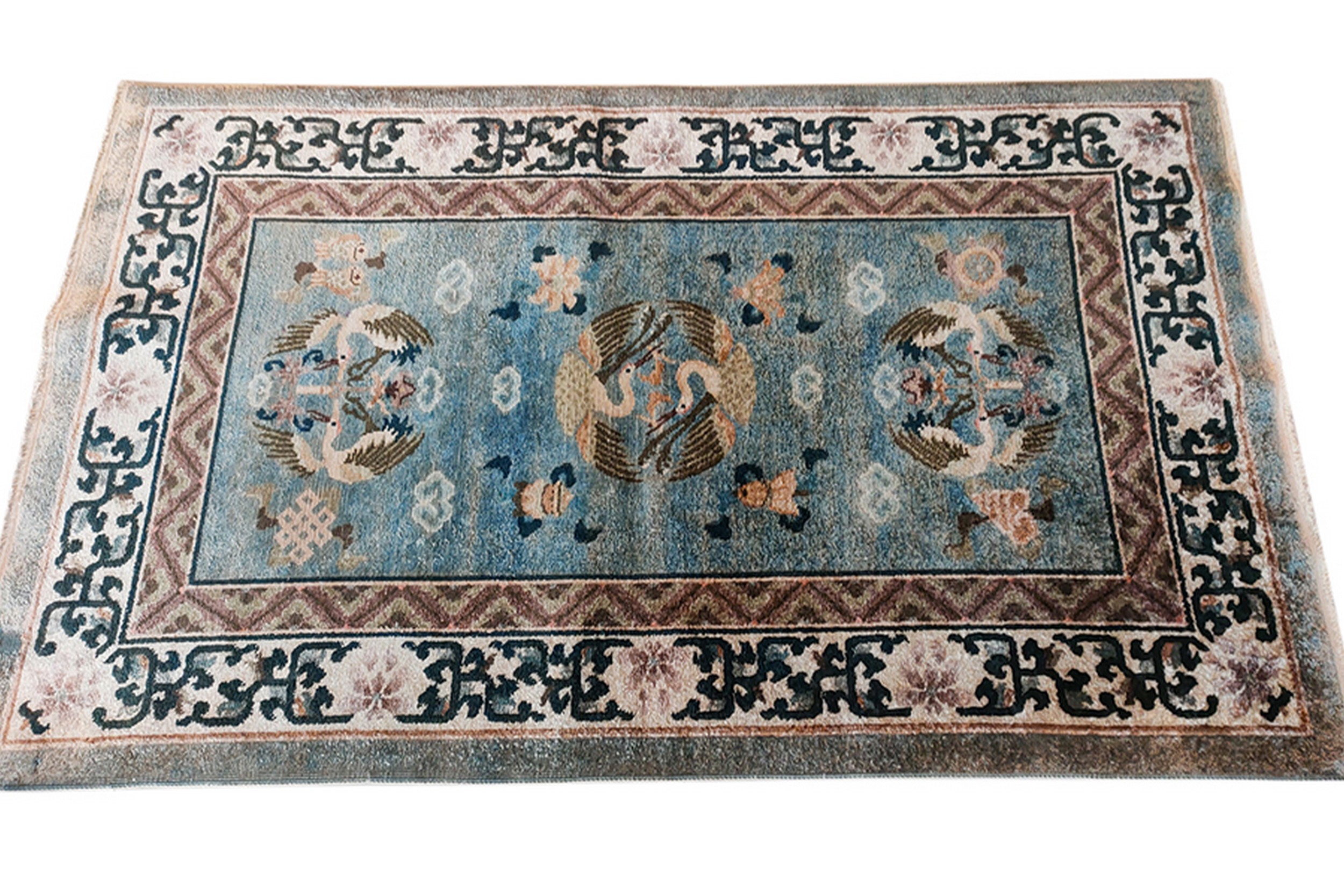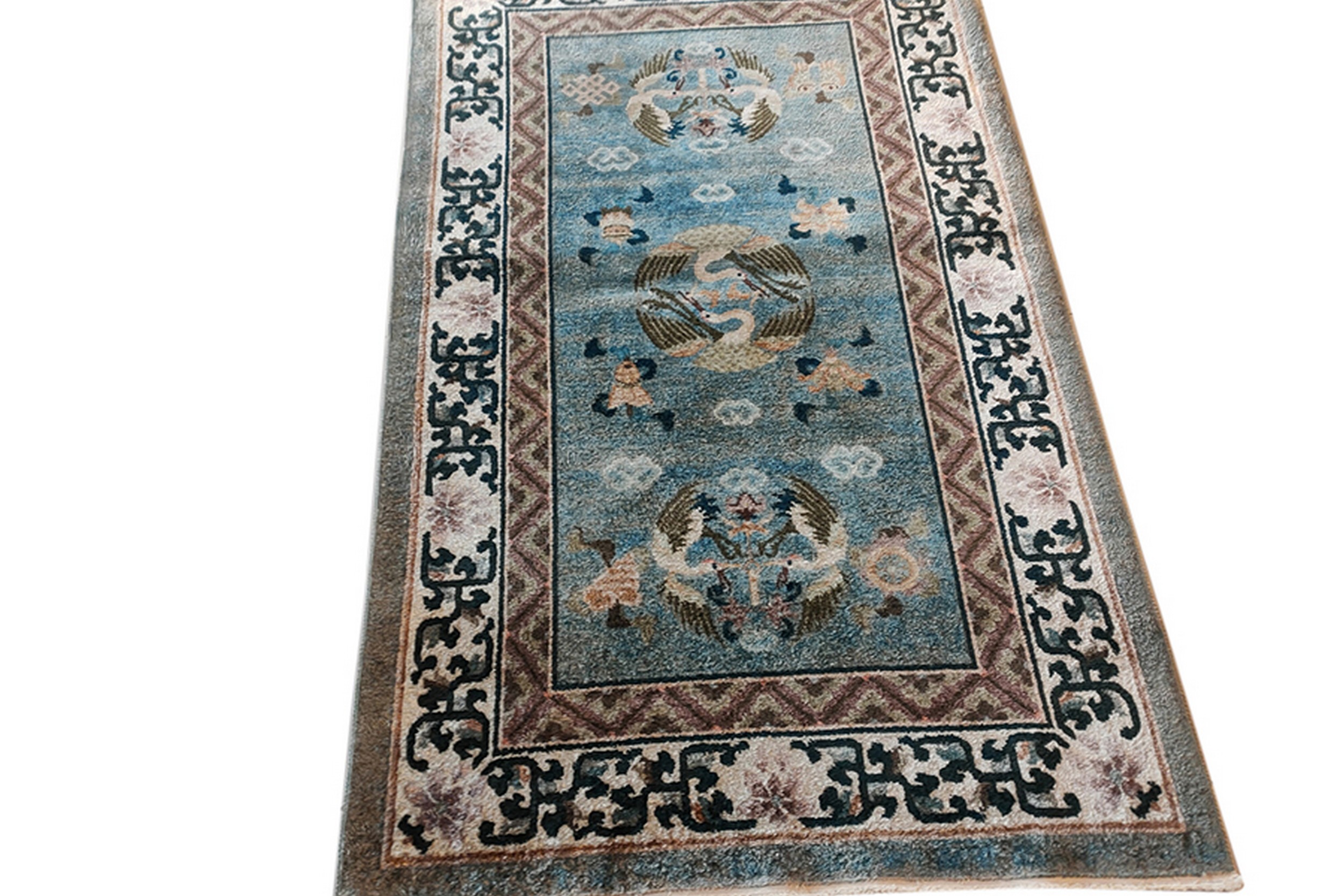 The central field is dominated by a serene, faded powder blue, providing a tranquil backdrop for the symbolic imagery. This specific shade aligns with desirable palettes found in our blue color rugs collections. Woven into the silk pile are three distinct roundels featuring pairs of stylized cranes, traditional symbols of peace and enduring grace, interspersed with floating cloud forms.