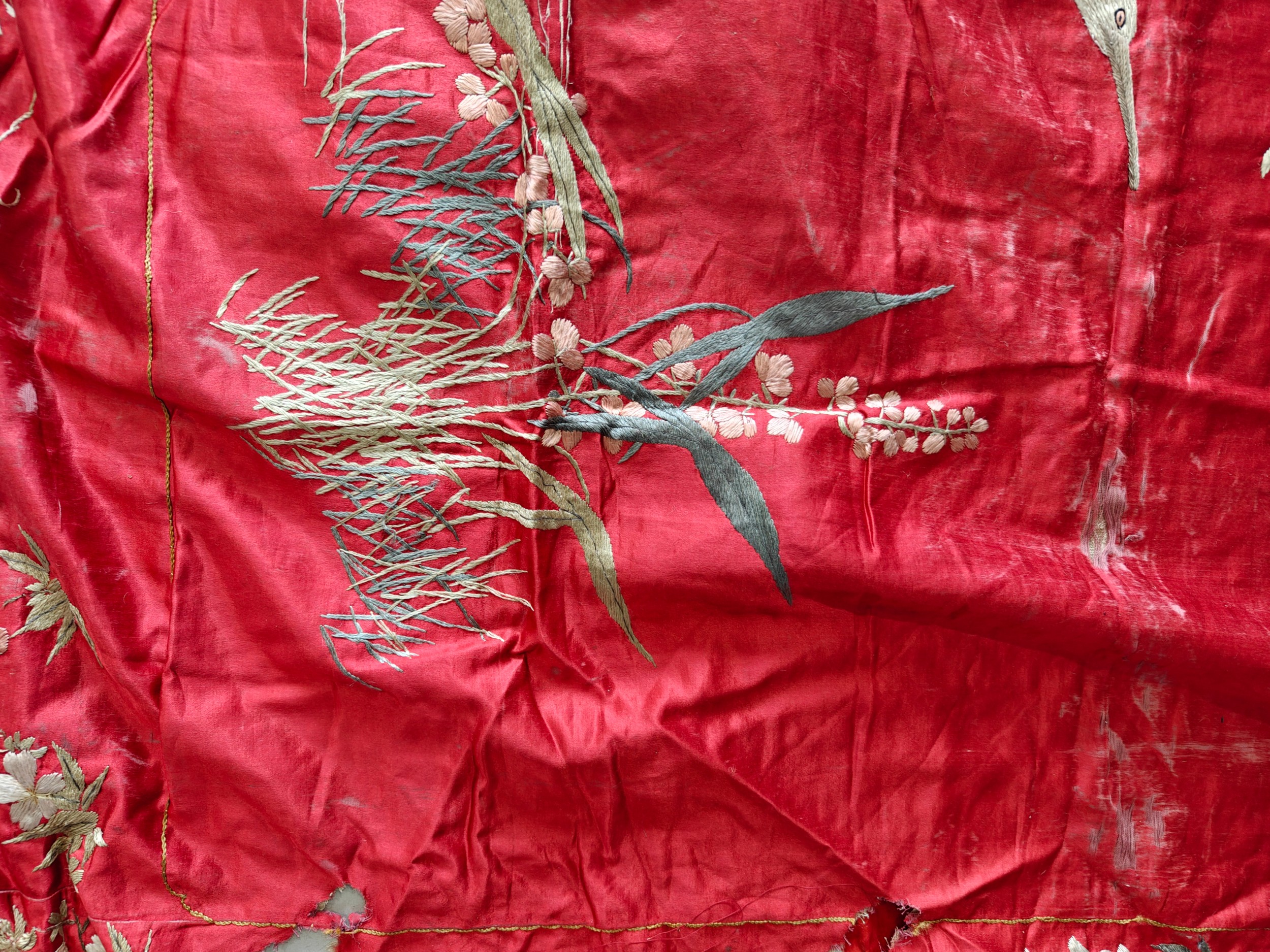 The embroidery technique is executed with masterful precision, utilizing varied stitch lengths to give texture to the crane’s feathers and the flowing petals of the chrysanthemums. This meticulous handiwork ensures that the naturalistic depiction of the flora and fauna remains crisp and highly detailed, even after a century of preservation.