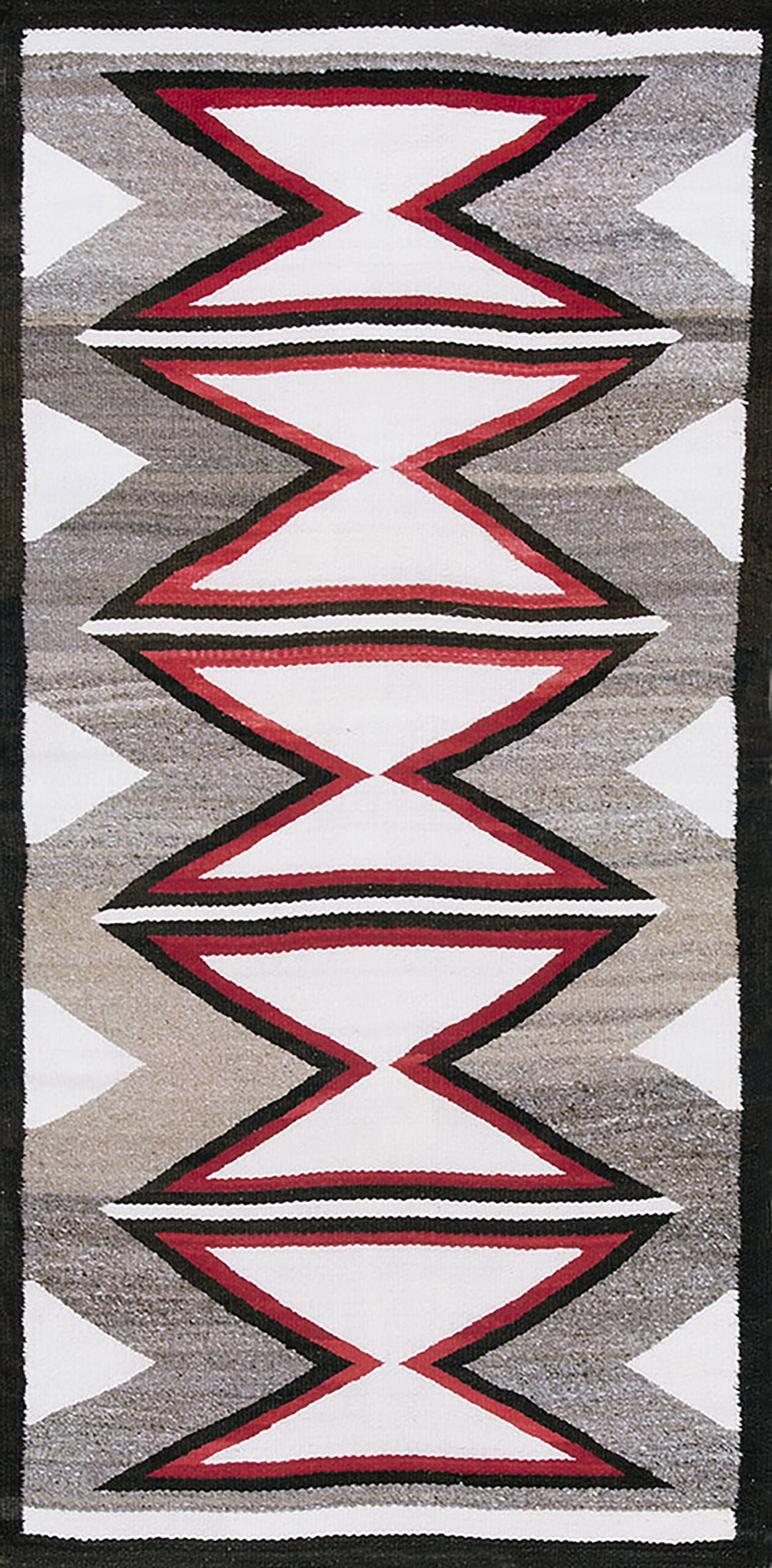 The design employs a powerful, centralized vertical axis composed of interlocking hourglass figures. These serrated diamonds create a rhythmic visual pulse that extends the length of the piece, characteristic of a dynamic allover rugs composition, despite the narrow format.