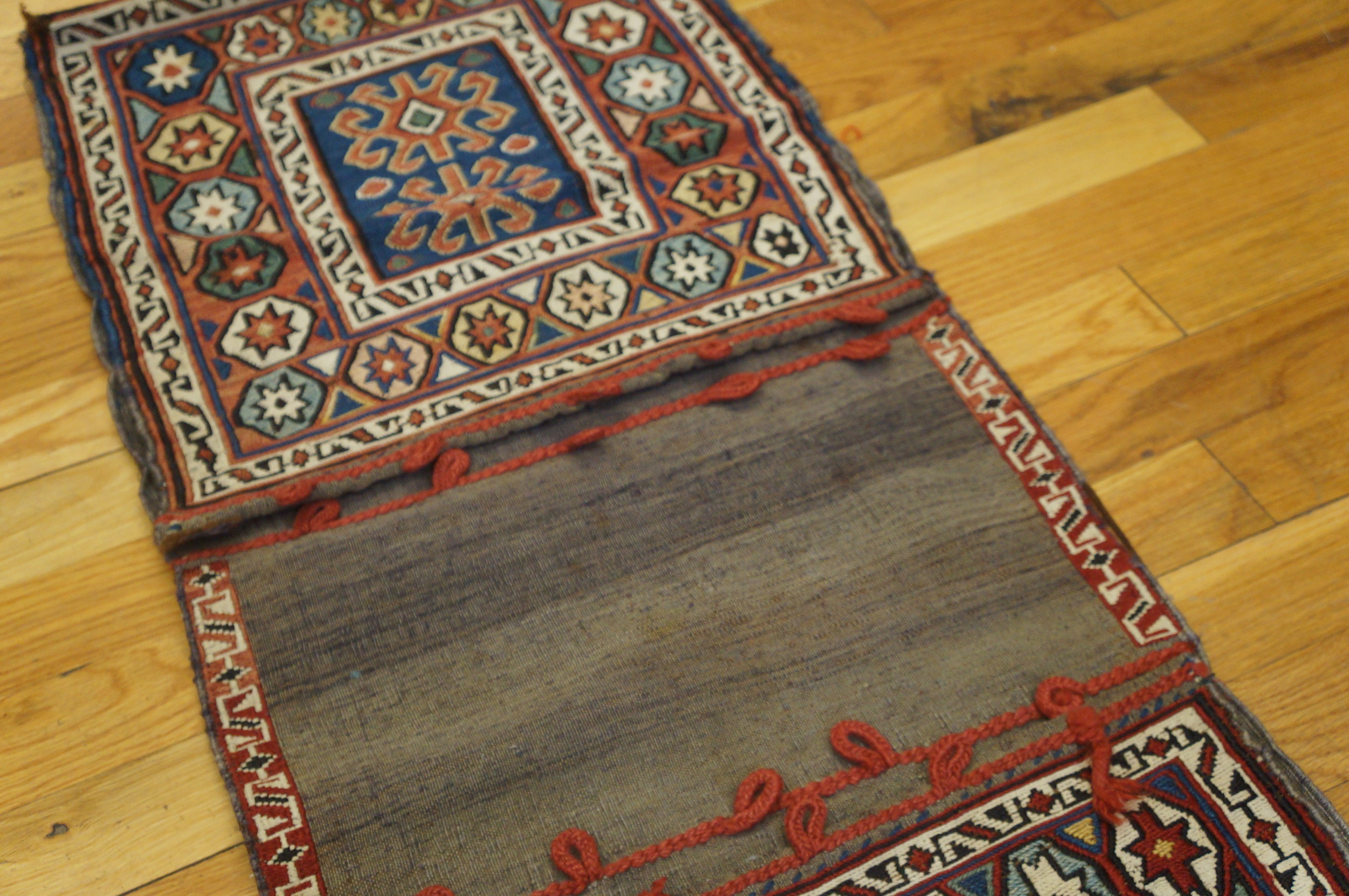 Originally woven as a specialized utilitarian textile, perhaps a saddle bag or storage sack (khorjin), the piece presents a distinctive, elongated format. Its size and robust construction make it ideal for use as a decorative wall hanging or a compelling accent piece, fitting perfectly into the category of a small scatter size textile. The unadorned central section, framed by vibrant red loops, provides a sophisticated visual break between the densely patterned end panels.