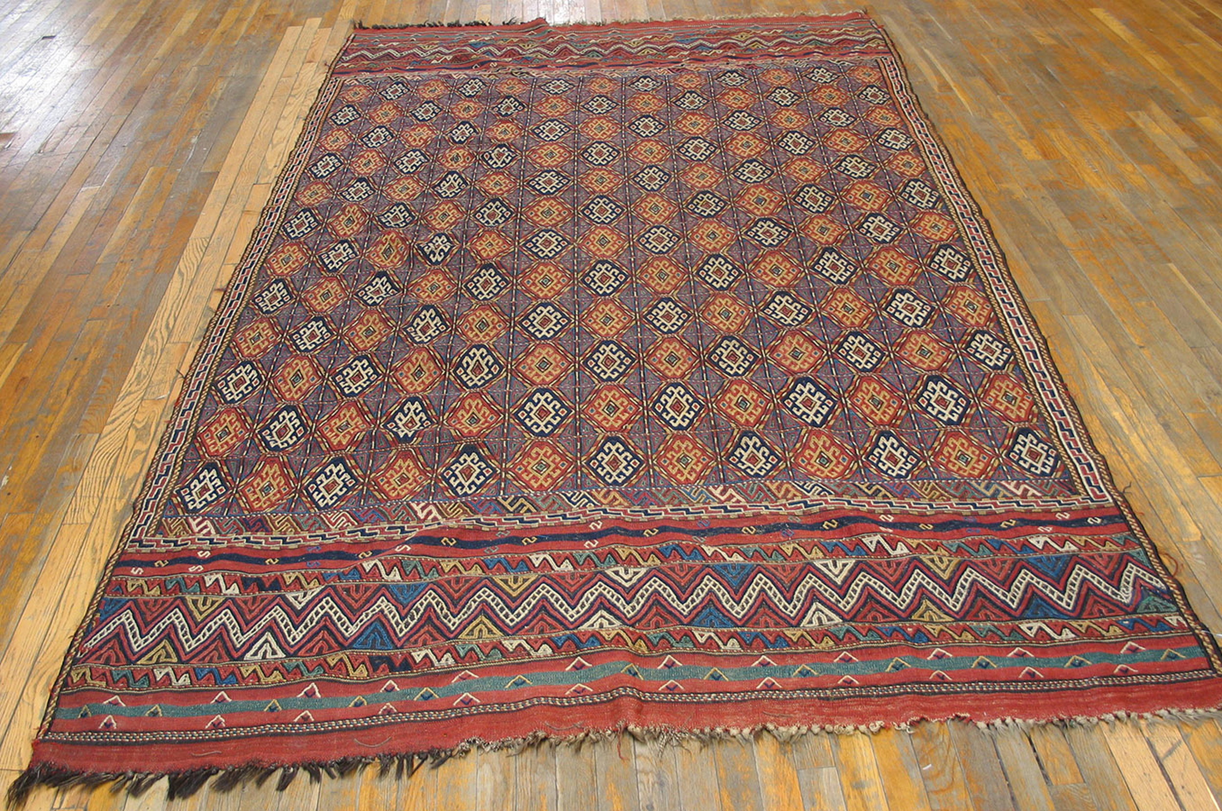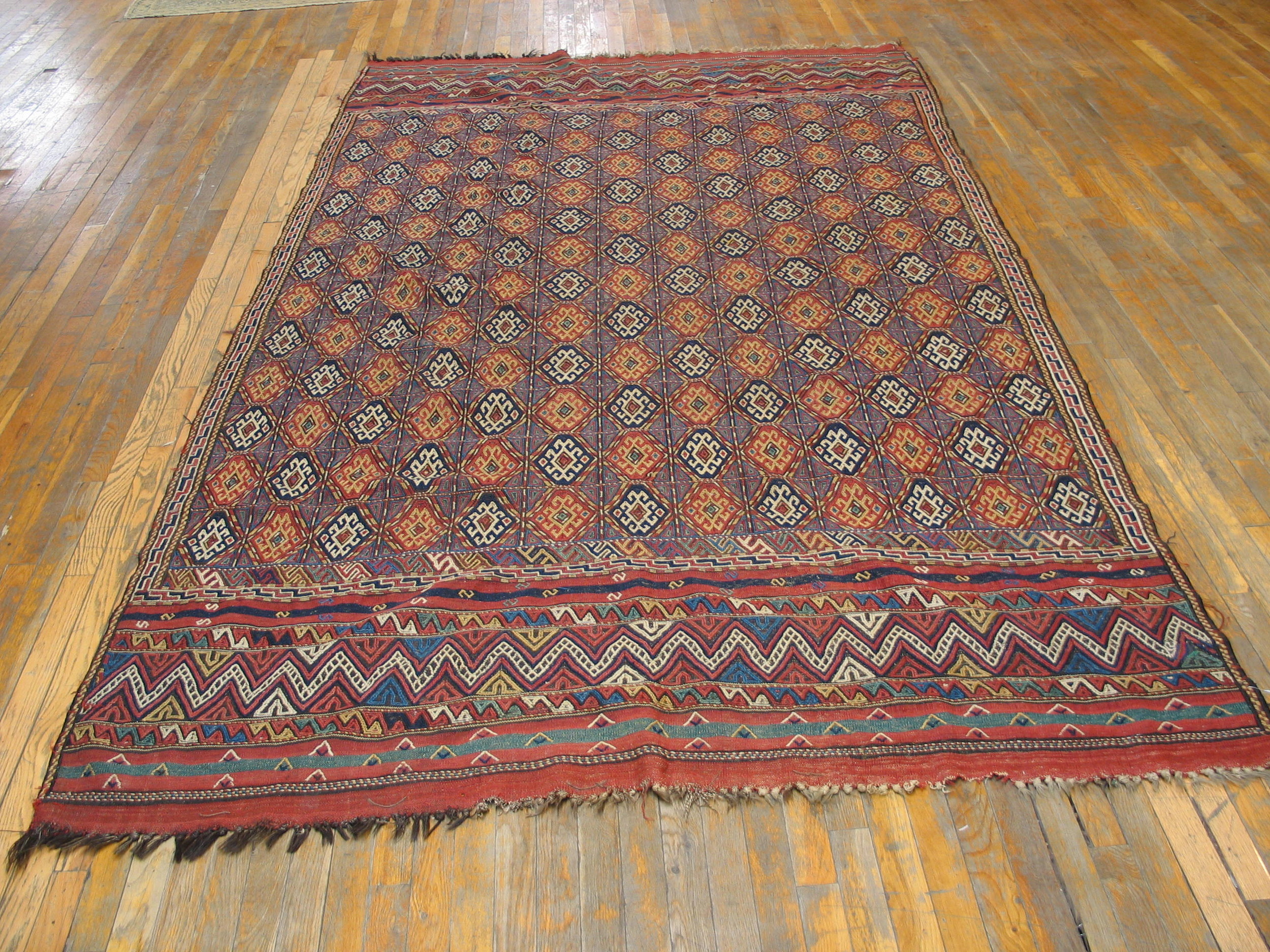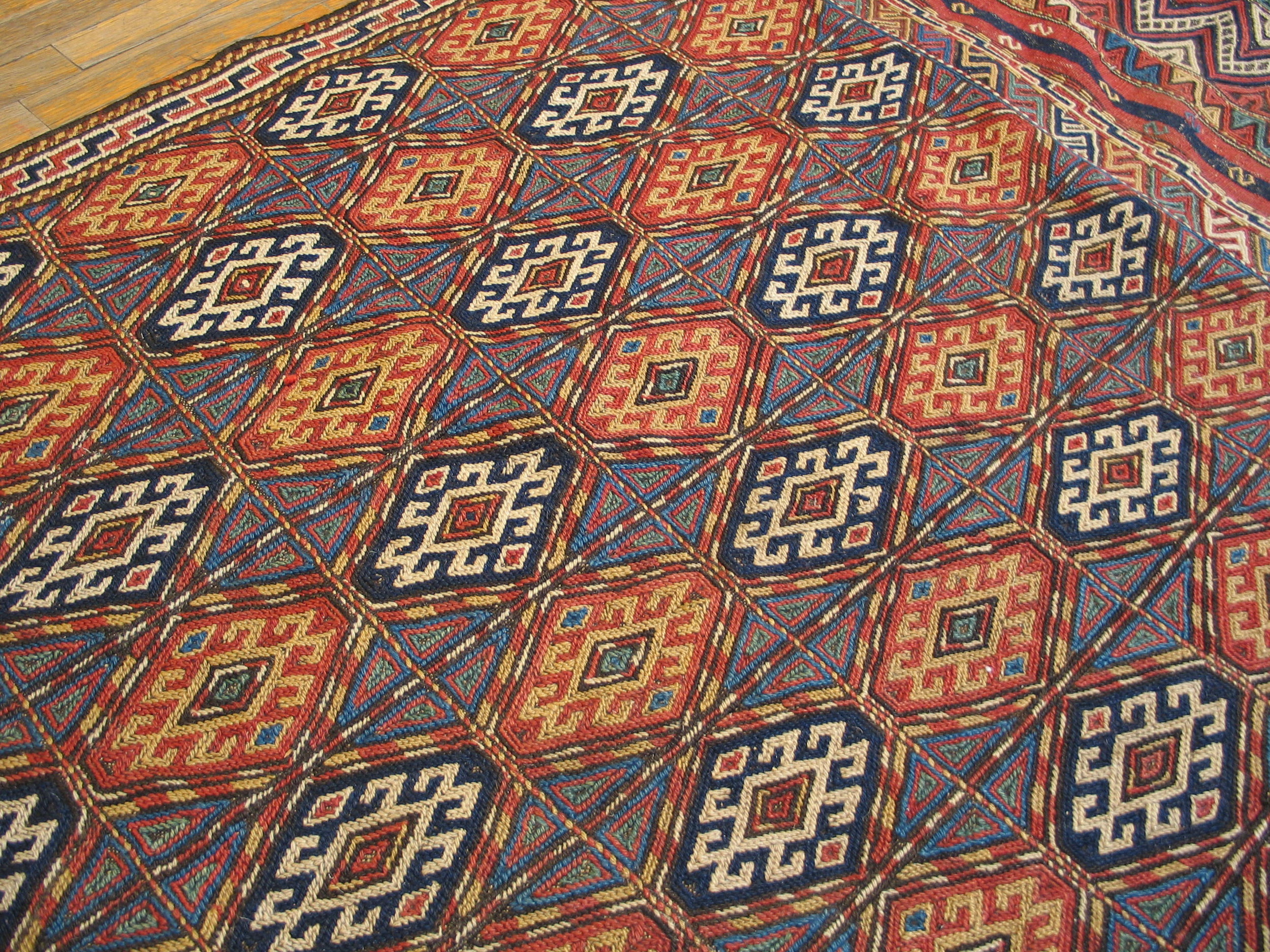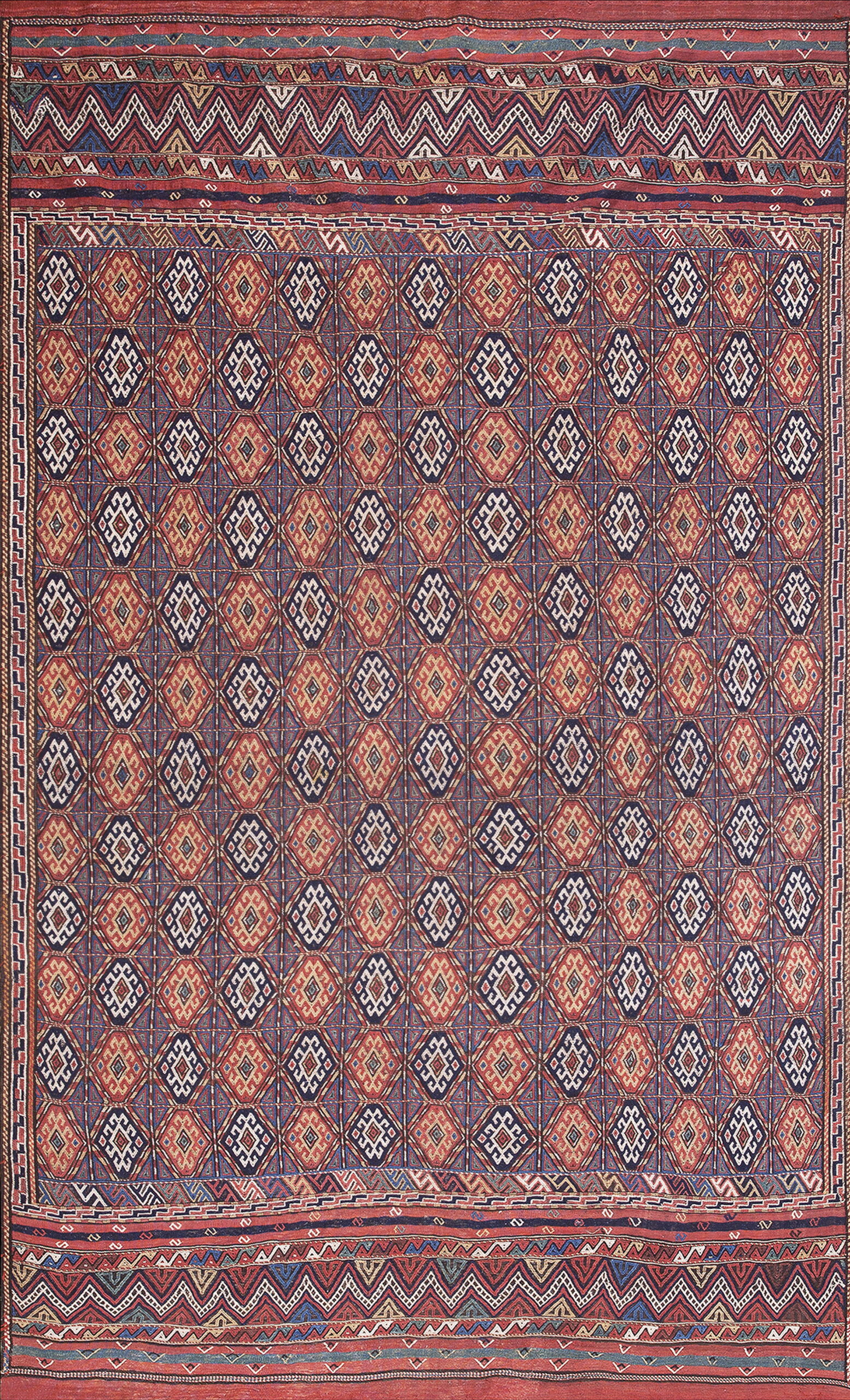 The saturated palette utilizes rich, deep hues—including indigo, madder red, and saffron yellow—creating a stunning array of multicolor jewel tones that have mellowed beautifully over a century. The field is dominated by a complex, tightly organized allover design of repeating stylized lozenges, framed by a grid structure that lends visual stability to the energetic tribal patterns.