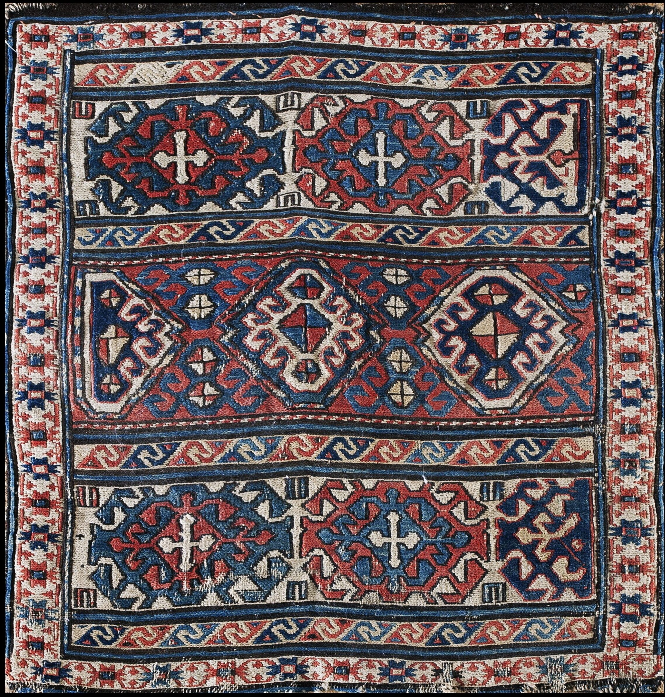 The design is characterized by bold, highly stylized geometric motifs arranged in horizontal registers. Large, cruciform medallions dominate the field, framed by intricate, serrated edges and small, powerful tribal symbols. The composition is robust and symmetrical, reflecting the traditional vernacular patterns passed down through generations of Weavers in Persia.