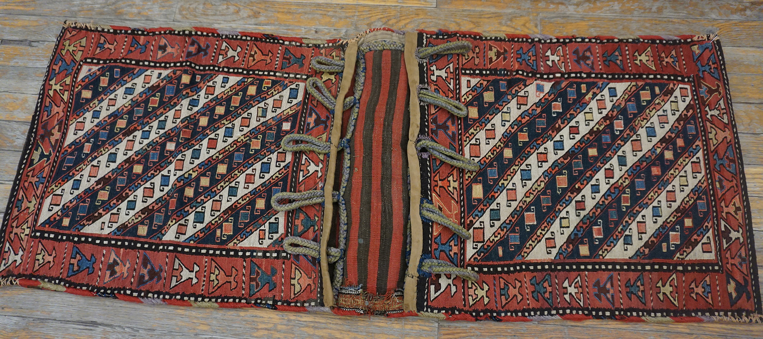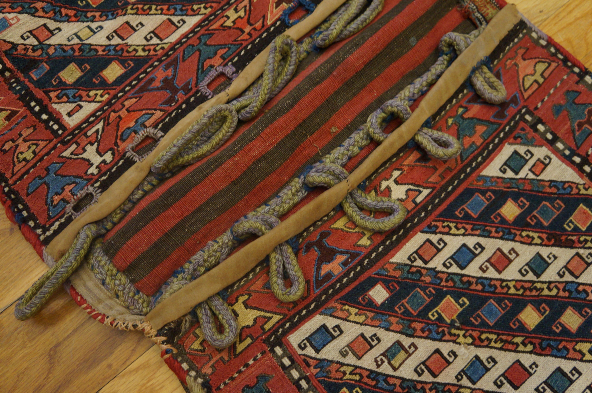 The presence of original structural elements, including braided loops and straps visible at the center, suggests this piece was originally part of a larger functional object, possibly a storage bag. Dating to the 1930s, this piece offers collectors a sophisticated, highly graphic addition to any collection of antique rugs.