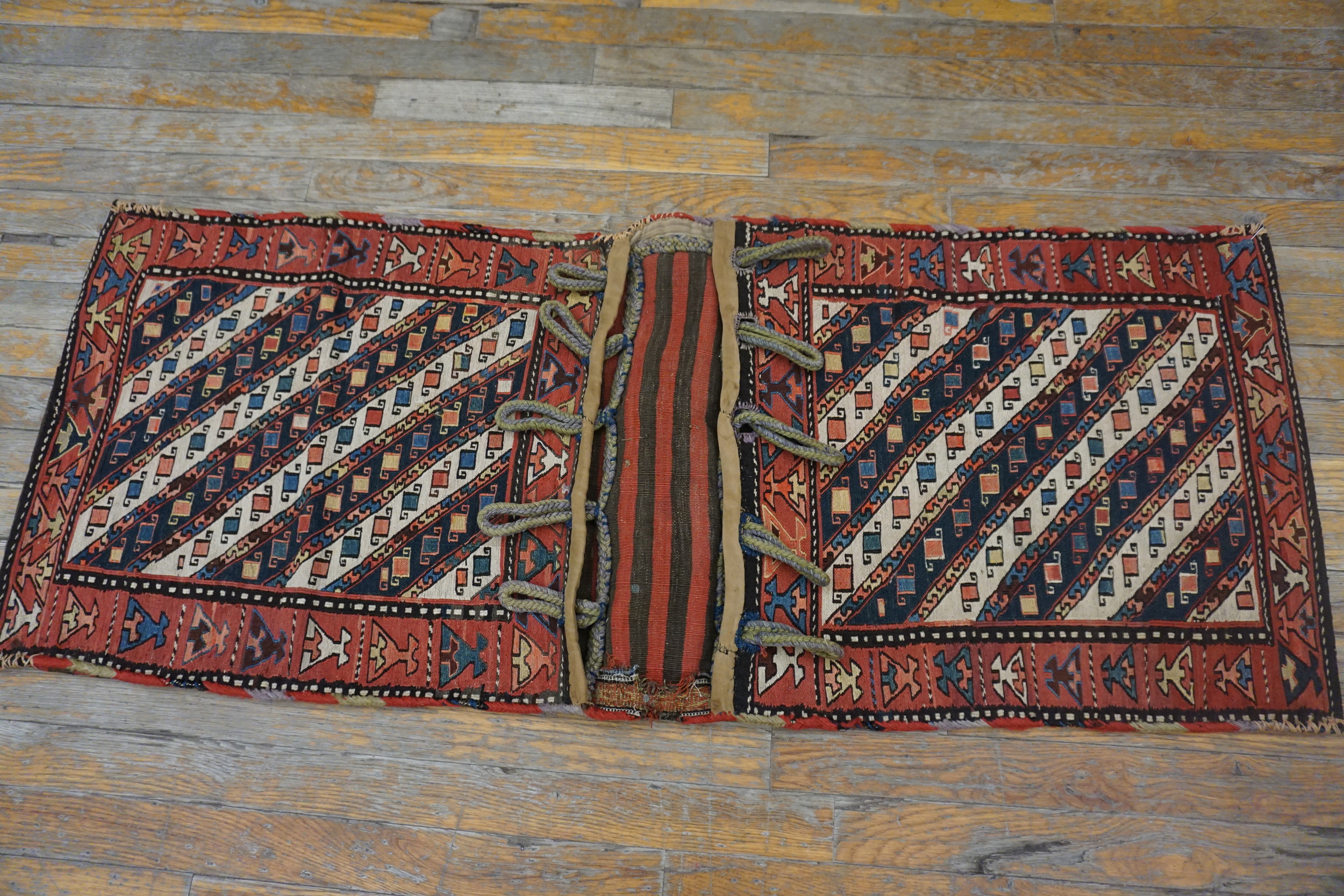 Antique Soumak Small Scatter Size Wool Rug, Country of Origin: Persia, Circa Date: 1930s. This exceptional example of soumak rugs showcases the robust, non-piled weaving technique favored by nomadic and semi-nomadic tribes. The wool construction emphasizes durability and the rich, saturated palette typical of early 20th-century tribal work.