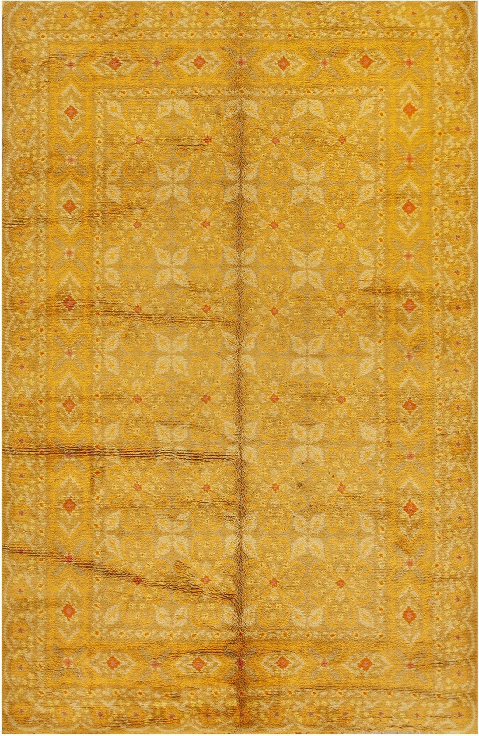 The primary field color is a luminous saffron gold, which provides immense warmth and saturation. The geometric quatrefoil motifs are rendered in a slightly muted beige and cream, creating a subtle tone-on-tone effect that prevents the overall design from becoming overwhelming. This intense yellow hue offers a vibrant contrast to cooler palettes, such as those found in green color rugs.