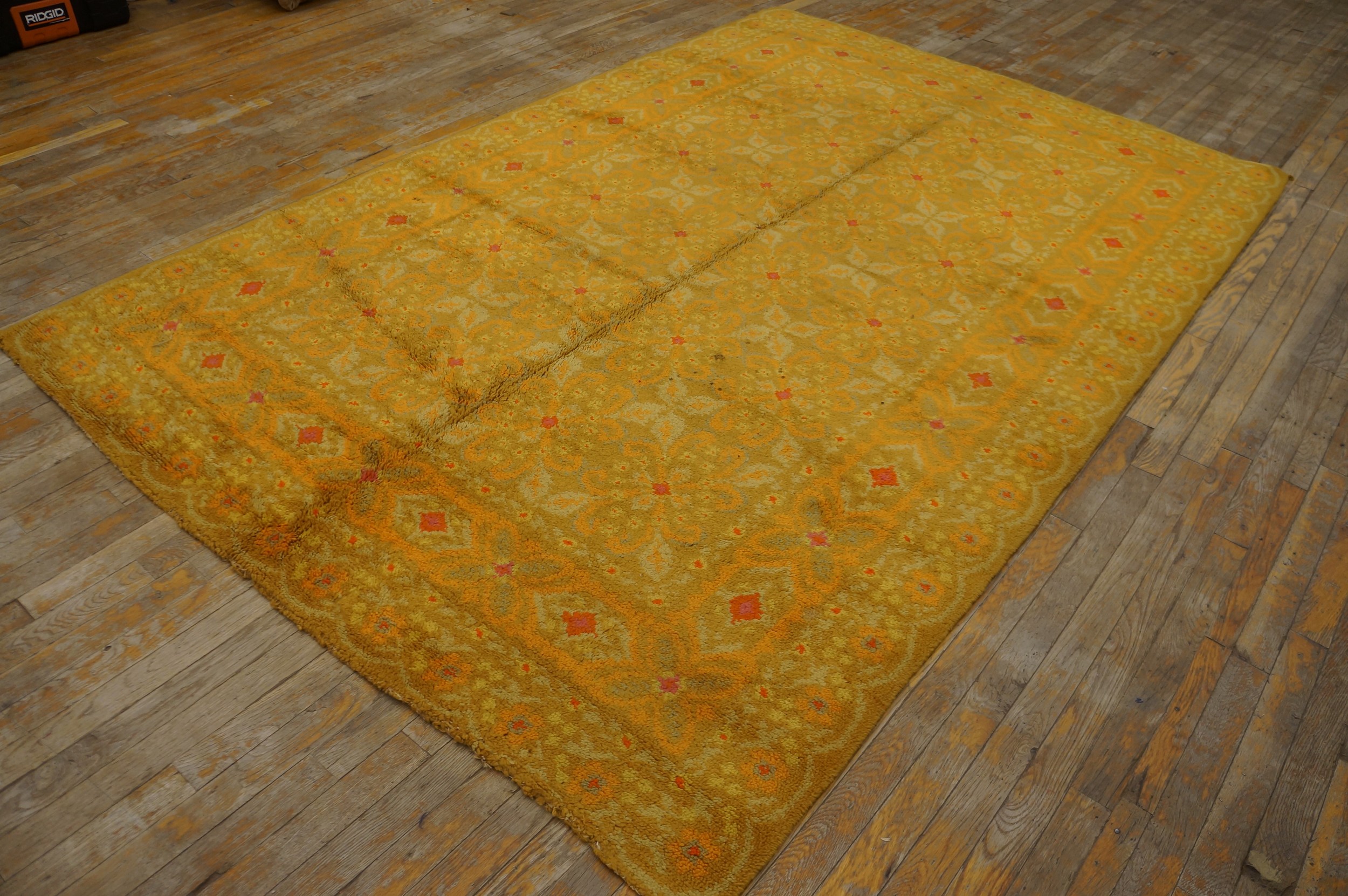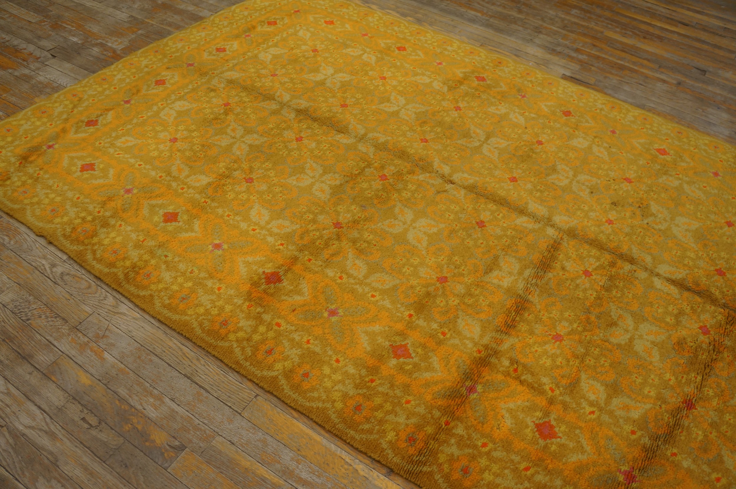 Antique Spanish Carpet Spanish Allover Geometric Knotted Rug, Circa Date: 1940s. This striking Spanish carpet exemplifies the bold color choices and geometric precision favored in mid-century European design. Its allover pattern, executed in a dense, knotted pile, offers a sophisticated textural element rarely found in contemporary floor coverings. This piece is a fine example of our curated collection of antique rugs.