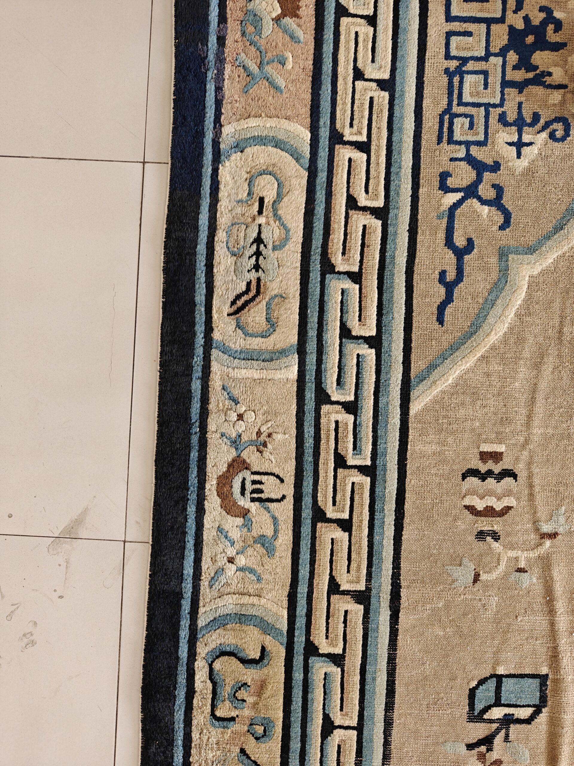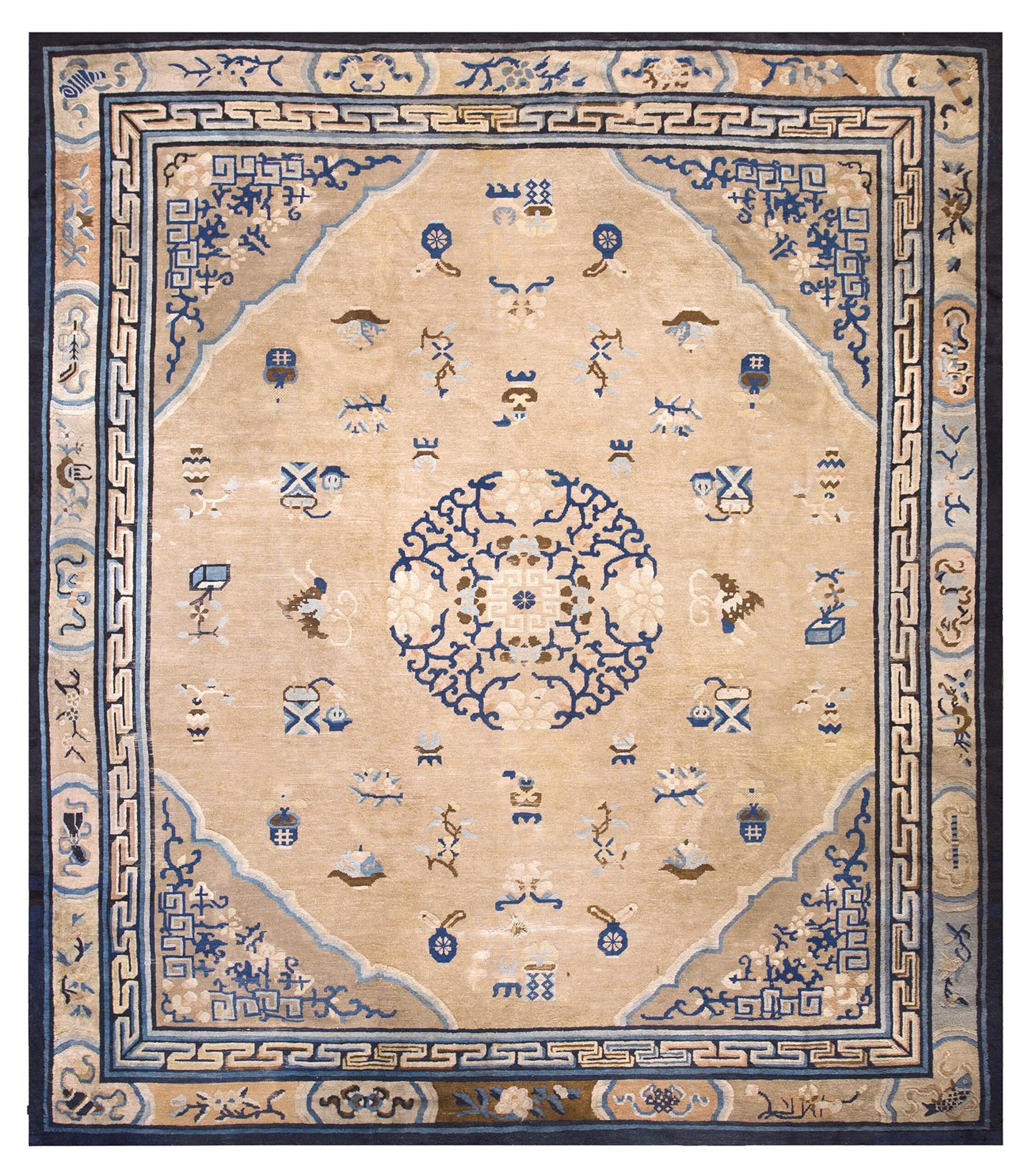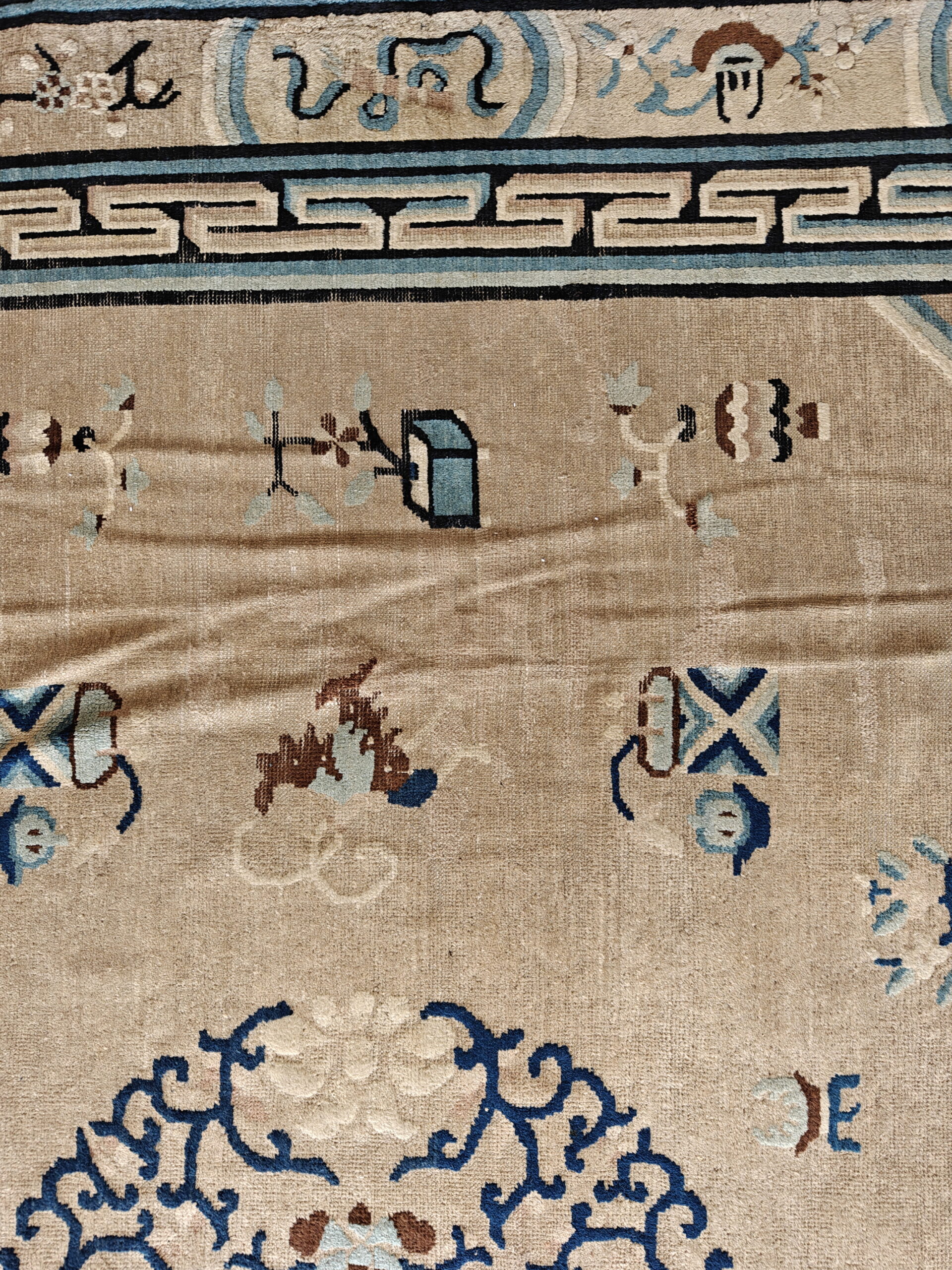 The primary field color is a refined, luminous earth tone, providing a warm contrast to the striking indigo and powder blue accents. This subtle coloration allows the scattered auspicious symbols—including vases, scrolls, and stylized clouds—to float gracefully across the surface. The masterful application of natural dyes creates a patina that defines the finest brown earth tone color rugs.
