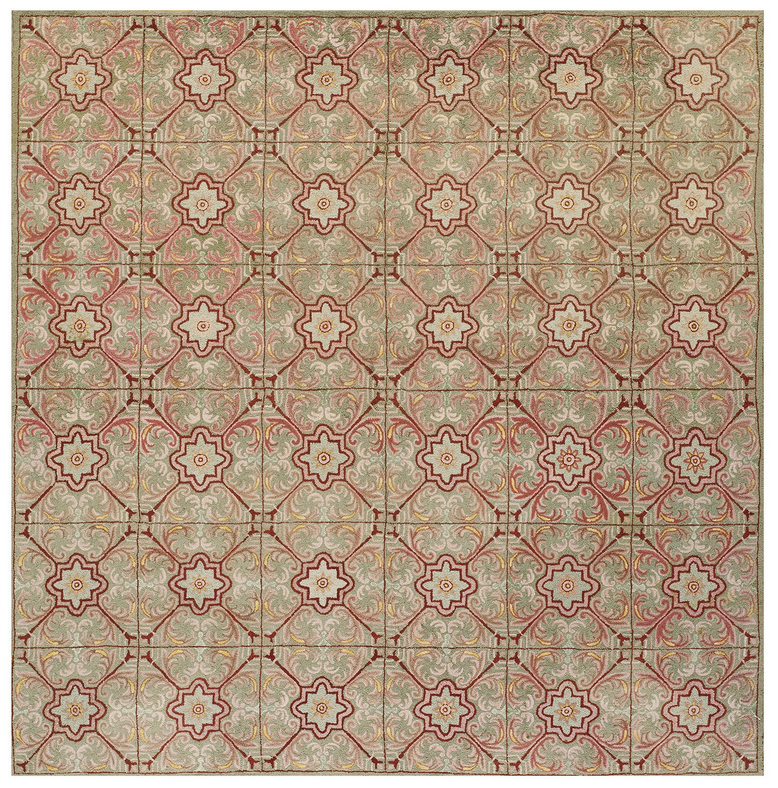The palette is masterfully restrained, utilizing a soft celadon green as the primary ground, contrasted by detailed motifs rendered in muted rose, burgundy, and pale gold accents. This harmonious blend creates a gentle, yet complex, multicolor jewel tone rugs effect that speaks to the sophistication of early 20th-century American textile preferences.
