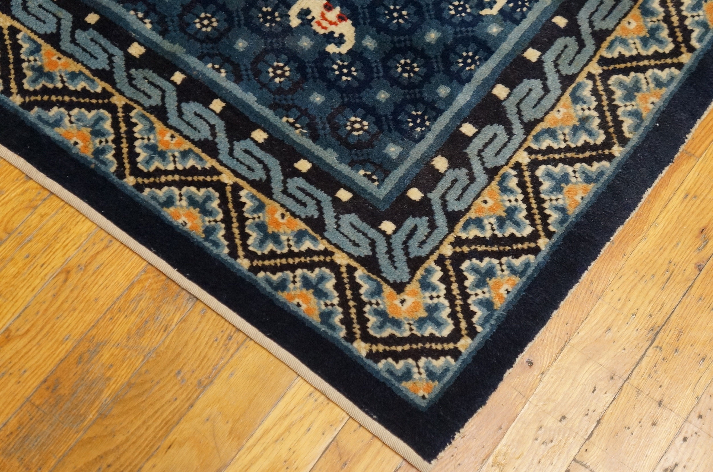 Antique Chinese – Ningxia Chinese Blue 1900s Rug, Circa Date: 1900s. This exquisite example of Chinese weaving tradition showcases the distinct aesthetic of Ningxia pieces from the early 20th century. The foundation is saturated in a profound indigo, characteristic of the finest blue color rugs from this region, providing a dramatic backdrop for the stylized motifs.