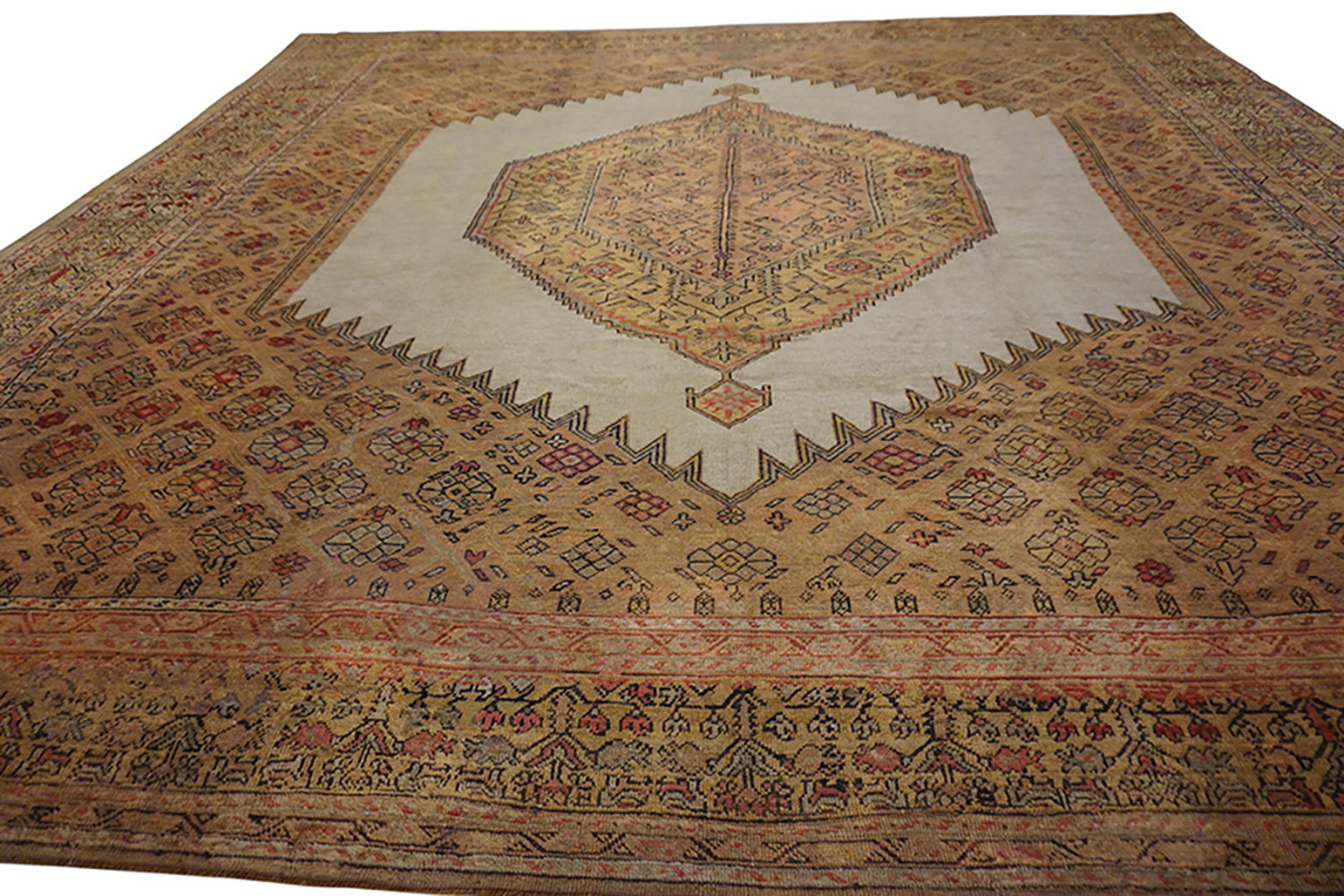 The palette is remarkably sophisticated, centering around a luminous field of ivory beige cream white which provides a striking contrast to the warm, earth-toned terracotta and sienna hues of the main border and spandrels. The subtle variations in tone, achieved through the use of natural dyes, have resulted in a beautiful patina, softening the overall effect and enhancing the depth of the hand-knotted wool.